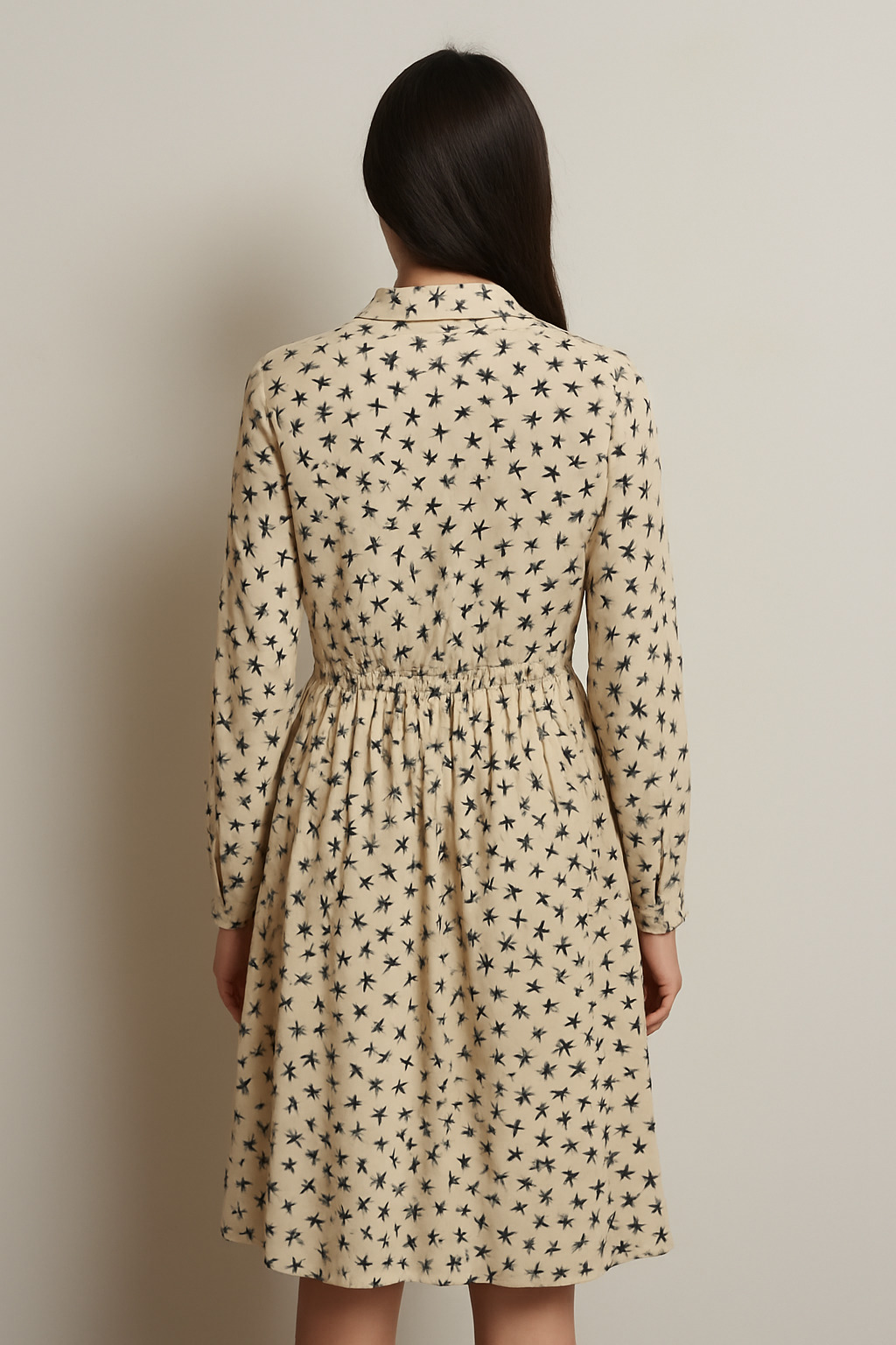 A charming blend of comfort and elegance, this beige shirt dress features a playful all-over bee motif print. Designed with a structured shirt collar and button-down front, it includes twin chest pockets for added detail. The gathered waist gives a flattering silhouette while the full sleeves and soft cotton fabric ensure comfort all day long. Perfect for casual outings, brunch dates, or a relaxed workday look.