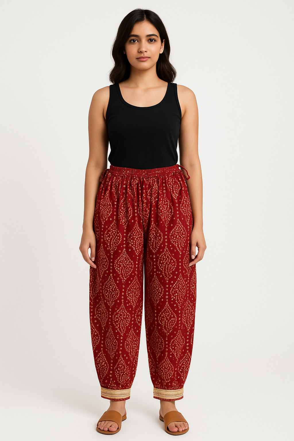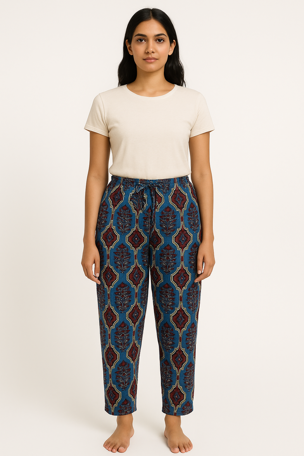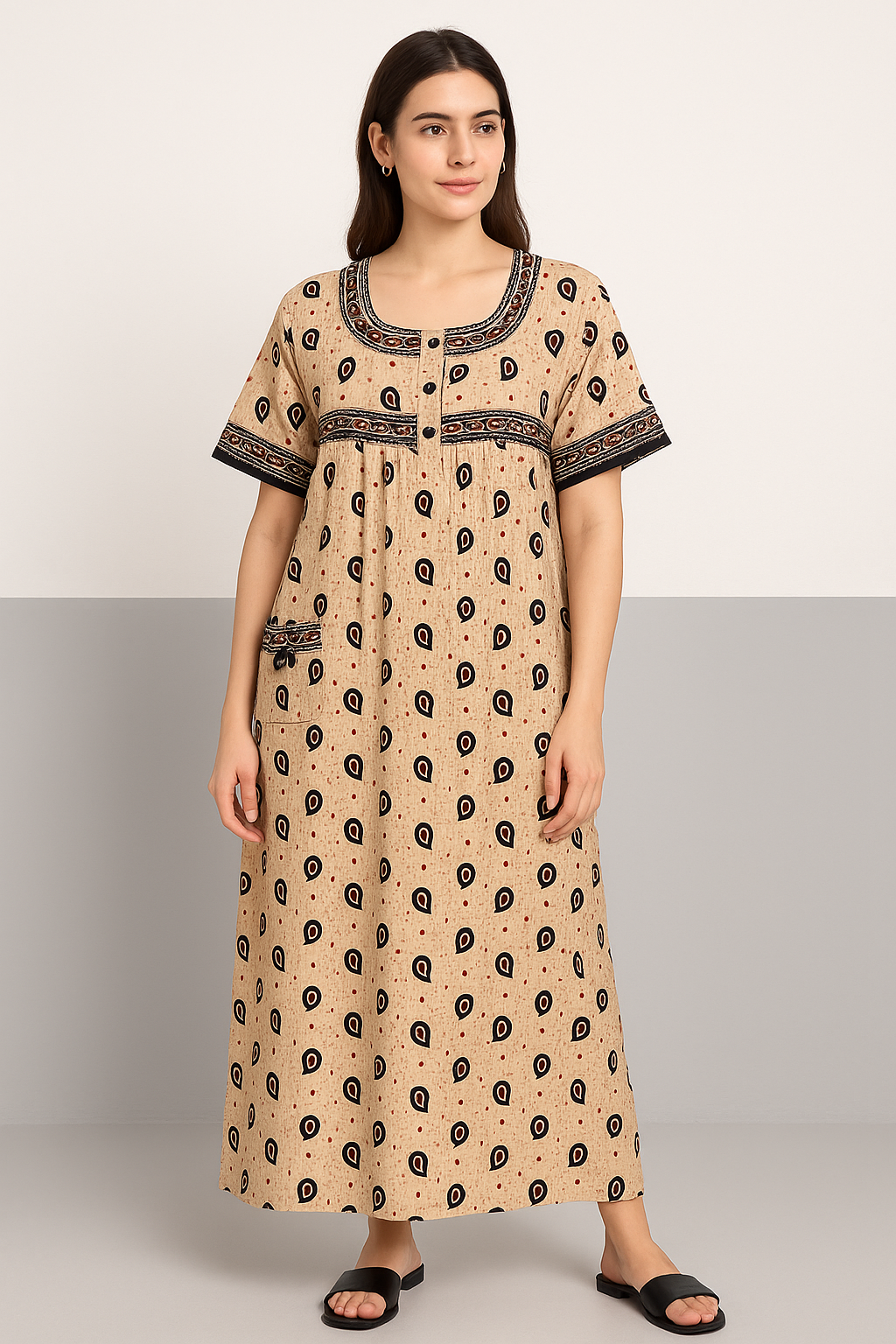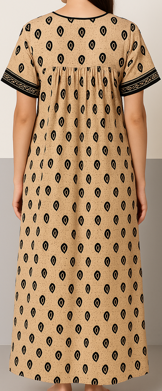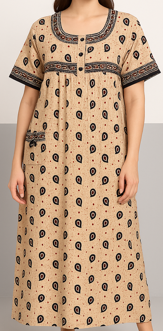 This elegant ankle-length nightdress is crafted from soft, breathable beige cotton and features an all-over black paisley drop motif. The short sleeves and yoke are adorned with contrasting black borders, adding a traditional touch. A rounded square neckline with printed detailing and button accents enhances the front design, while gentle gathers under the yoke provide a relaxed, flowy fit ideal for lounging or bedtime comfort. Finished with a practical side pocket, this nightdress blends functionality with ethnic flair.
