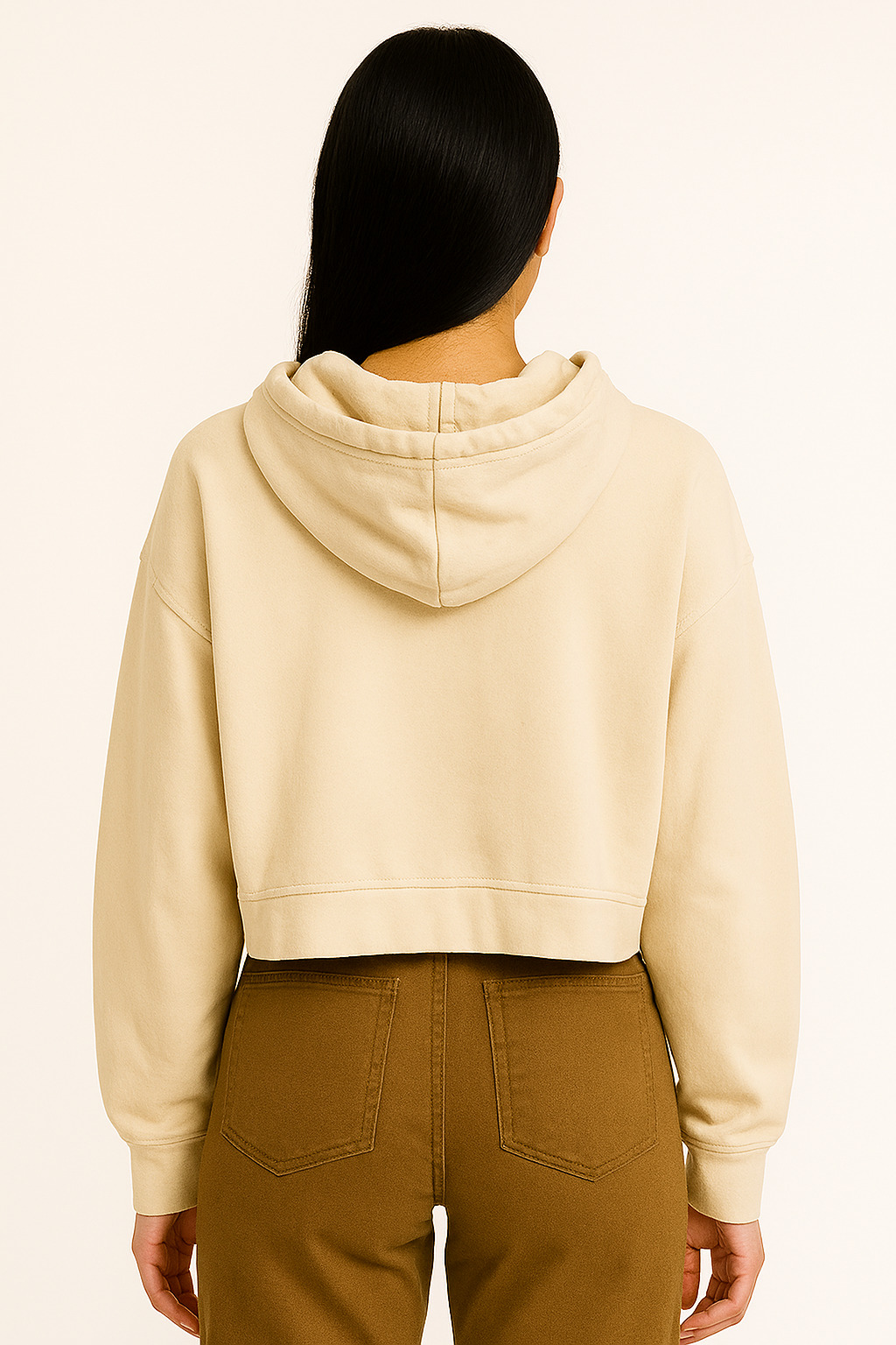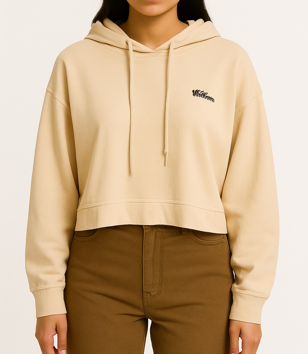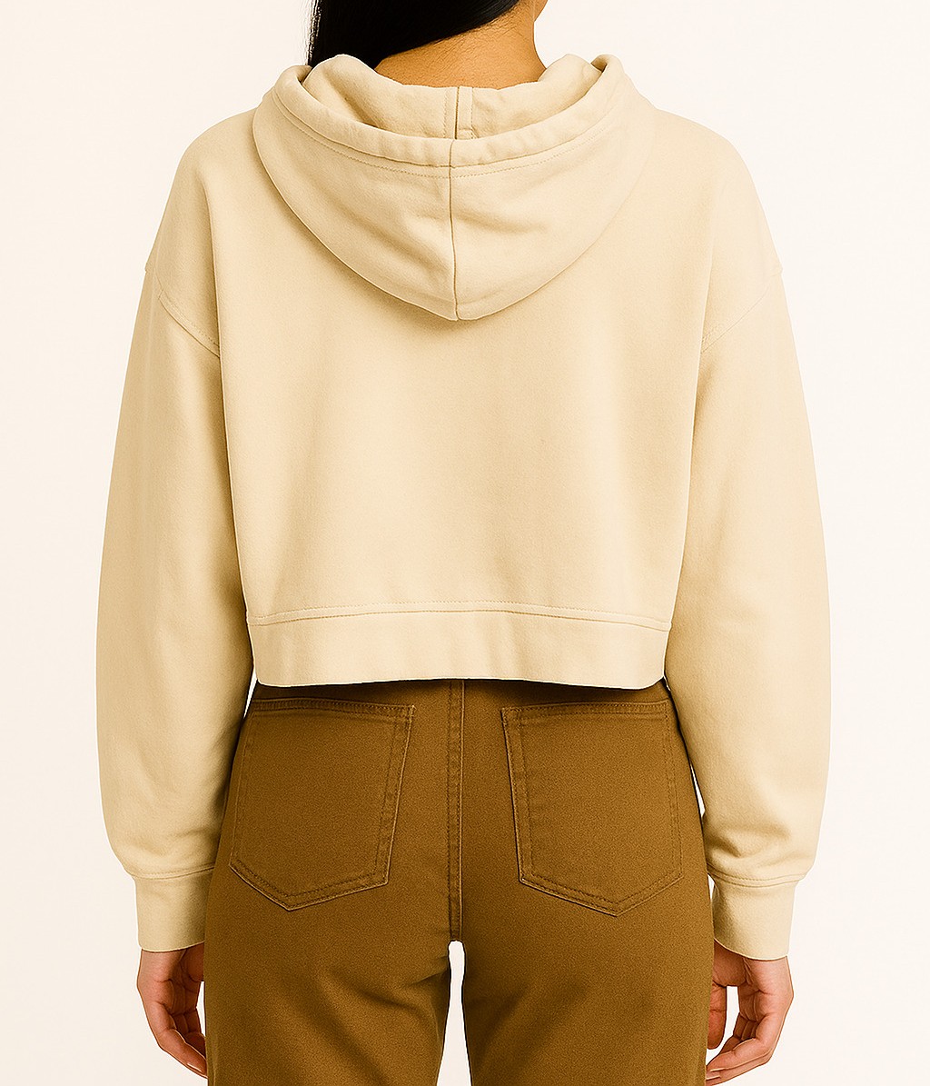This women’s cropped hoodie in a soft beige tone is a perfect blend of comfort and street style. Crafted from cozy cotton-blend fleece, it features a relaxed silhouette with dropped shoulders, a drawstring hood, and ribbed cuffs. The front is adorned with a minimal embroidered script logo for a subtle branding touch. Ideal for layering or solo wear, this piece pairs effortlessly with high-waisted jeans or joggers for a casual, put-together look.
