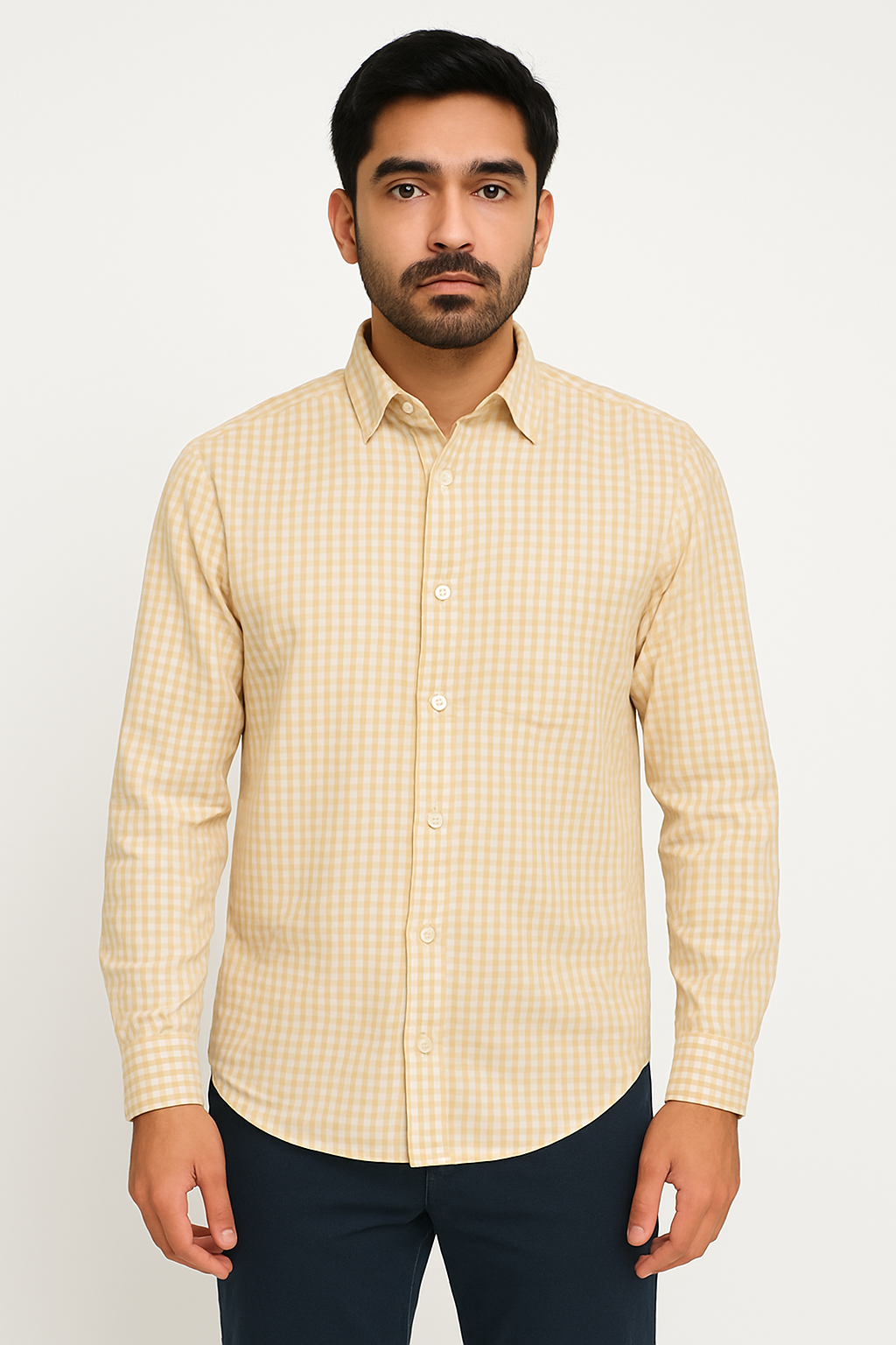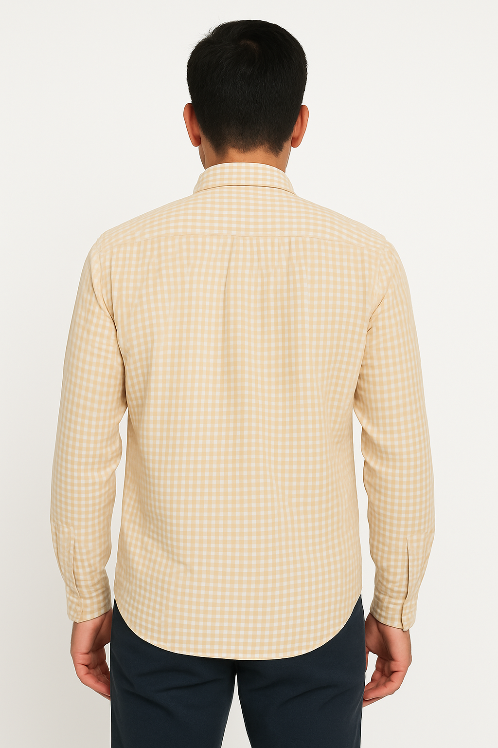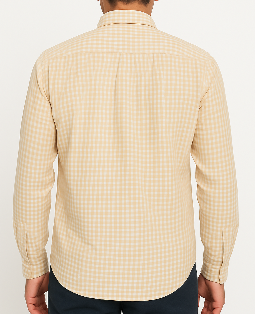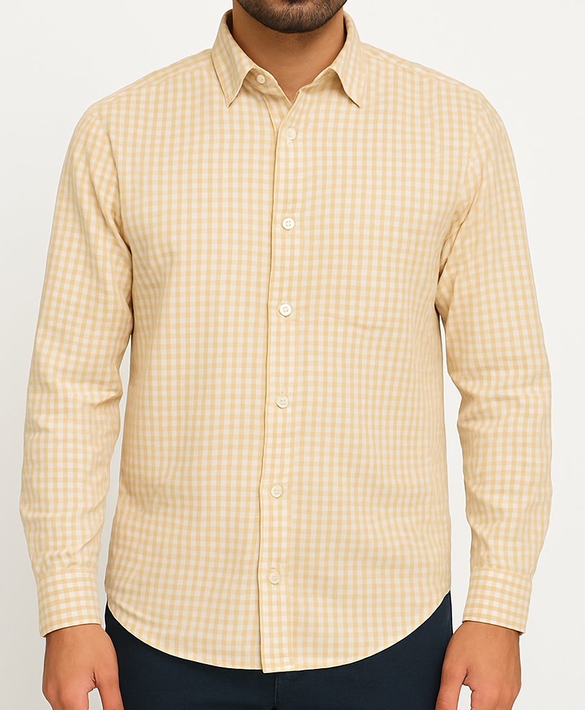 Elevate your smart-casual wardrobe with this beige gingham checkered shirt crafted from breathable cotton fabric. Featuring a classic spread collar, full button placket, and full sleeves, this shirt delivers comfort and versatility. Its soft check pattern adds a timeless appeal, making it ideal for both office wear and relaxed outings. The back yoke and box pleat offer structured movement, while the curved hem ensures a flattering fit whether tucked in or out.