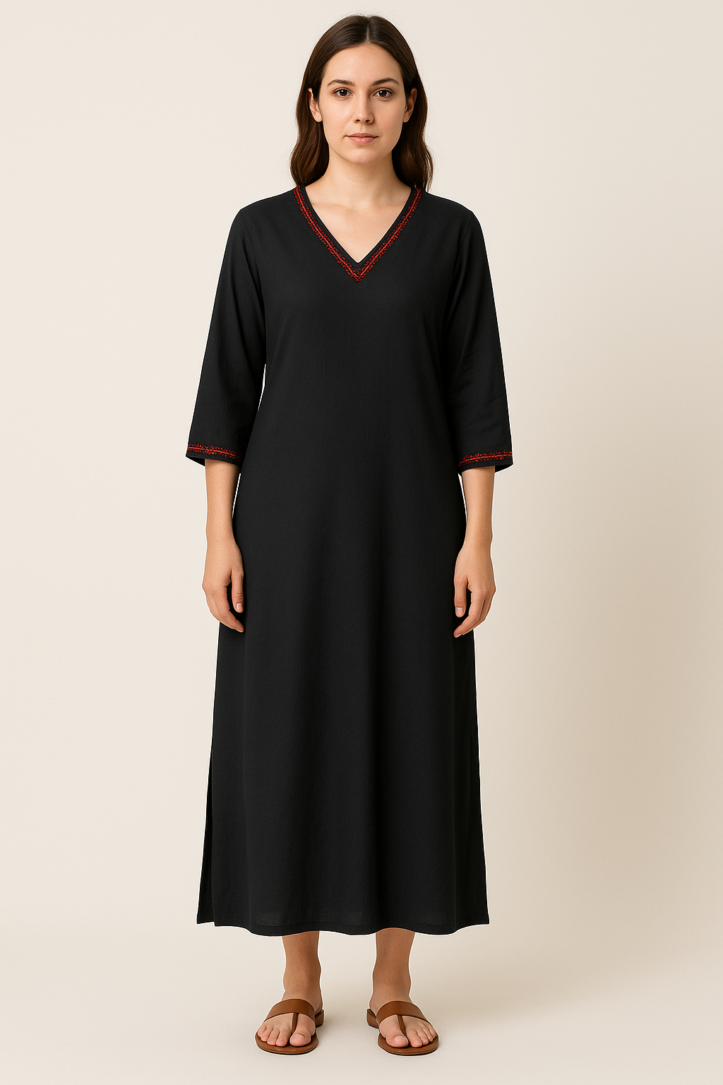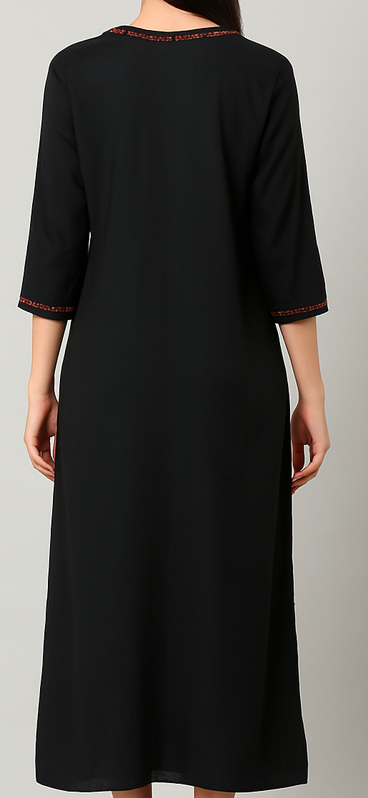 This elegant black A-line kurti is crafted from a smooth and breathable fabric, perfect for everyday wear or casual outings. The highlight of the design is its intricate red embroidery along the V-neckline and sleeve cuffs, adding a refined ethnic charm. Featuring a 3/4 sleeve length and calf-grazing silhouette, it offers a relaxed yet flattering fit. Ideal to pair with leggings, palazzos, or straight pants for a complete look.
