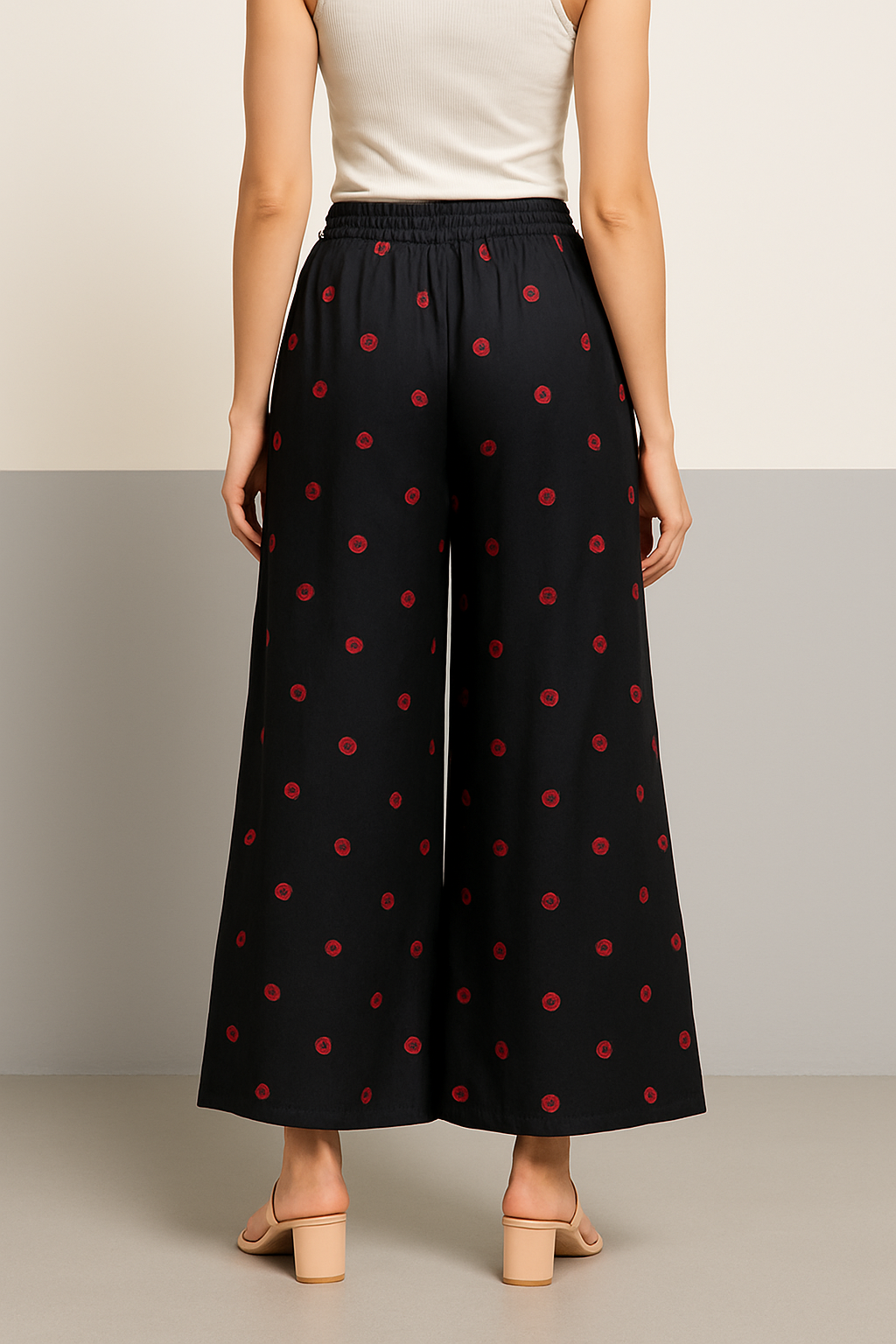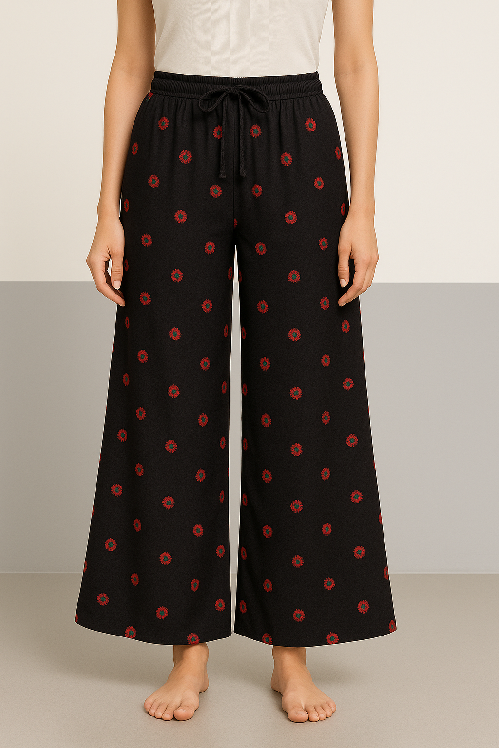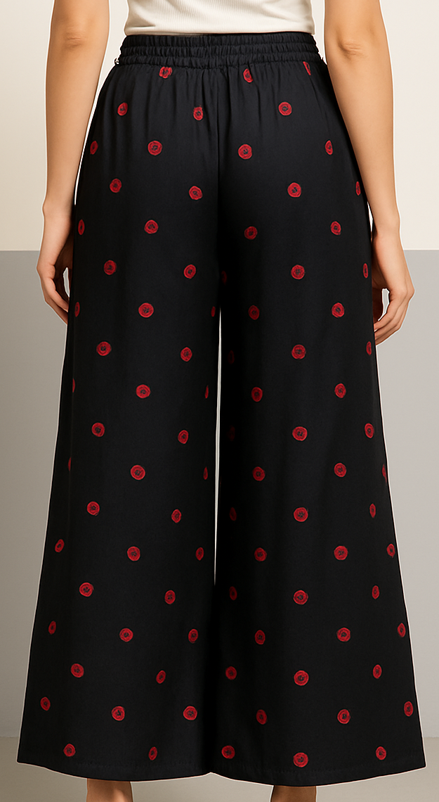 Elevate your casual wardrobe with these chic black wide-leg pants adorned with delicate red embroidered floral motifs all over. Crafted from a soft, breathable fabric, these pants feature a relaxed silhouette with a flowy drape. The waistband is elasticated at the back for comfort and fitted with a front drawstring for adjustability. With their ankle-grazing length and statement prints, these pants effortlessly blend style with ease, making them perfect for lounging or stepping out in laid-back elegance.
