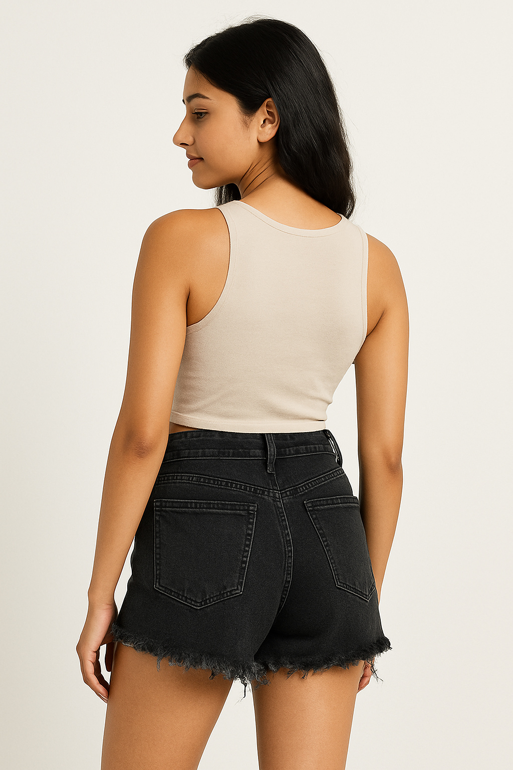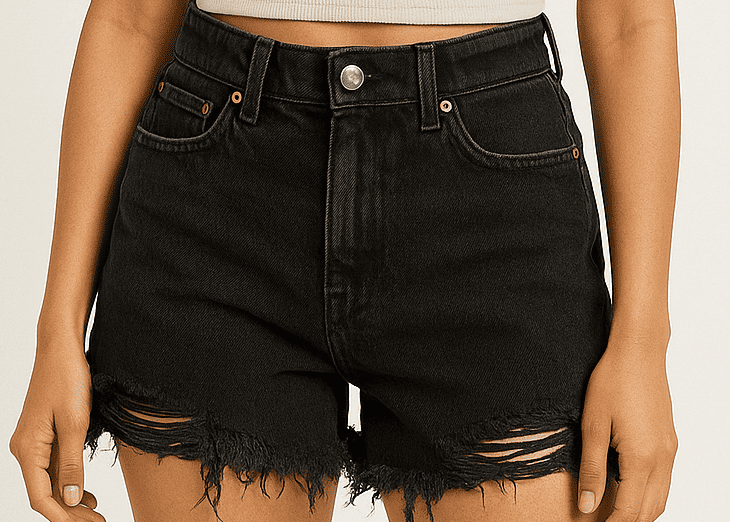 Stay effortlessly cool in these high-rise black distressed denim shorts. Designed with a classic five-pocket style and a sleek black wash, these shorts feature front shredding details and heavily frayed hems for a bold, edgy vibe. The high-rise fit offers a flattering silhouette that pairs perfectly with crop tops, tanks, or oversized tees. Crafted from durable denim, these shorts bring attitude and comfort to your everyday look.
