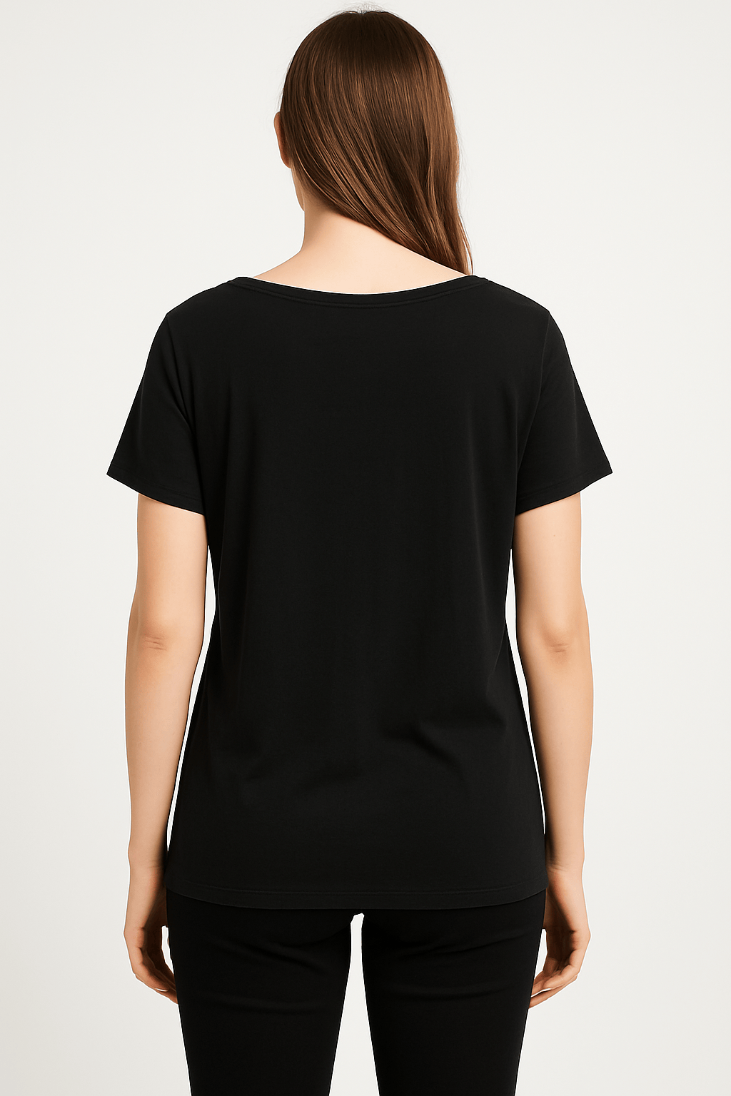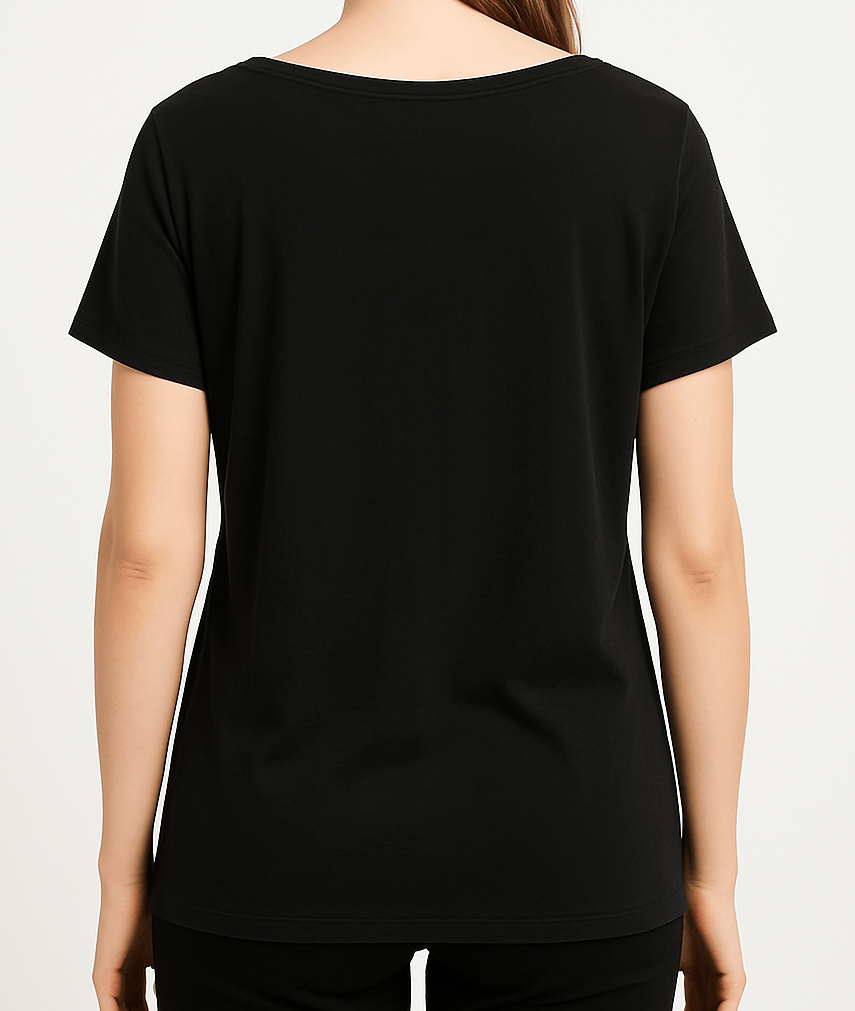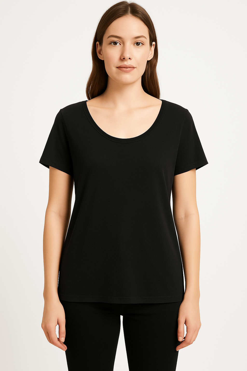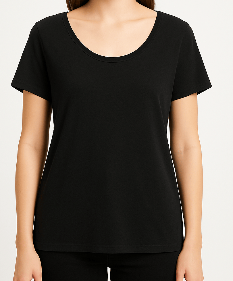 Stay effortlessly stylish in this plain black scoop neck t-shirt, crafted from soft and breathable cotton fabric. Designed for everyday comfort, it features short sleeves, a relaxed fit, and a straight hemline that falls just below the hips. Perfect for layering or wearing on its own, this versatile tee is a must-have in any wardrobe.
