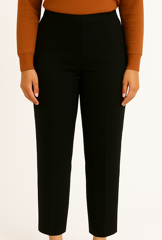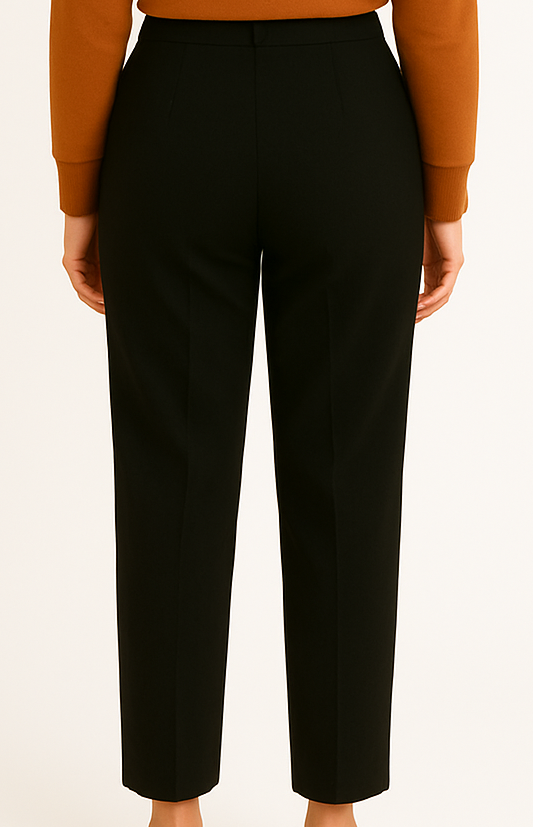 Step into sleek sophistication with these women’s black tailored trousers, designed for both comfort and polish. Featuring a flattering high-rise waist, smooth front, and tapered ankle-length fit, these trousers offer a clean silhouette perfect for office wear or elevated casual looks. The minimal design with crisp seams ensures versatility, making them a wardrobe essential.