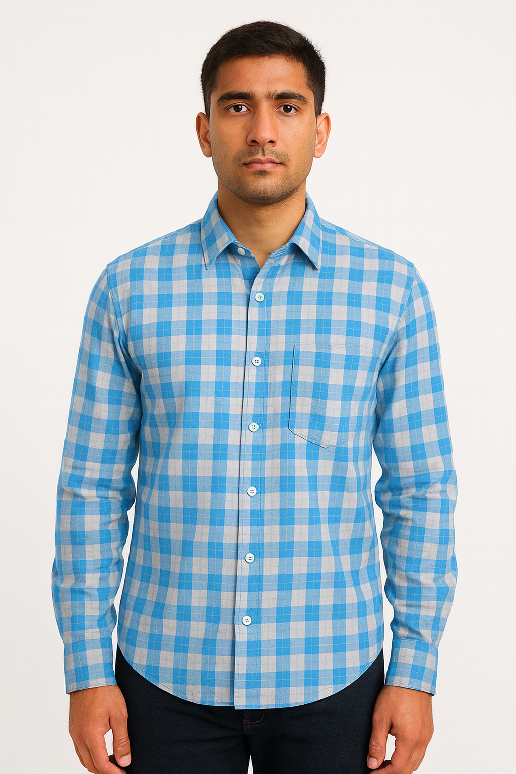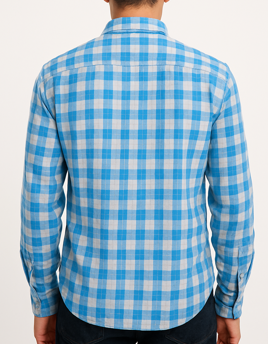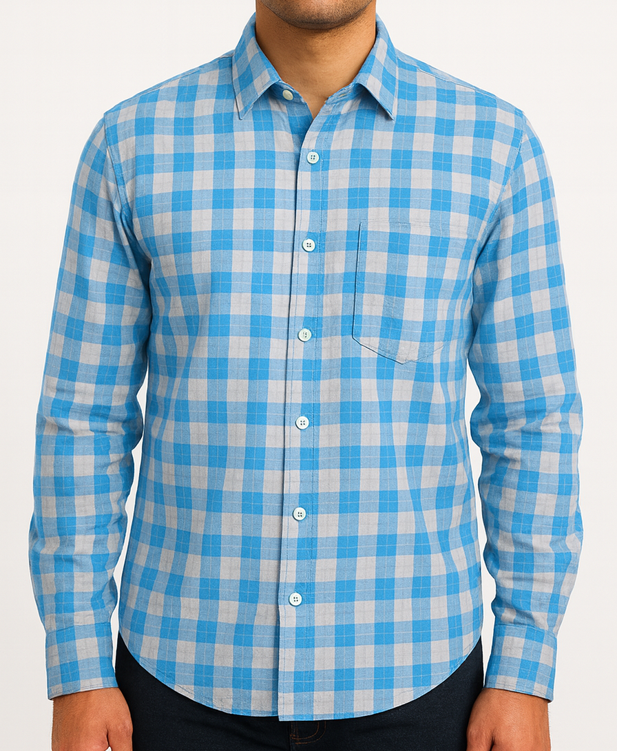 This men’s casual shirt features a classic blue and white checkered pattern, designed for everyday comfort and style. Made from breathable cotton fabric, the shirt offers a regular fit with a soft texture and a clean finish. It includes a standard collar, full-button placket, and a front patch pocket. The shirt’s full sleeves with buttoned cuffs and curved hem make it perfect for both tucked and untucked looks.