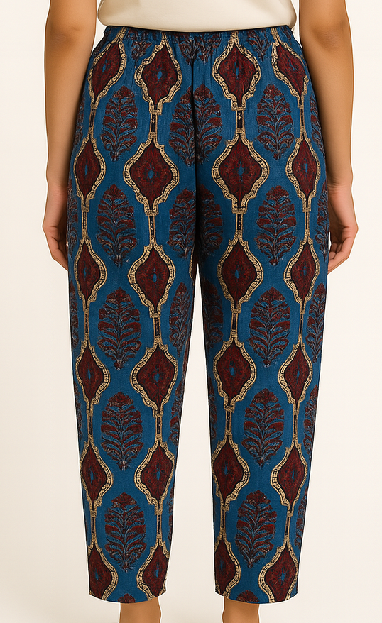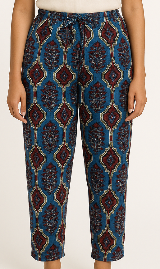 These women’s pajama pants feature a rich ethnic print in tones of blue, red, and gold on breathable cotton fabric. Designed for both comfort and style, the pants come with a drawstring waist and relaxed straight-fit silhouette. The elastic waistband ensures flexibility while the intricate block-style motif adds a cultural touch. Ideal for lounging or casual wear, these pants blend tradition with everyday ease.