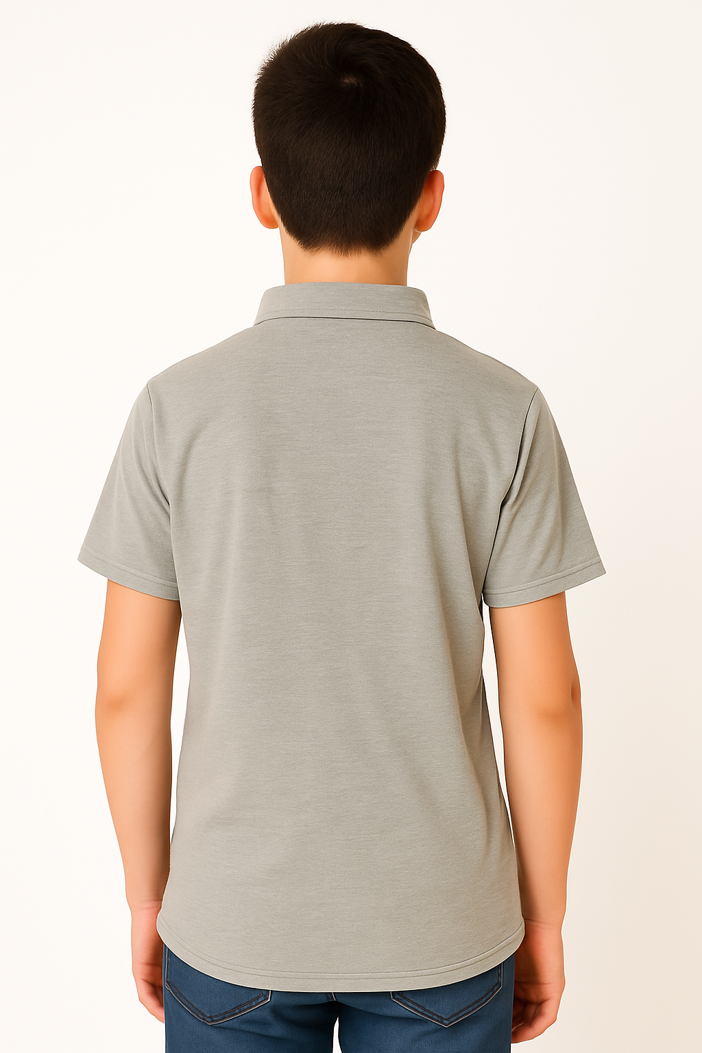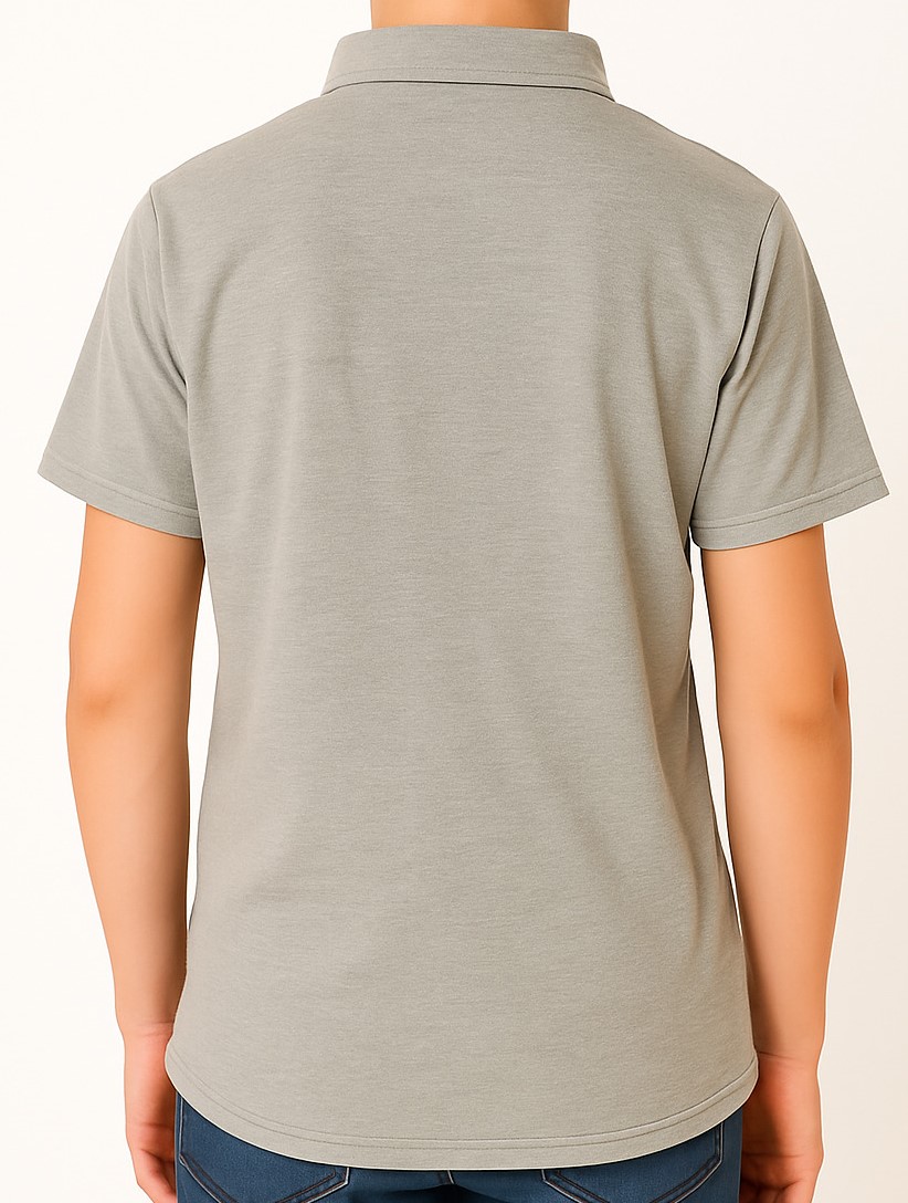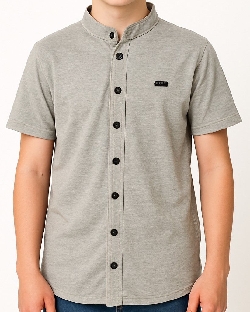 A stylish and contemporary addition to any young boy’s wardrobe, this light grey short-sleeved shirt features a modern Mandarin collar and full-length front button placket with contrasting black buttons. Made from soft, breathable fabric, the shirt provides comfort without compromising on style. Ideal for casual outings or smart-casual events, it pairs well with jeans or chinos. The minimal branding on the left chest adds a touch of subtle detailing, while the curved hem enhances its relaxed fit.