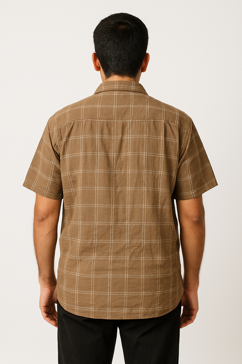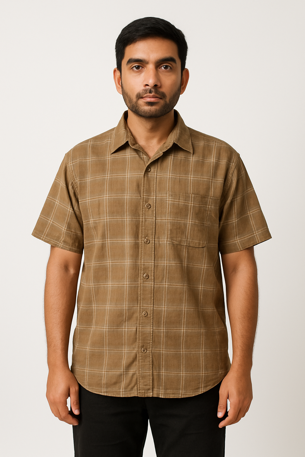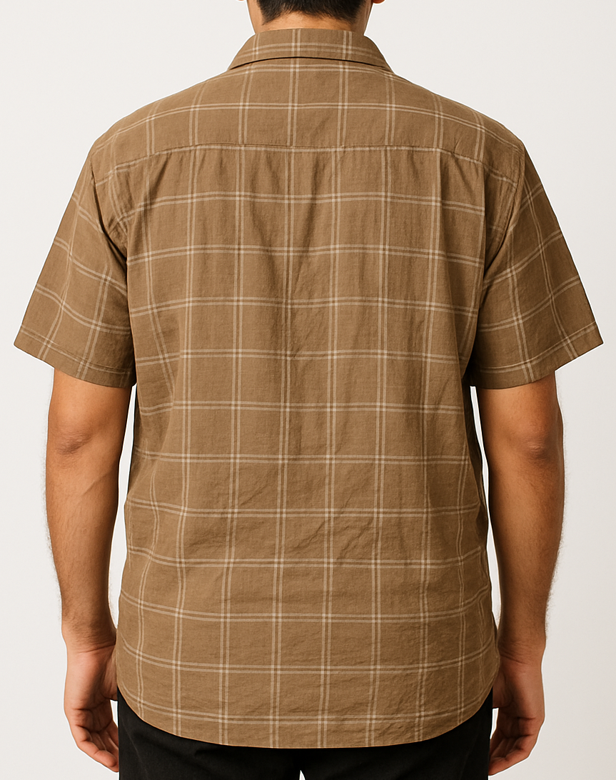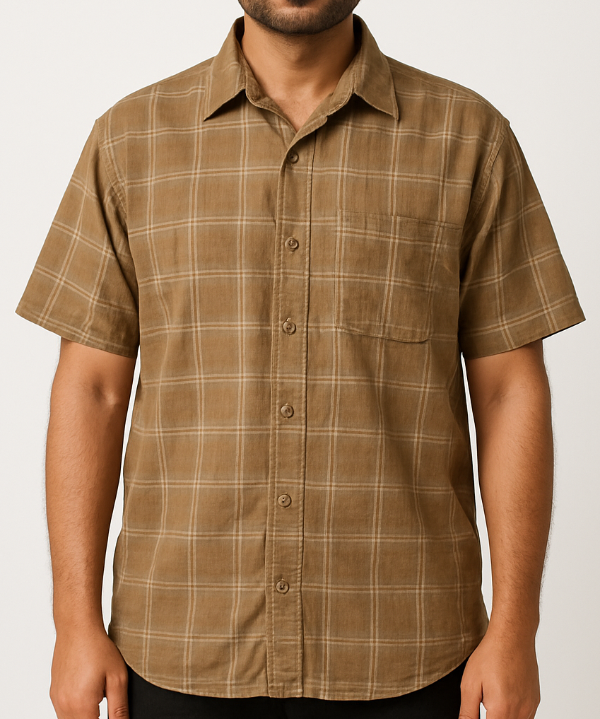 This men’s brown checked shirt is crafted from soft, breathable cotton fabric, ideal for casual or semi-formal wear. Featuring a subtle windowpane check pattern in beige on a muted brown base, this short-sleeve shirt includes a chest pocket, a spread collar, and a full front button placket. The relaxed fit and natural texture offer all-day comfort and classic style. Suitable for warm weather, office-casual looks, or weekend outings.