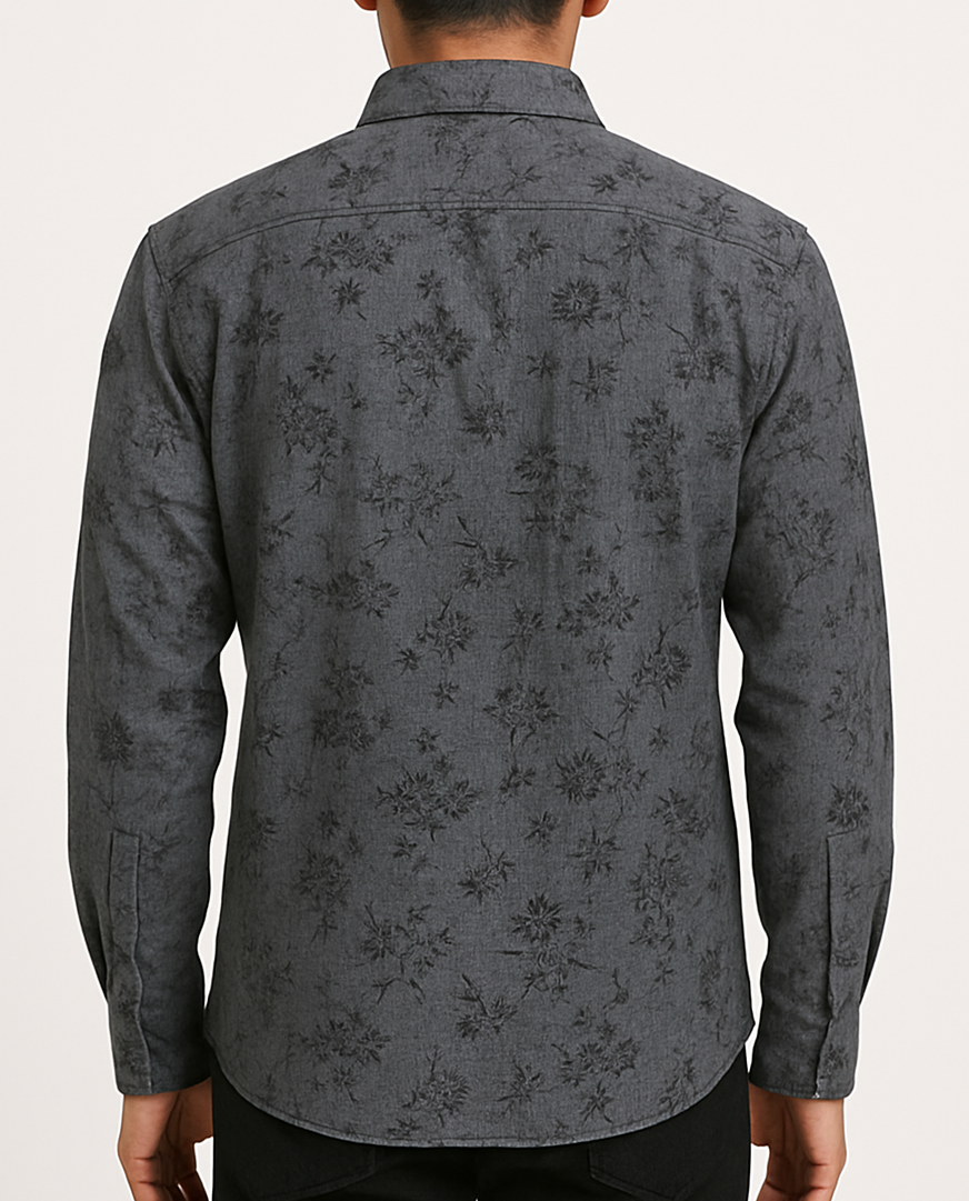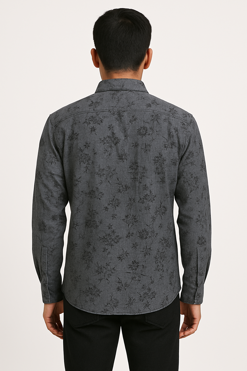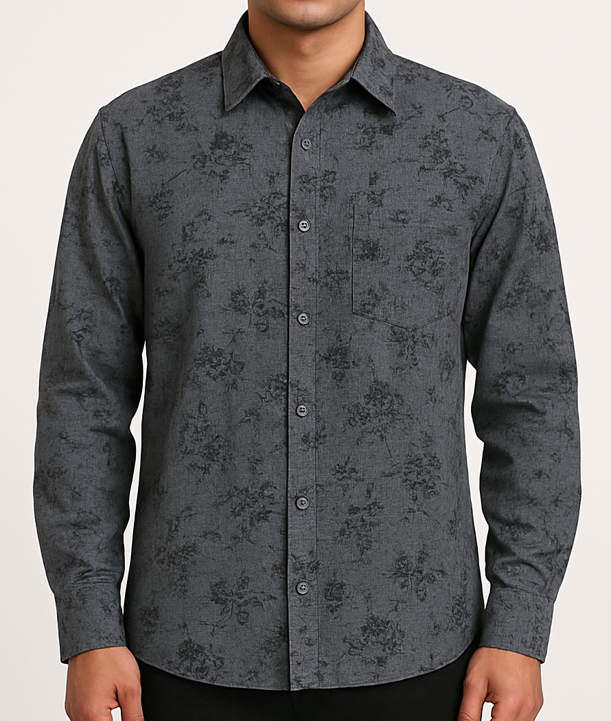 Elevate your wardrobe with this charcoal black floral print shirt crafted from soft cotton fabric. This full-sleeve shirt features a subtle yet artistic floral pattern that adds a touch of sophistication. It’s designed with a classic spread collar, button front closure, and a chest pocket for a clean, structured look. Perfect for casual dinners or semi-formal occasions, this shirt pairs seamlessly with jeans or chinos.