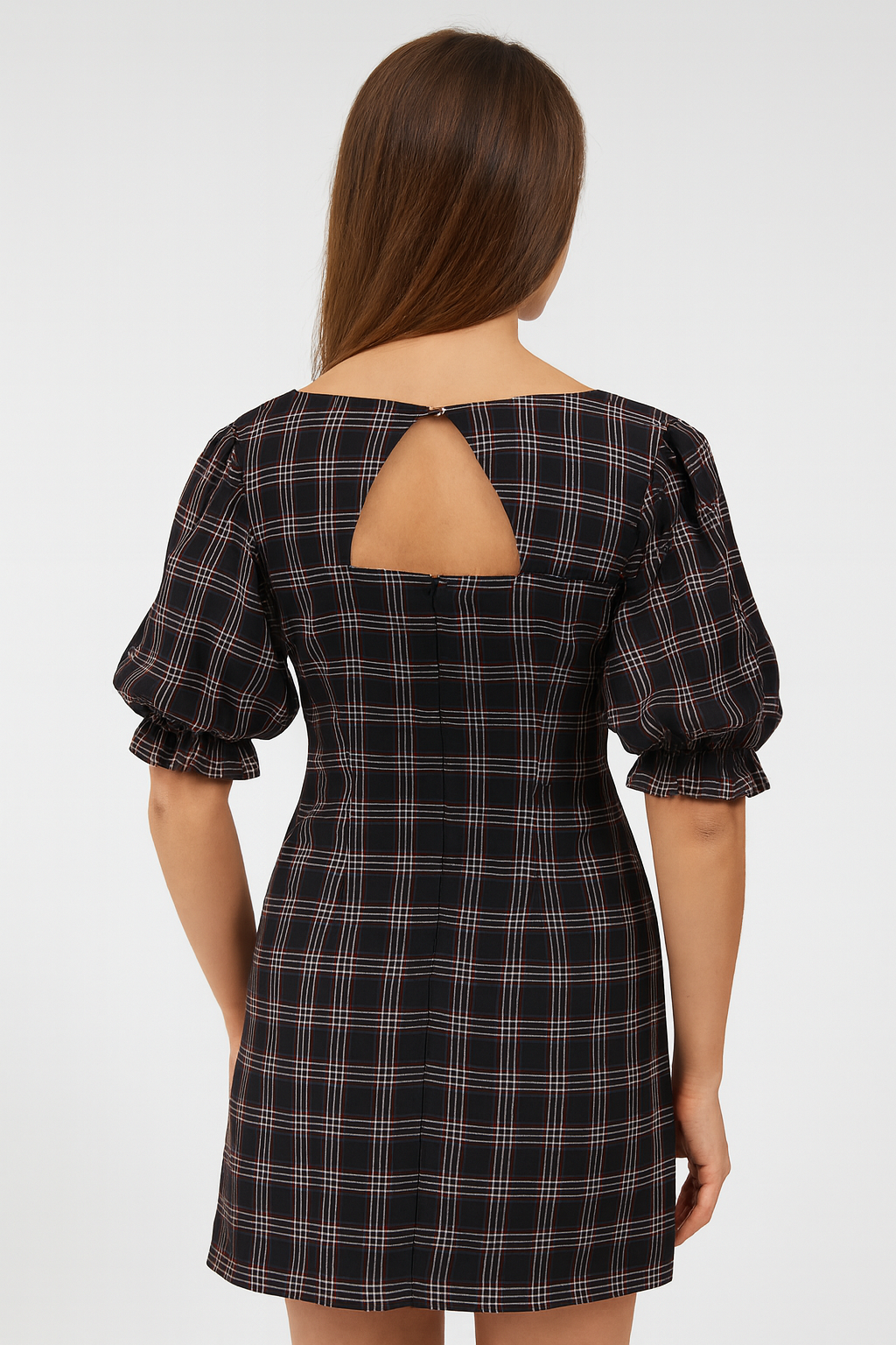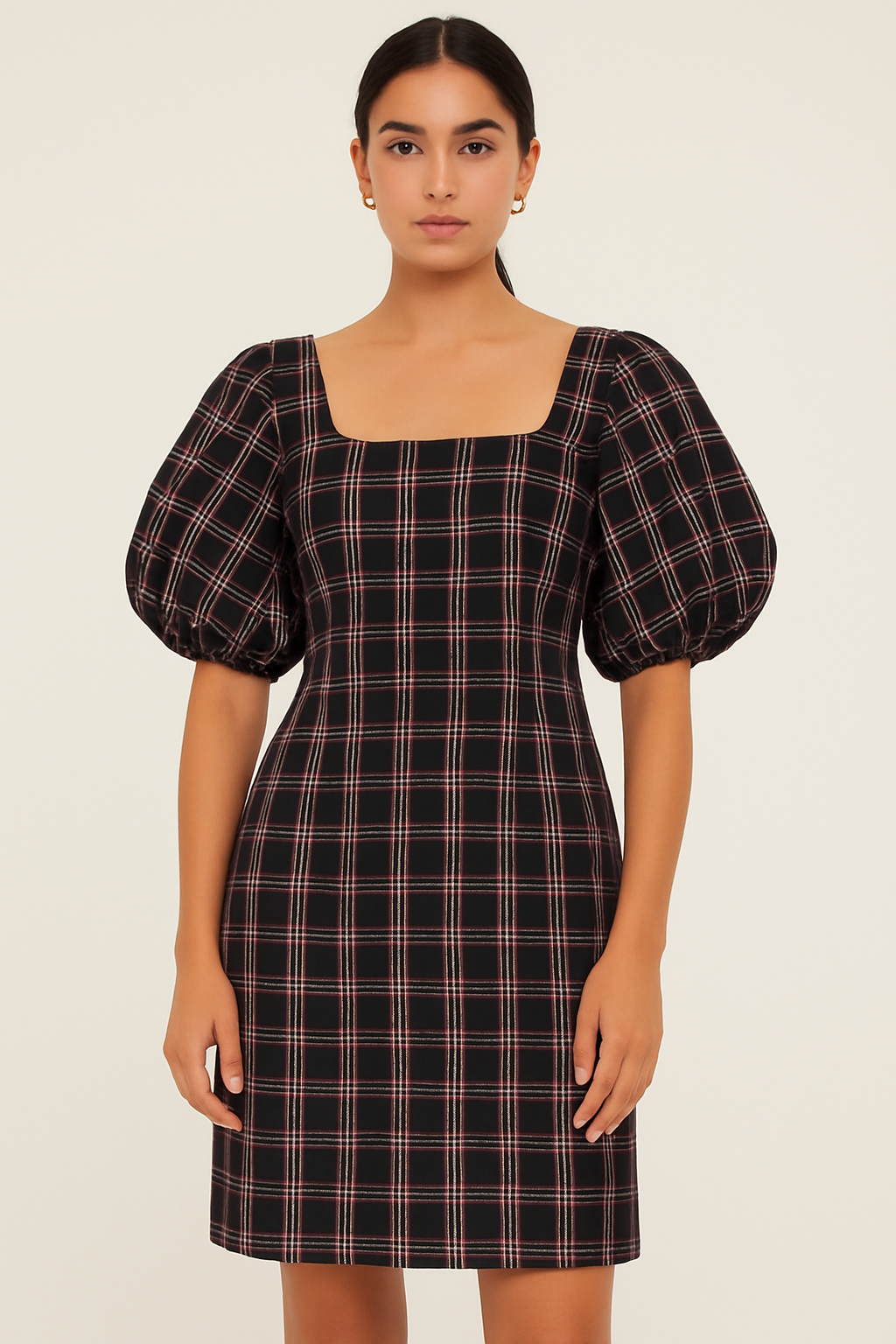This stylish black mini dress features an elegant red and white checkered pattern, designed with dramatic puff sleeves and a flattering square neckline. Tailored to enhance the silhouette, it includes a fitted waist, back keyhole cut-out, and short hemline, making it a chic choice for day-to-night transitions. Crafted in a soft, breathable fabric, this dress offers both comfort and statement style.