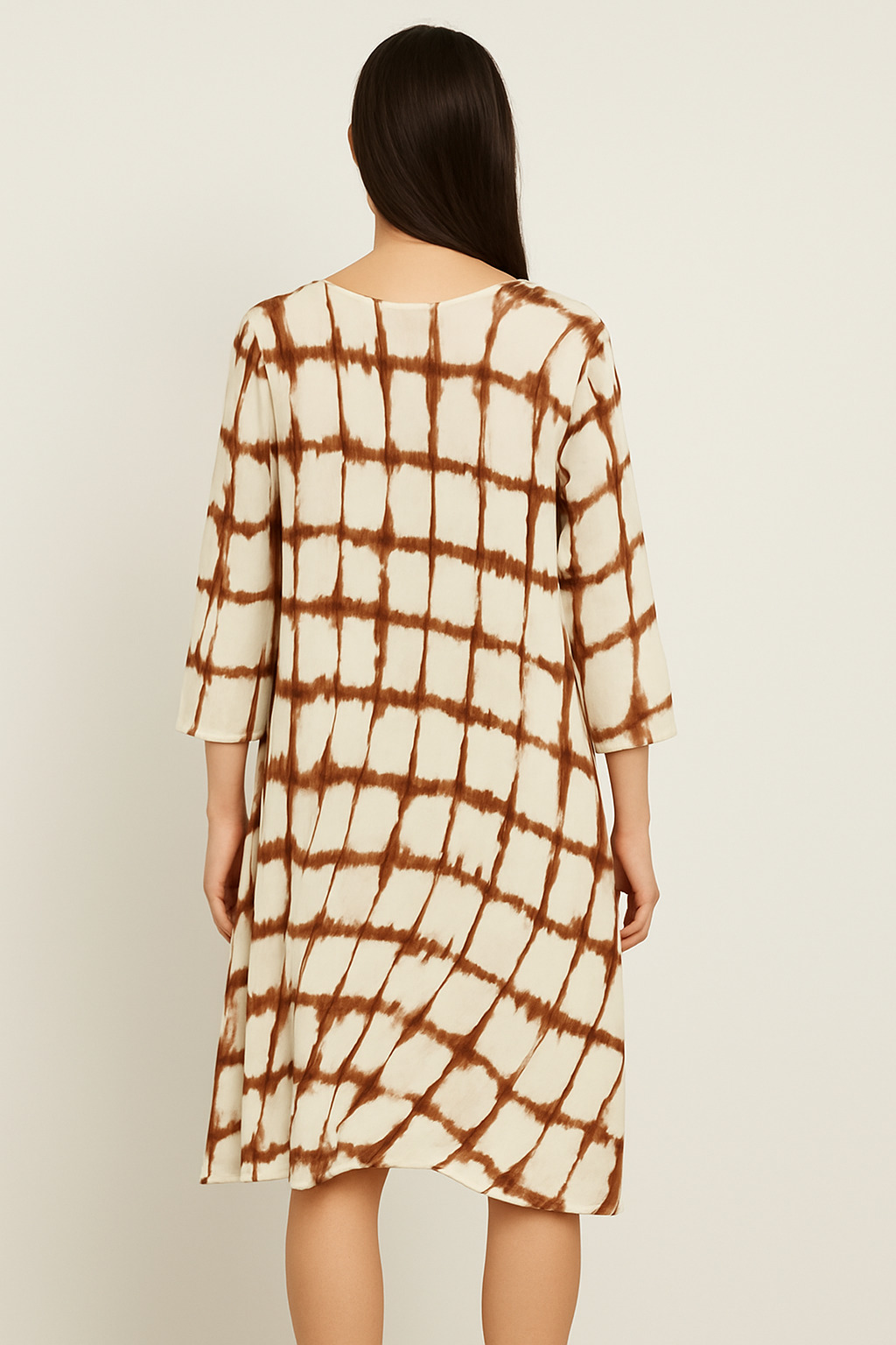 This relaxed A-line dress features an all-over grid-style tie-dye print in rich brown on a soothing cream base. Designed with a soft round neckline and 3/4th sleeves, this knee-length dress flows effortlessly for a breezy, comfortable silhouette. Perfect for casual outings or lounging in style, the natural tones and pattern lend a rustic, earthy charm to your wardrobe.
