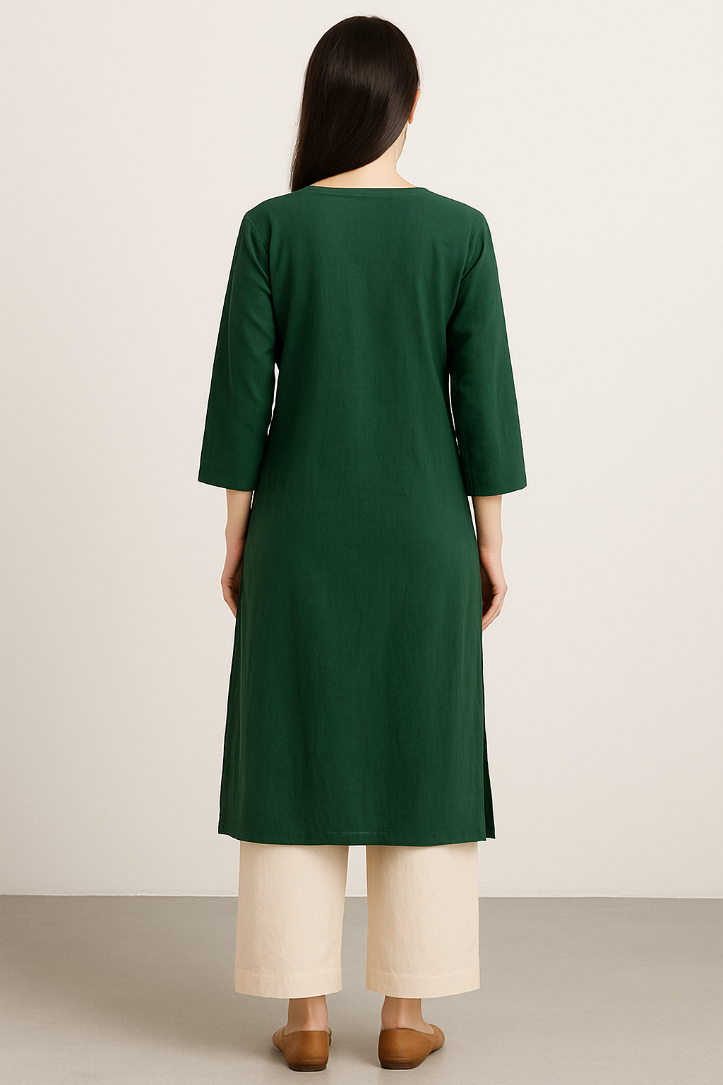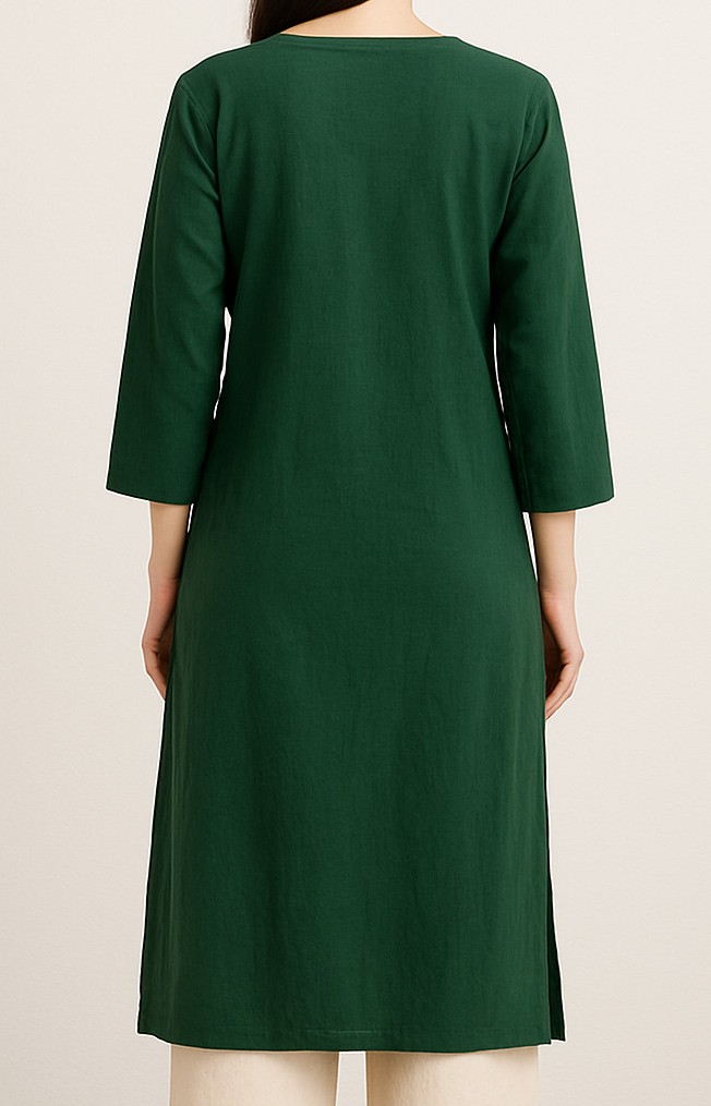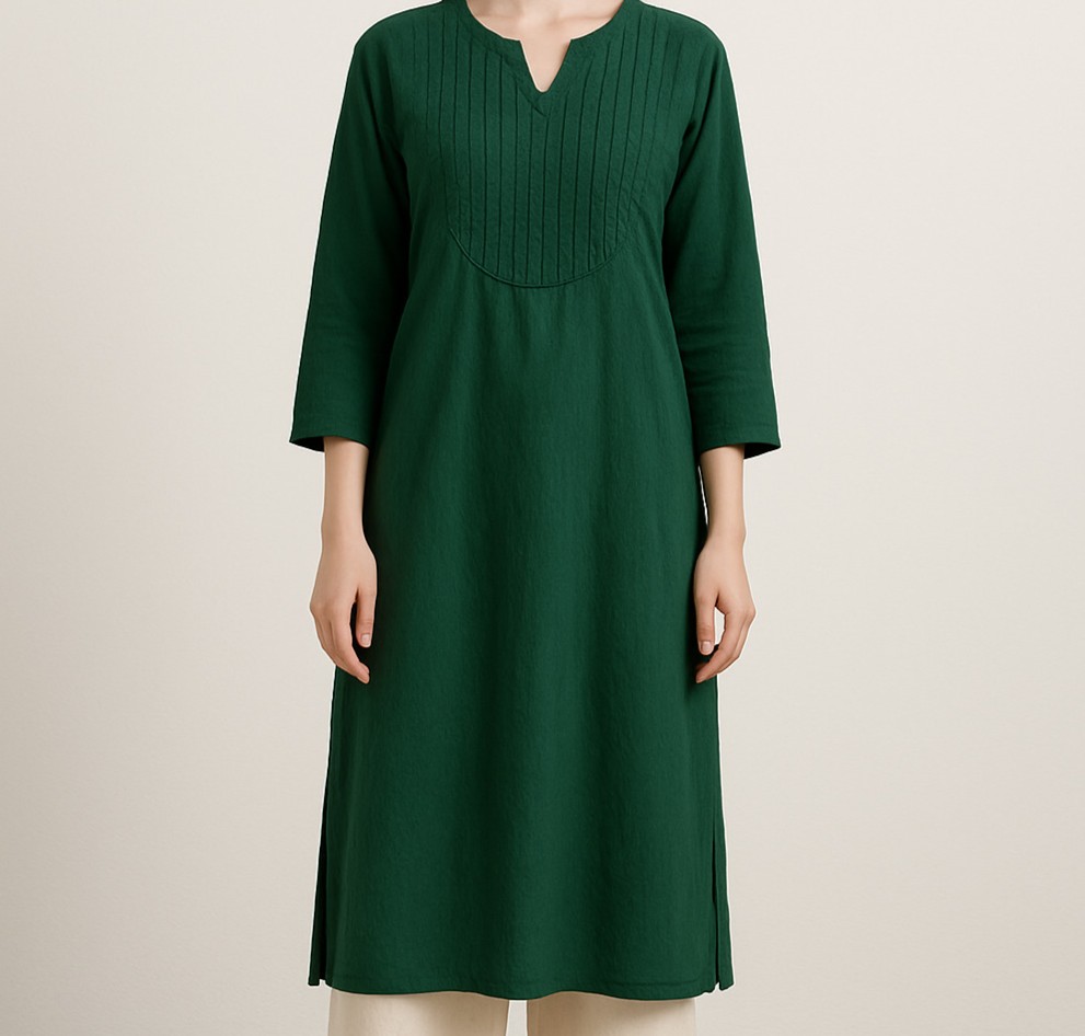 This deep green kurti is crafted from a soft, textured fabric that ensures all-day comfort and elegance. It features a gently flared straight cut with side slits for ease of movement and 3/4th sleeves. The yoke showcases delicate vertical pintuck detailing that adds depth and visual interest. A modest V-slit neckline enhances the silhouette. Paired with beige palazzos, this kurti is ideal for casual or semi-formal outings.