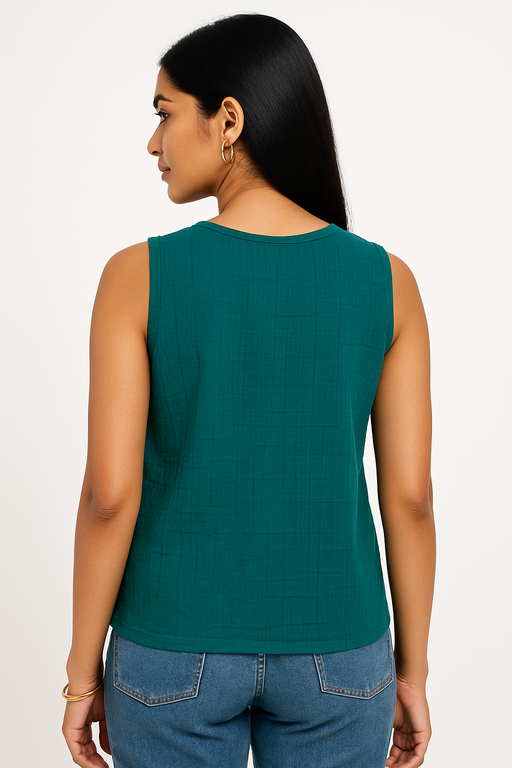 Add a pop of charm to your wardrobe with this sleeveless deep teal top crafted from soft textured cotton fabric. It features a flattering scalloped V-neckline and a row of playful multicolor buttons in pink, orange, and purple. The regular fit and hip-length cut make it perfect for pairing with jeans or skirts for a casual yet stylish look. The clean back design ensures a neat and polished finish.