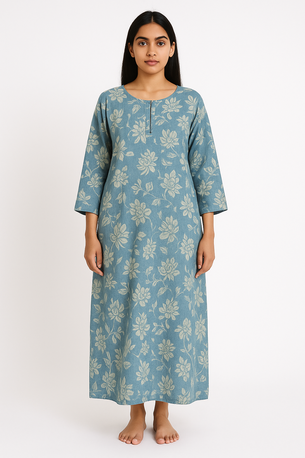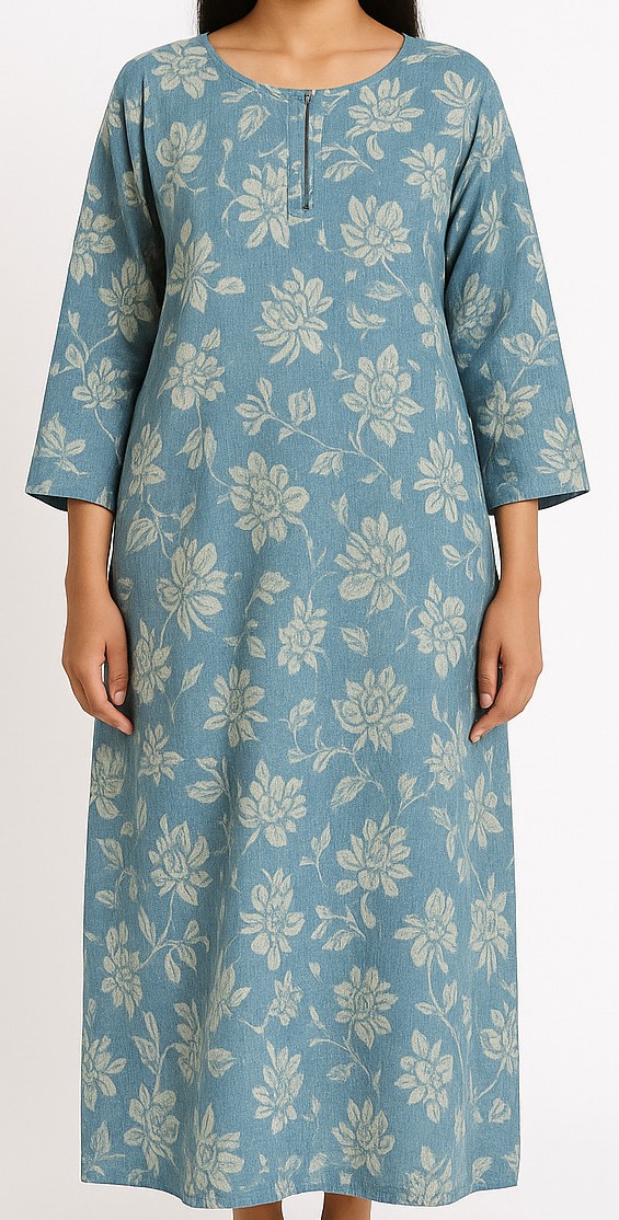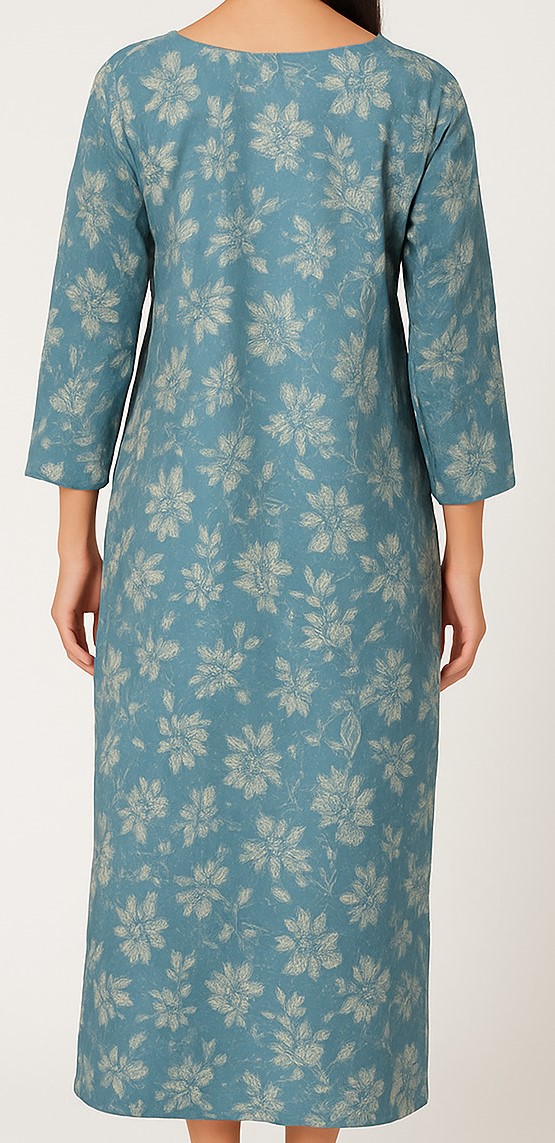 Embrace effortless elegance with this dusty blue straight kurta crafted from soft cotton fabric. Featuring a soothing floral block print in beige, this full-length kurta offers a relaxed yet refined silhouette. The round neckline with a minimalist split placket adds subtle detailing, while the 3/4th sleeves and side slits enhance comfort and style. Ideal for casual daywear or relaxed evenings, this kurta brings together comfort and timeless floral charm.