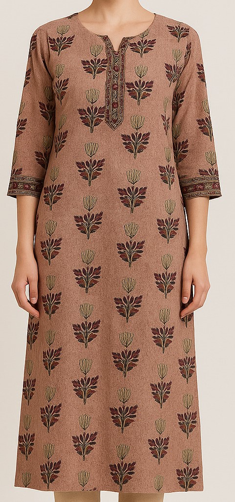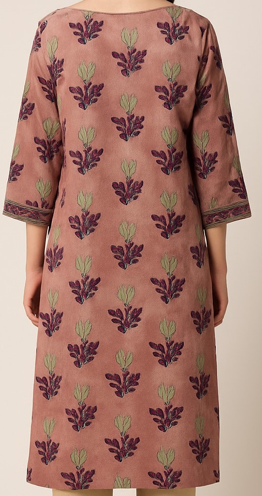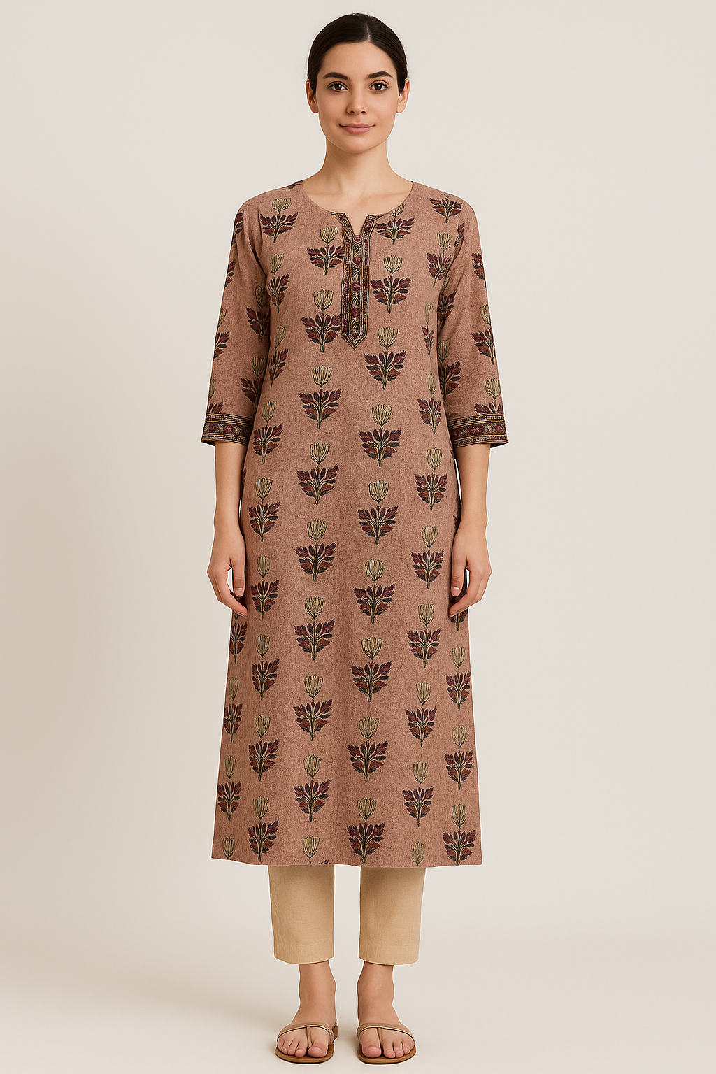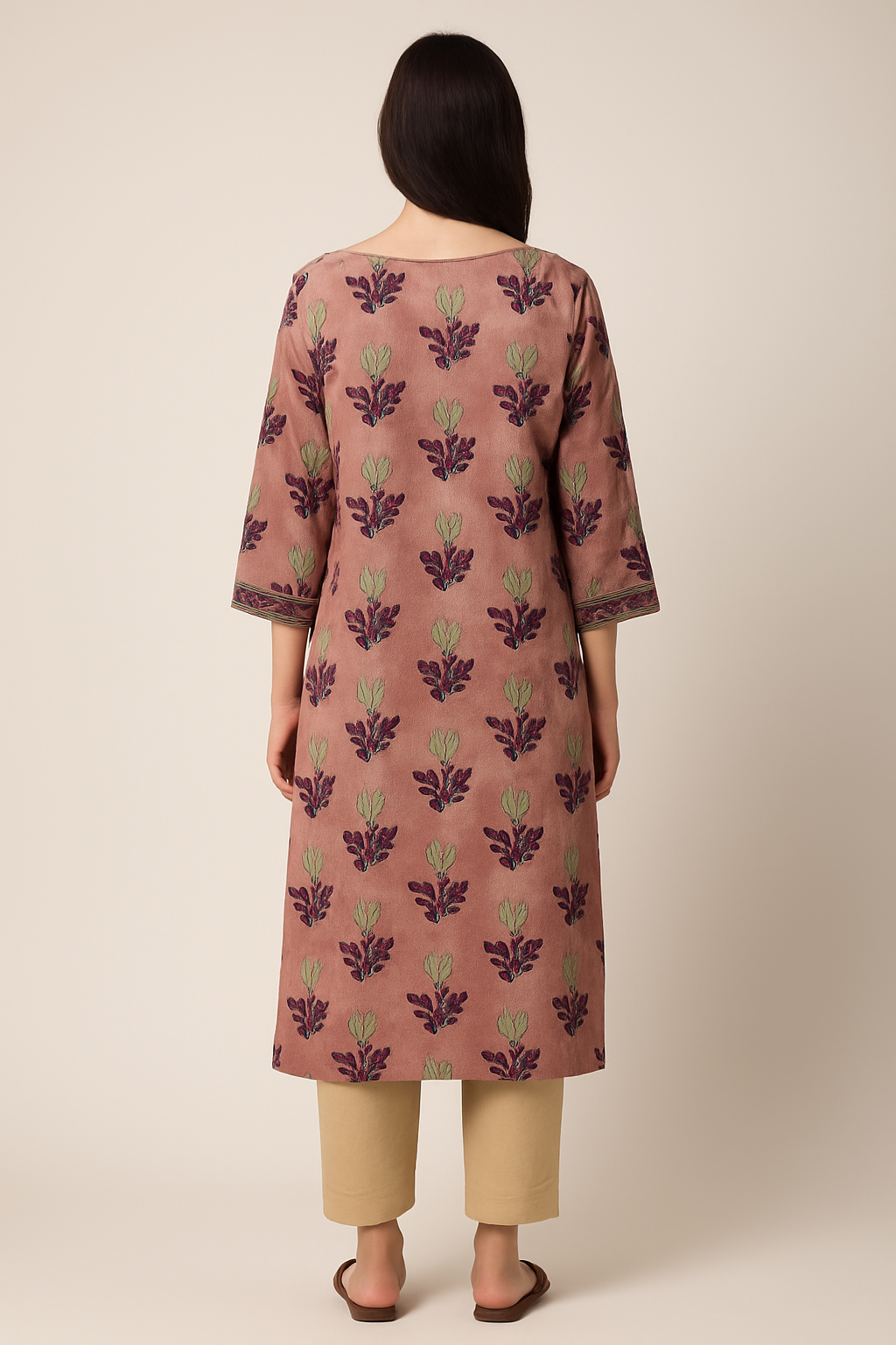 Step into timeless elegance with this dusty rose straight-cut kurti featuring an all-over Mughal-inspired floral print in deep maroon and olive green tones. Crafted from breathable cotton fabric, it showcases a round neckline with a V-slit placket adorned with intricate ethnic embroidery. The kurti has 3/4th sleeves with printed cuffs and a comfortable calf-length silhouette that pairs well with neutral-toned bottoms for everyday ethnic charm.