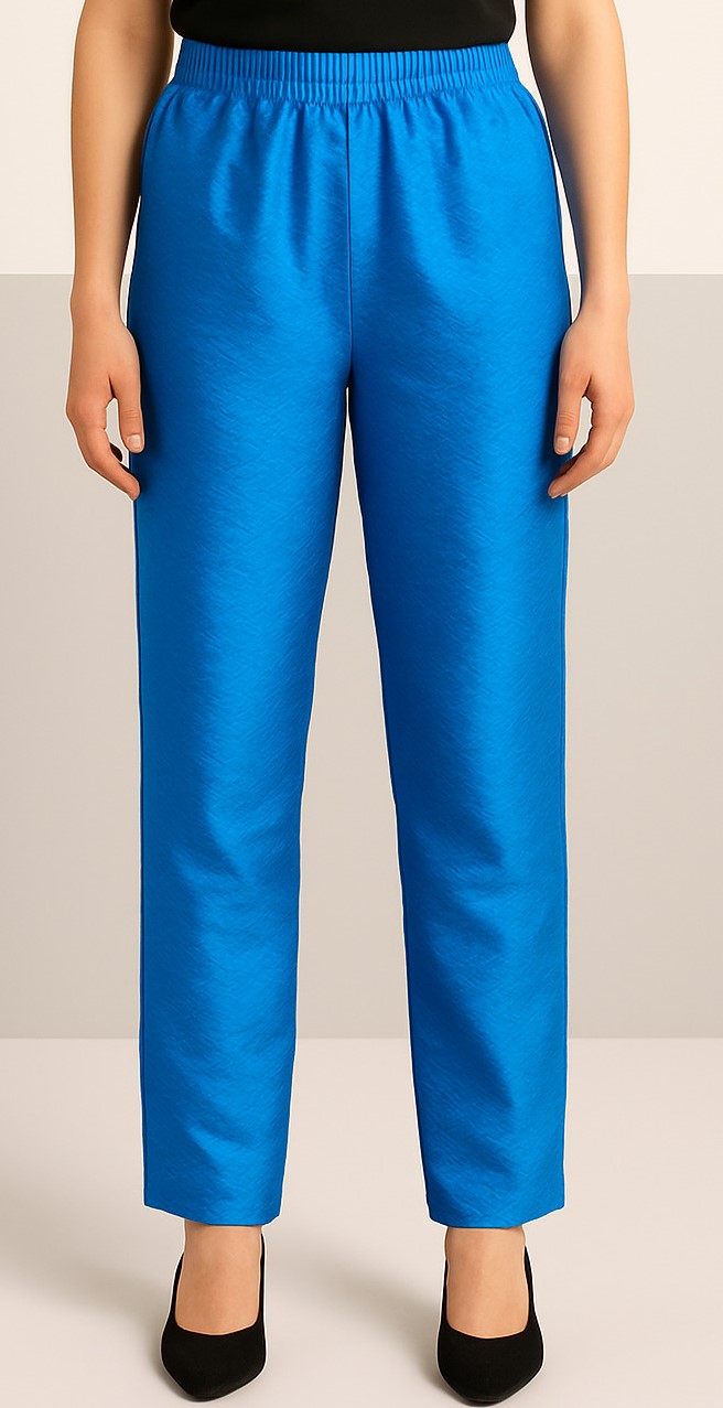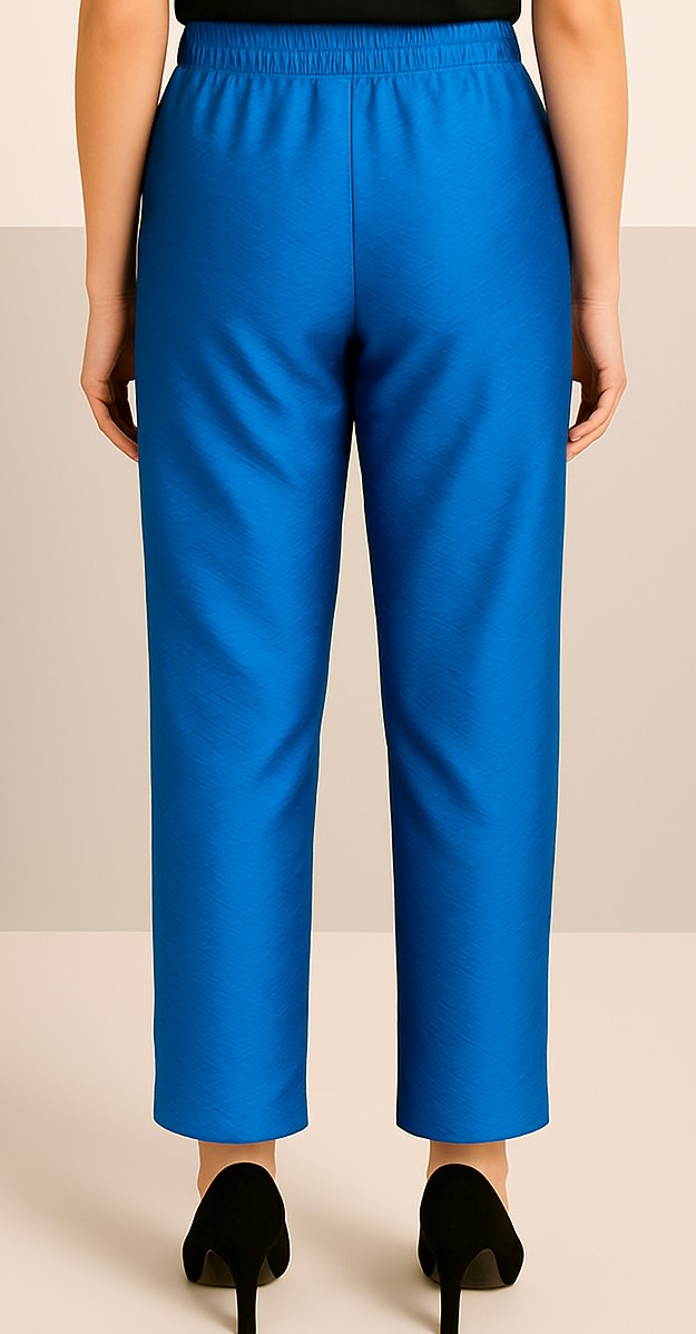 These women’s straight-fit pants are crafted from a sleek, satin-finish fabric in a vibrant electric blue hue. The design features a clean and structured silhouette with an elasticated waistband that offers ease of wear and a snug fit. The pants fall just above the ankle, giving a crisp and contemporary look ideal for both casual and semi-formal settings. The fabric has a subtle textured sheen that adds depth to the color. Pair these versatile pants with a tucked-in blouse or a fitted tee and heels for an elevated yet effortless outfit.