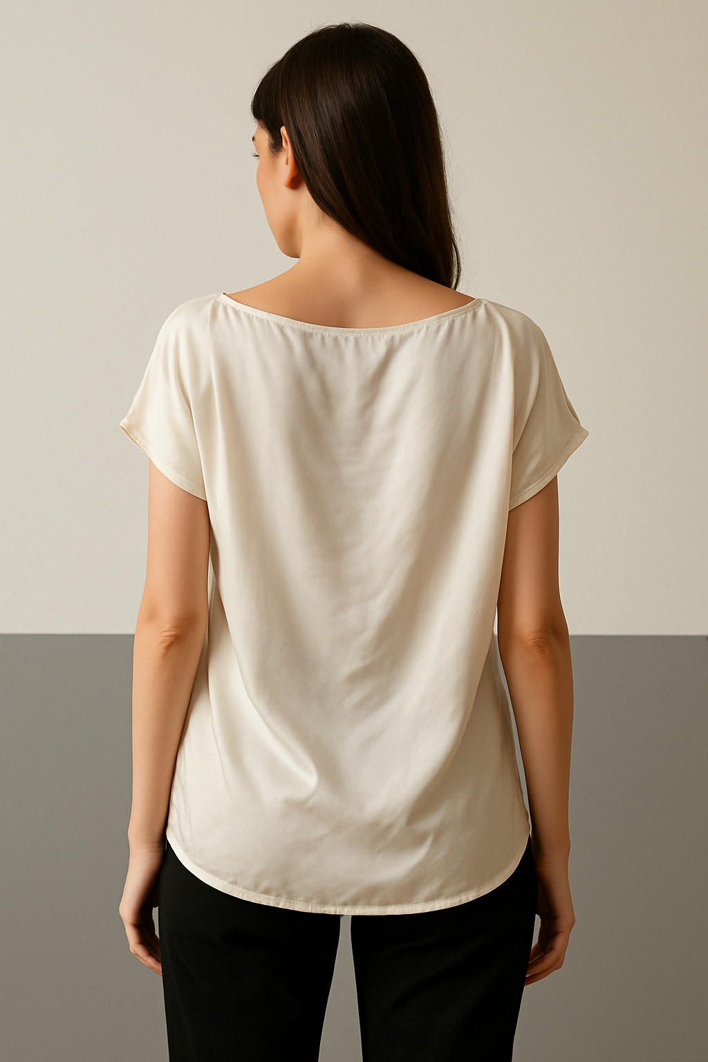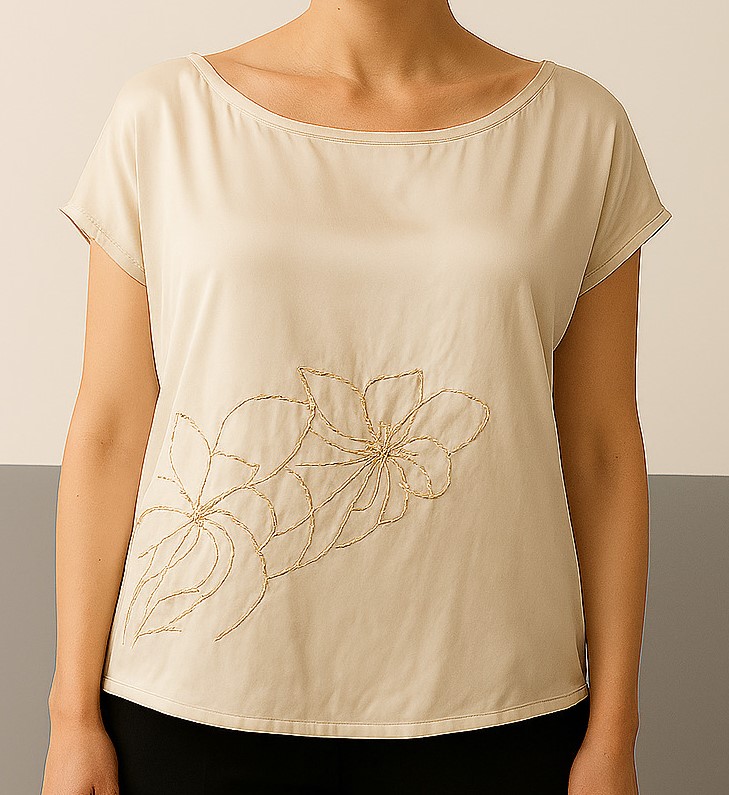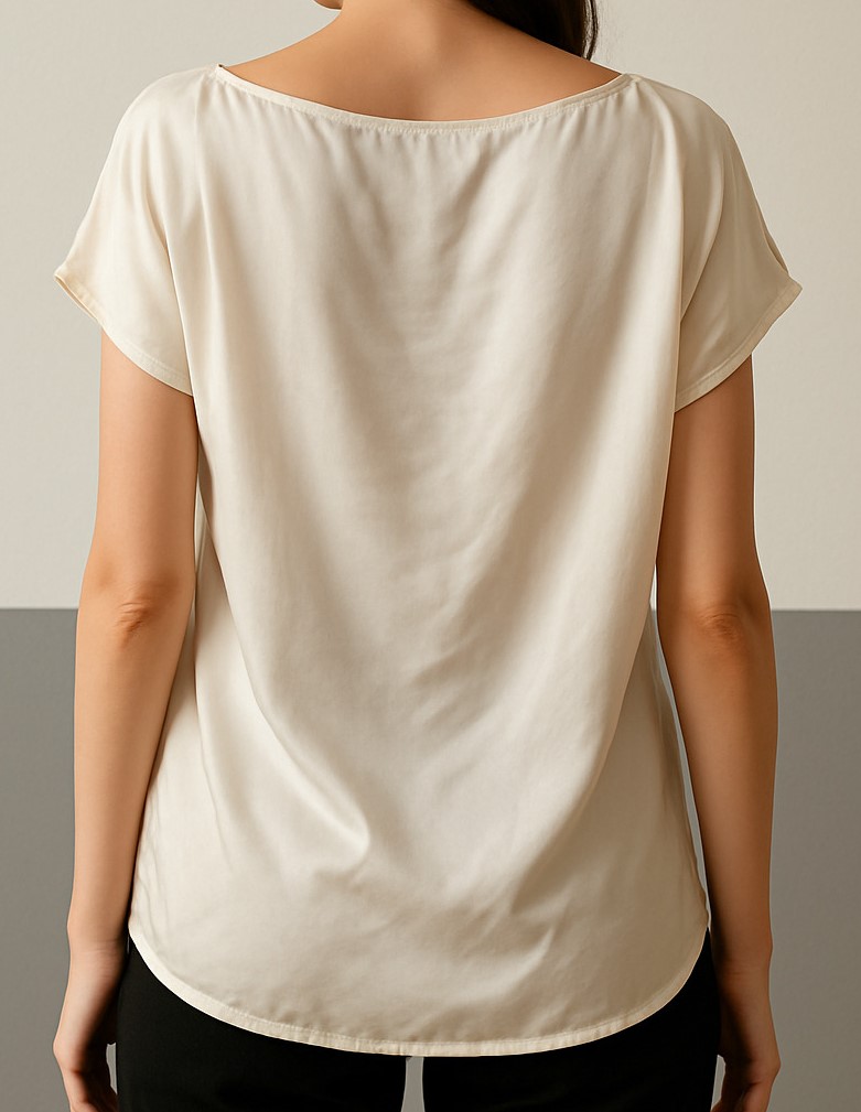 This ivory satin boat neck top features a smooth matte finish and a relaxed fit, perfect for elegant casual wear. The front is delicately adorned with beige hand-embroidered floral motifs, while the back remains clean and minimal. Designed with short sleeves and a rounded hem, the top pairs beautifully with tailored pants or skirts. The satin fabric drapes effortlessly, offering comfort and understated elegance for both day and evening wear.