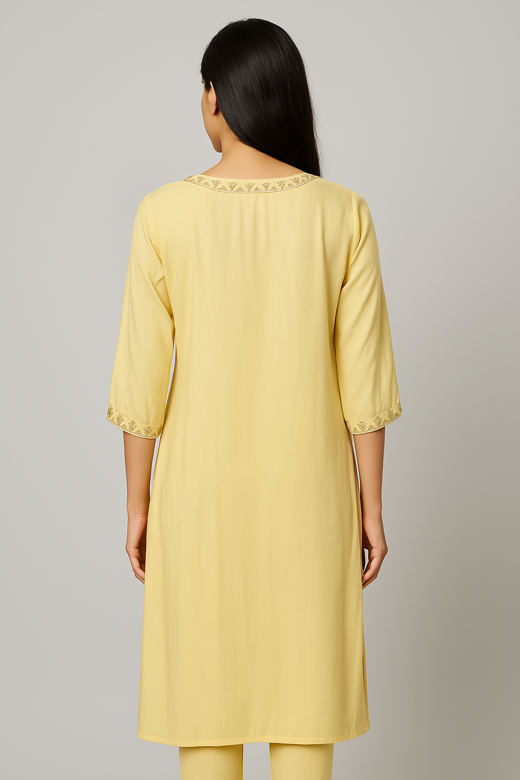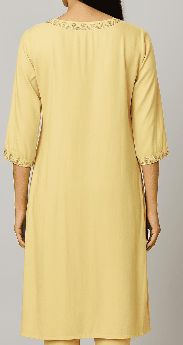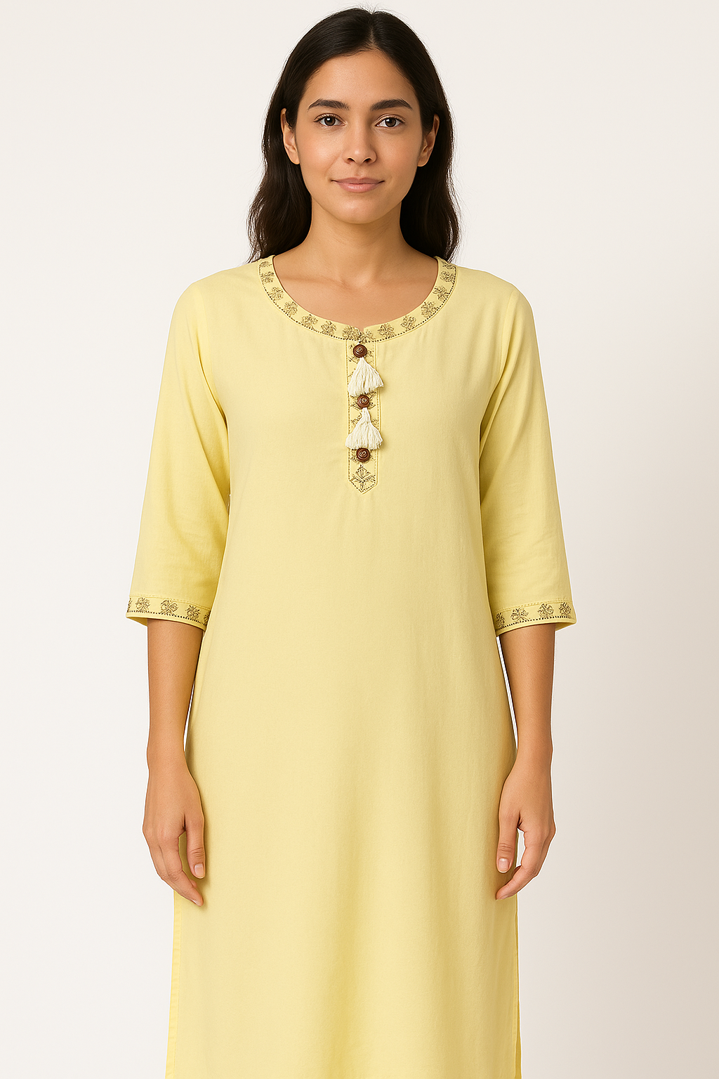 Elevate your ethnic wardrobe with this refreshing lemon yellow kurti crafted from soft, breathable cotton fabric. This straight-fit kurti features a round neckline adorned with elegant brown floral embroidery, matched with coordinating embroidered sleeve cuffs. The front is accentuated with a vertical button placket detailed with wooden buttons and charming ivory tassels. The back remains plain for a clean, minimal look. Its 3/4th sleeves and knee-length design make it perfect for daily wear or casual gatherings.