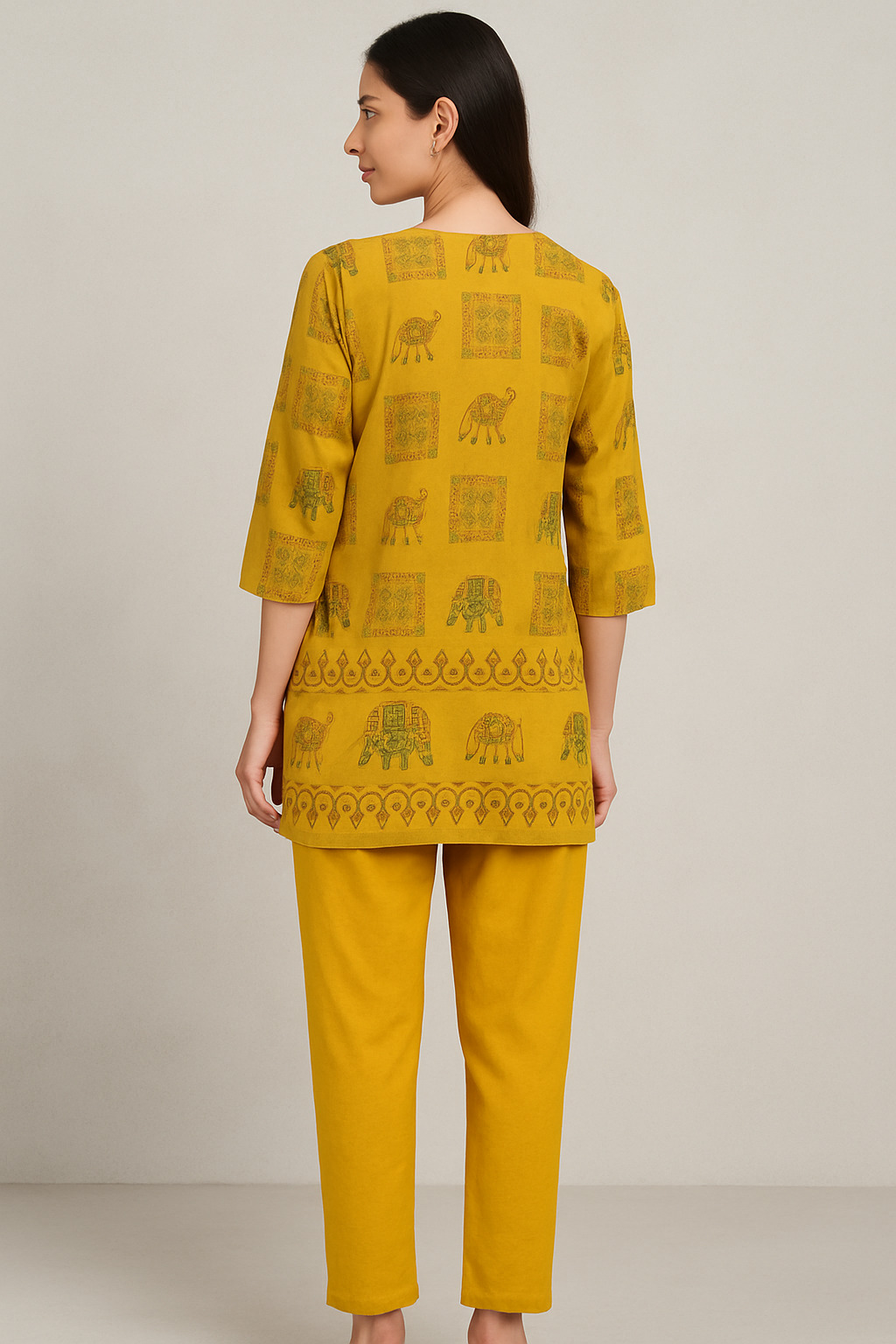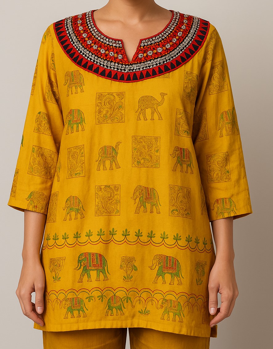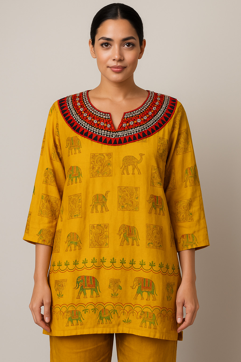 This mustard yellow kurti is crafted from breathable pure cotton and features a vibrant block print design with elephants, camels, and paisley motifs. The front neckline is adorned with a striking embroidered yoke in red, black, and white floral patterns, giving it a rich ethnic appeal. The 3/4th sleeves and straight hem make it perfect for daily wear or casual outings. It comes with coordinated mustard pants for a complete traditional look.