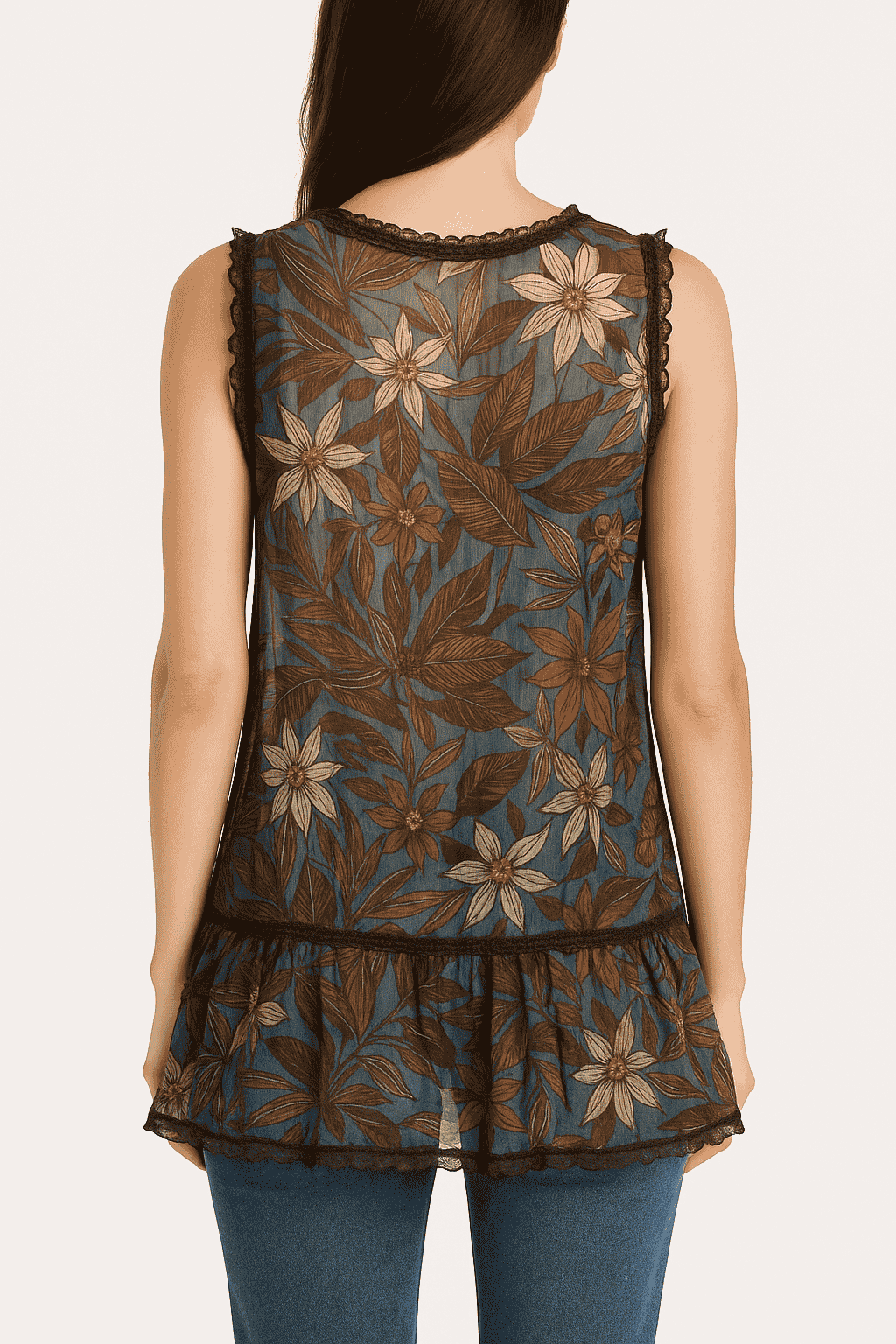 Elevate your casual wardrobe with this sleeveless sheer tunic top, featuring an elegant floral print in earthy tones of brown, teal blue, and beige. Crafted from lightweight, transparent fabric, this top is designed with a flattering V-neckline trimmed with delicate black lace, front button closure, and subtle ruffle detailing at the hem. The drawstring at the waist adds shape while maintaining a relaxed fit. Perfect for layering over a camisole or slip, it combines effortless style with feminine charm.