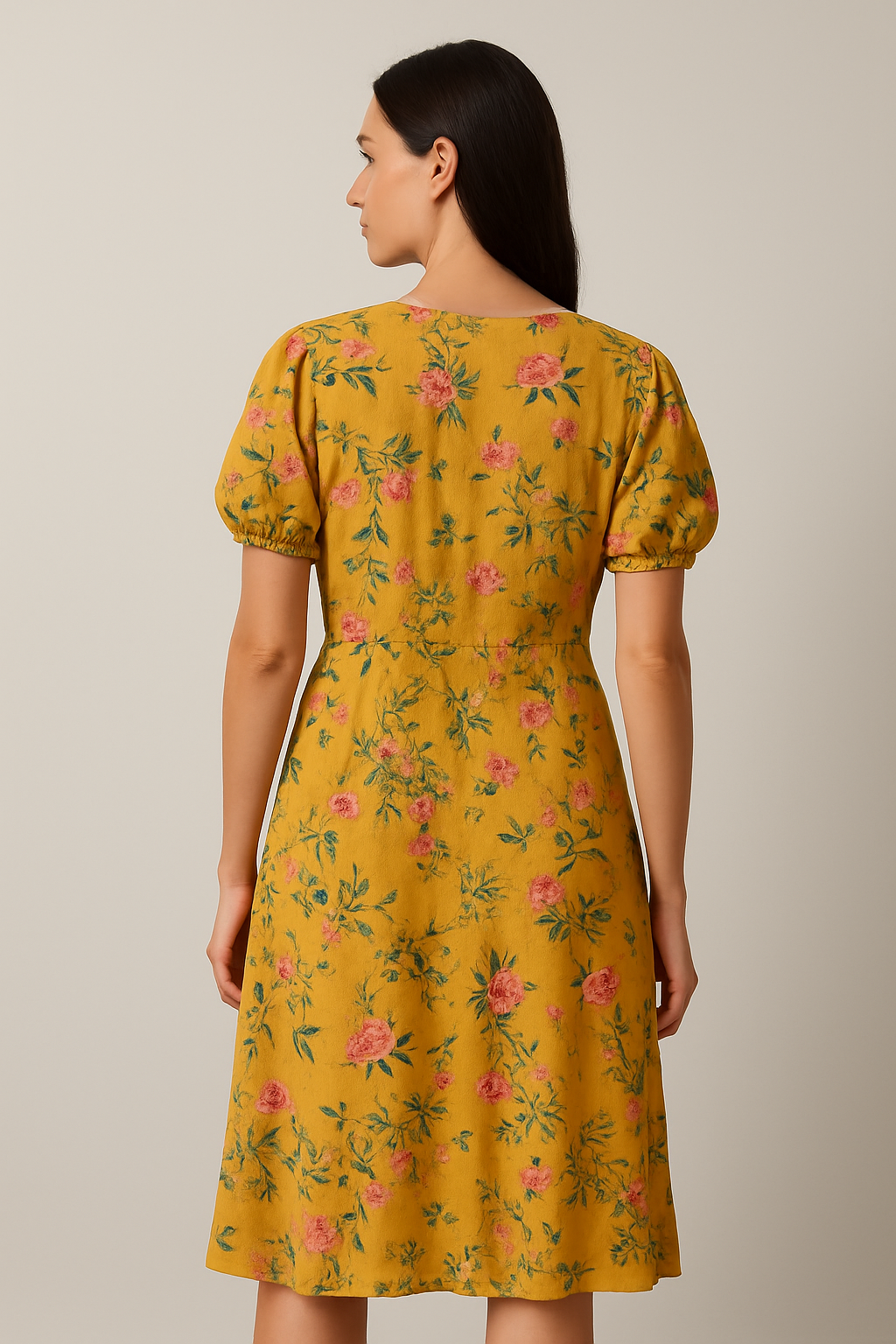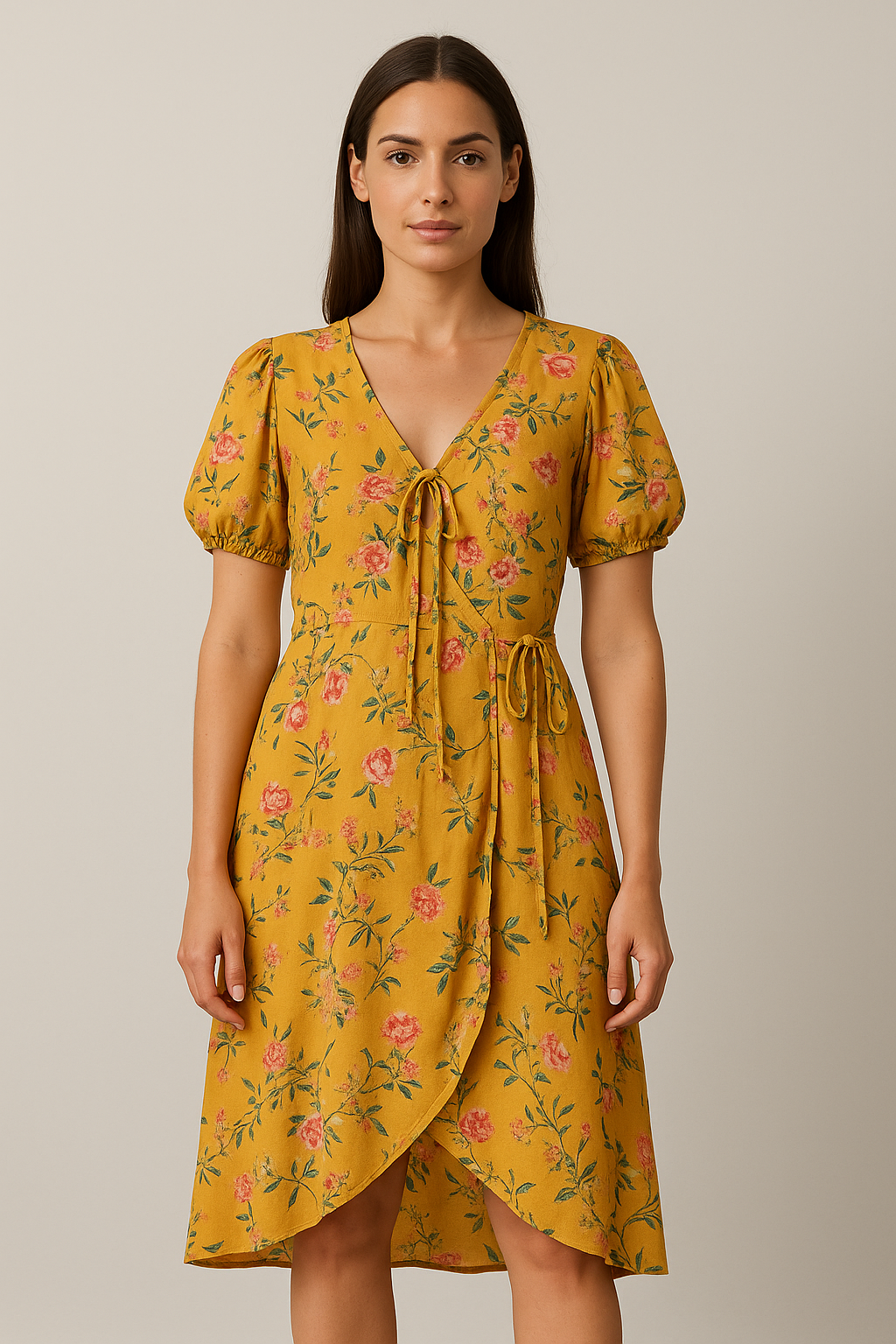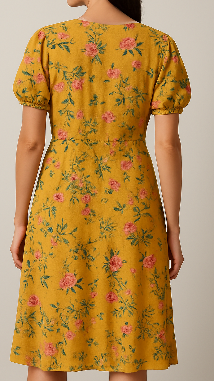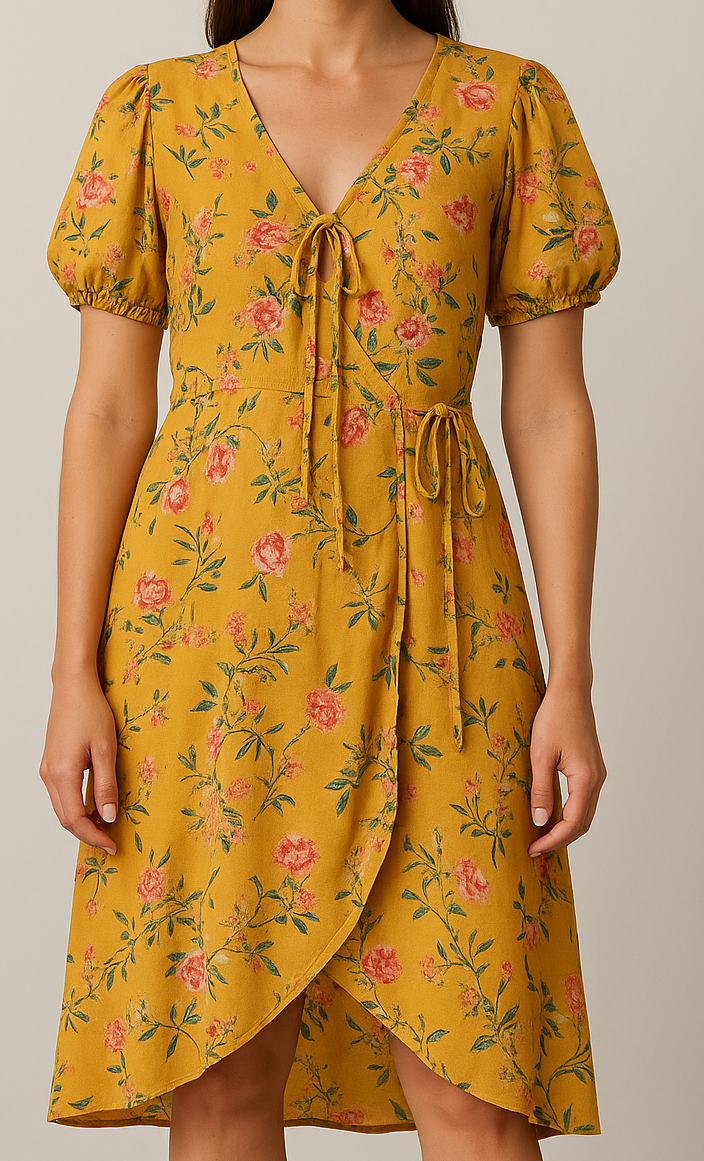 This mustard yellow wrap dress features a delicate floral print in shades of pink and green, adding a refreshing pop of color. Designed with short puff sleeves and a flattering V-neckline, the dress includes tie closures at the bust and waist for a feminine silhouette. The soft wrap-style hem and lightweight fabric make it ideal for warm-weather outings, brunches, or casual get-togethers.