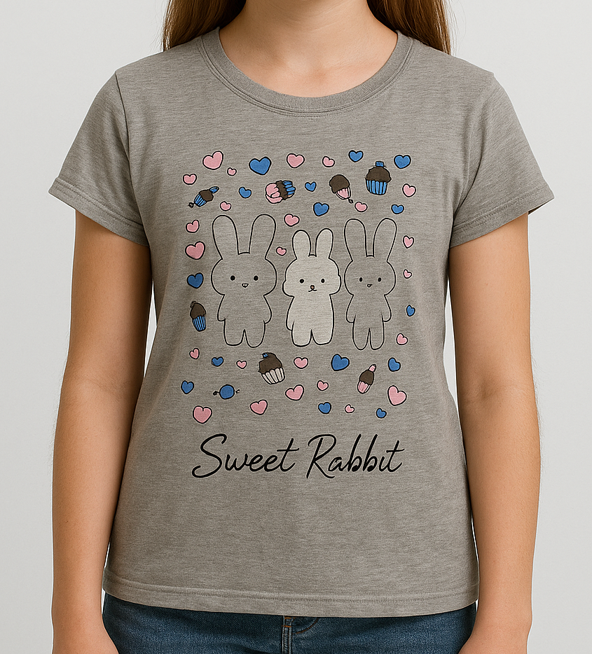 Add a dose of cuteness to her casual wardrobe with this charming grey short-sleeve t-shirt featuring a playful “Sweet Rabbit” print. Made from soft, breathable fabric, this tee showcases three adorable bunny illustrations surrounded by heart and cupcake motifs in pastel pink and blue. The classic round neckline and comfortable fit make it ideal for everyday wear or fun outings. Perfectly pairs with jeans or shorts for a relaxed and trendy look.