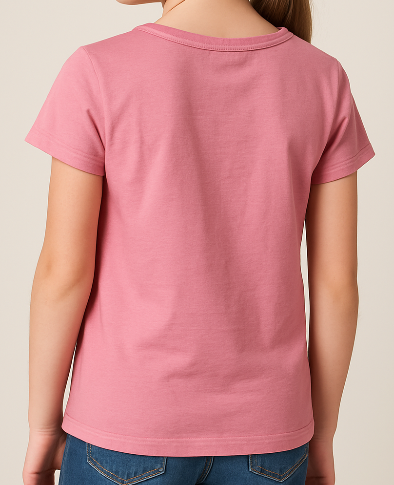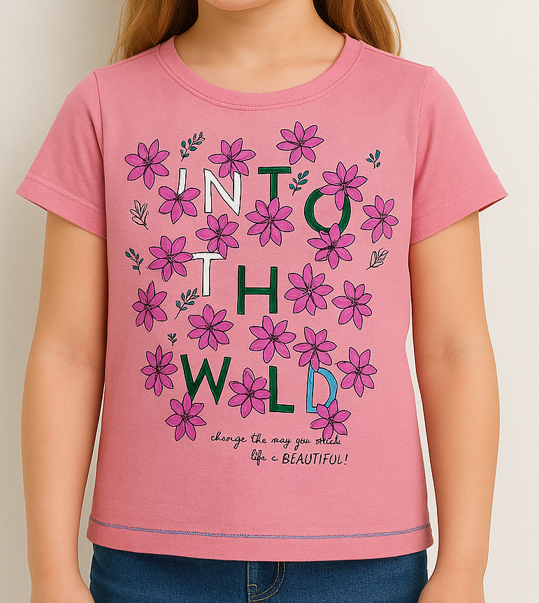 Brighten up her casual wardrobe with this adorable pink cotton T-shirt for girls, featuring a cheerful floral graphic print with the words “INTO THE WILD”. Made from soft, breathable cotton fabric, it offers a comfortable fit ideal for everyday play or outings. The short sleeves and round neck design make it a versatile pick for pairing with jeans, shorts, or skirts.