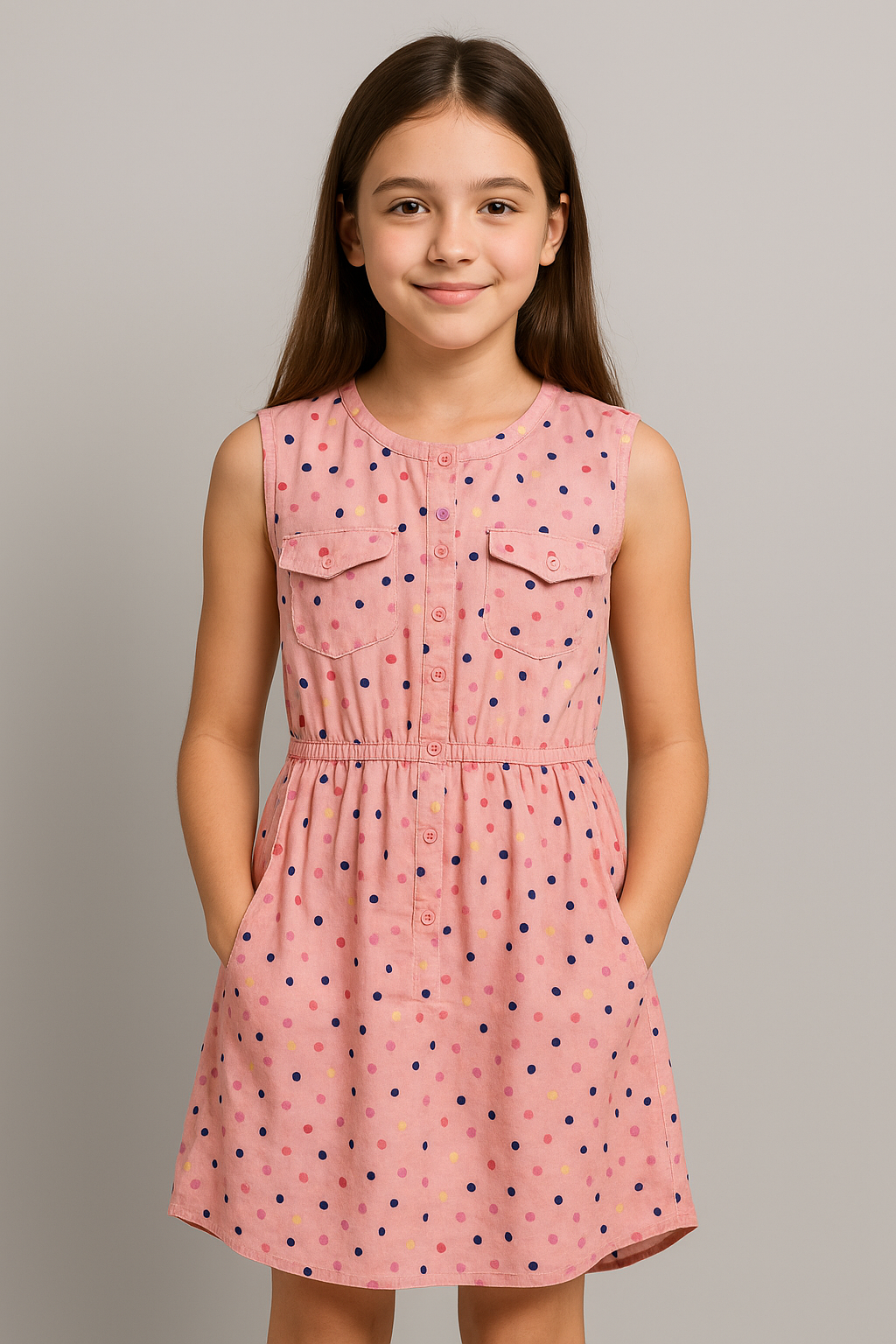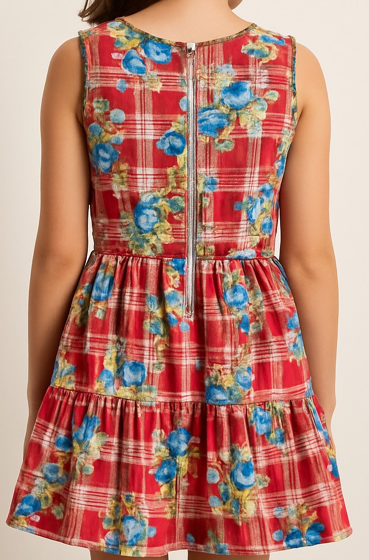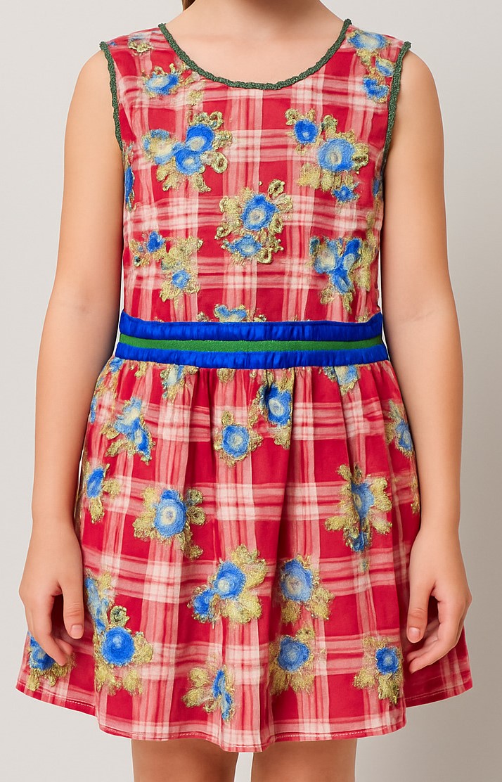 This charming sleeveless cotton dress for girls combines playful elegance with everyday comfort. Crafted from soft, breathable fabric, the dress features a vibrant red plaid base adorned with delicate multicolored floral embroidery in shades of blue, green, and yellow. A fitted bodice flows into a gently flared skirt with a gathered waist, accentuated by a bold blue and green ribbon belt for a touch of contrast. The back showcases a practical zip closure and tiered skirt layers for added volume. Perfect for casual outings, festive occasions, or summer playdates.