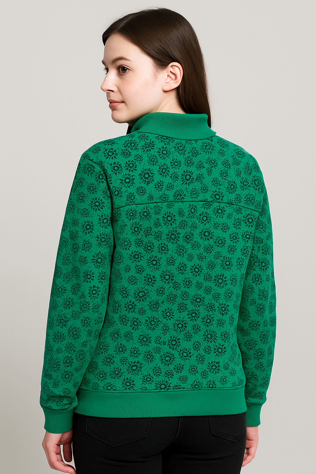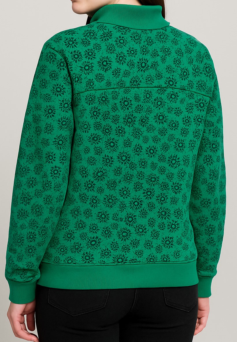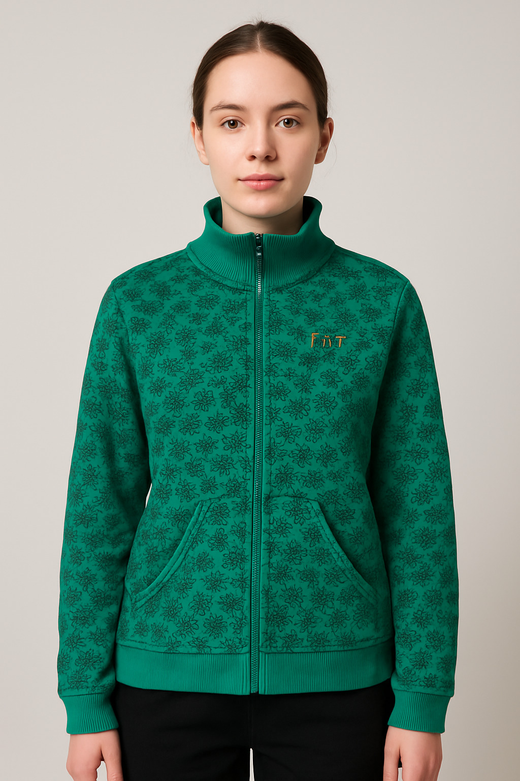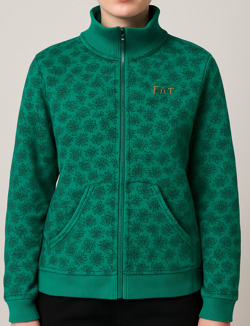 Stay warm and stylish with this emerald green fleece jacket featuring an all-over black floral print. Designed with a high ribbed collar, front zip closure, and kangaroo pockets, this jacket offers both functionality and flair. The snug cuffs and hemline ensure a secure fit, while the embroidered “FIT” branding on the chest adds a sporty touch. Perfect for casual outings or cool-weather layering.