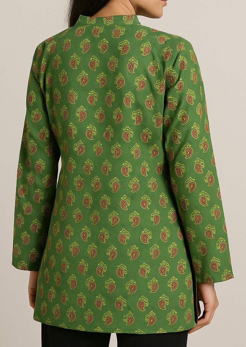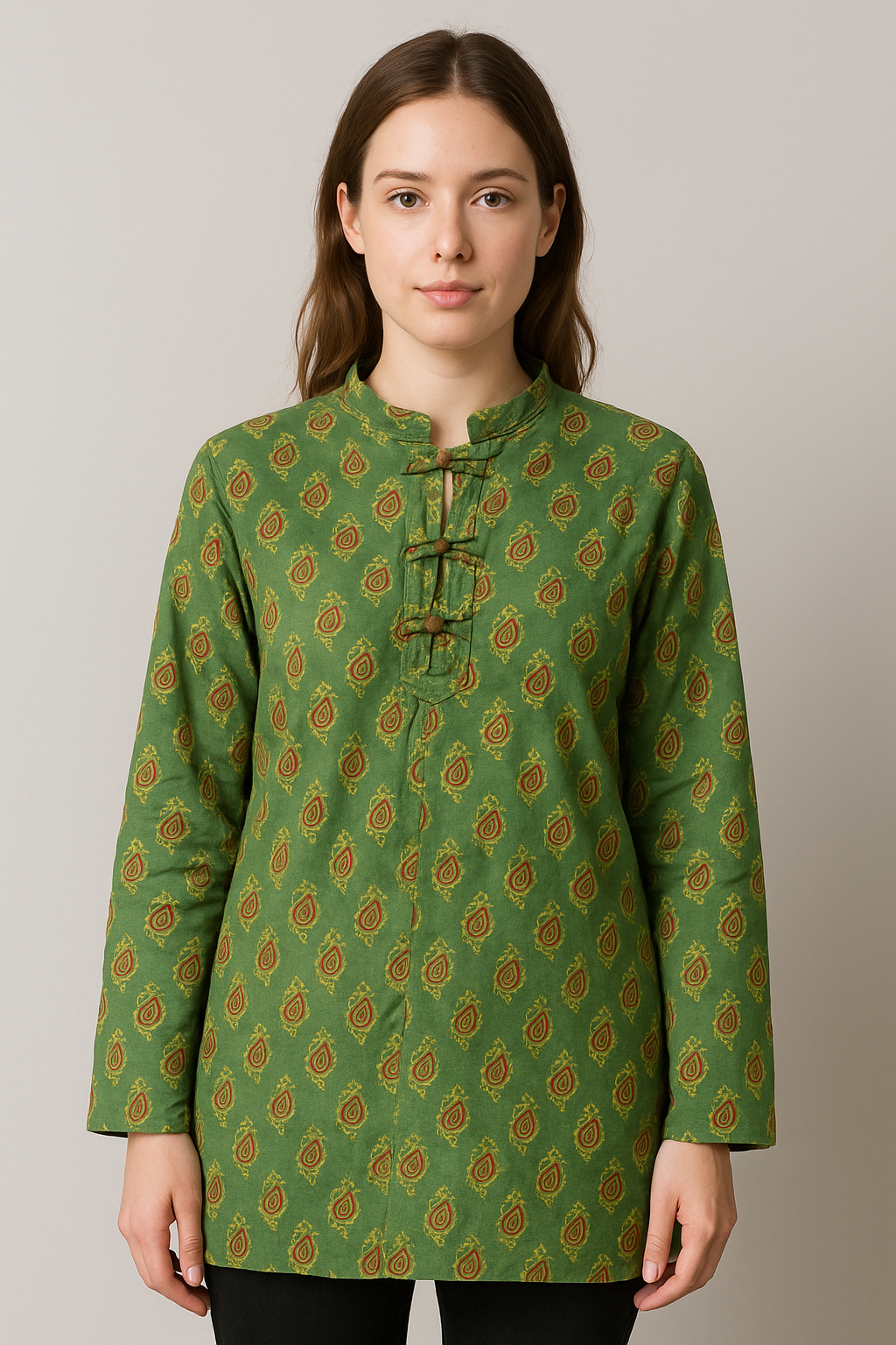 Elevate your ethnic wardrobe with this elegant green handblock printed kurti featuring a timeless paisley motif. Crafted from soft cotton fabric, it comes with a mandarin collar and front loop-button detailing for a traditional yet contemporary look. The straight-cut silhouette, full sleeves, and mid-thigh length make it perfect for casual as well as semi-formal wear. Pair it with leggings or straight pants for effortless styling.