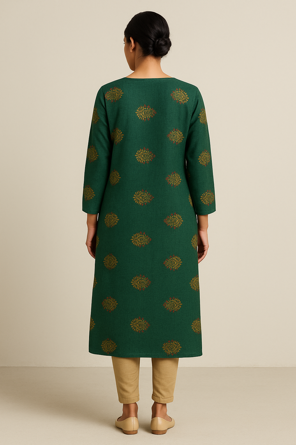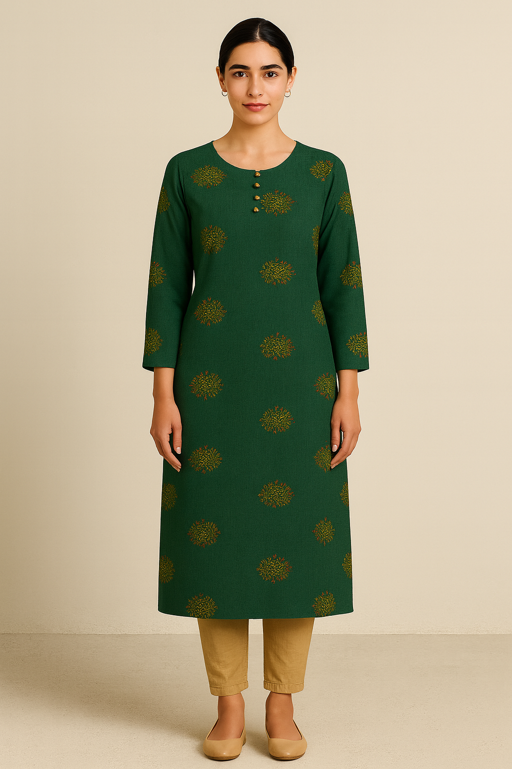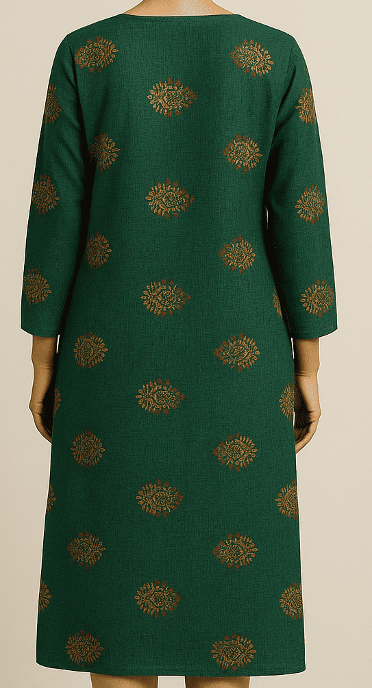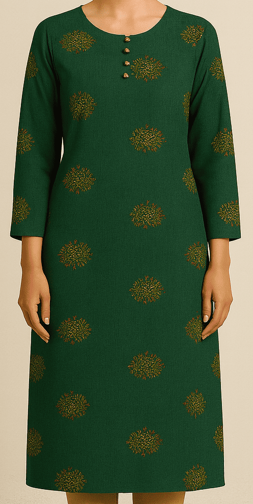 Add a touch of traditional elegance to your wardrobe with this deep green straight kurta featuring intricate all-over ethnic motif prints in muted gold tones. Designed with a round neckline and accented by four wooden-look buttons, this kurta offers both charm and comfort. The straight silhouette with three-quarter sleeves and side slits makes it a versatile choice for everyday wear or light festive occasions. Pair it with beige or gold-tone bottoms for a complete look.