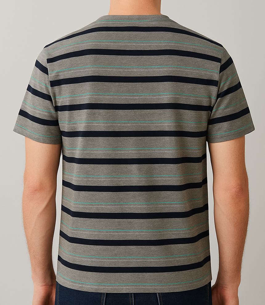 Step into effortless casual style with this men’s olive grey striped crew neck t-shirt. Crafted from soft, breathable cotton-blend fabric, the t-shirt features horizontal stripes in deep navy and subtle mint green over an olive grey base. The crew neckline and short sleeves ensure everyday comfort and versatility. Perfectly tailored with a structured shoulder and sleek straight hem, this tee pairs well with jeans or chinos for a polished off-duty look.