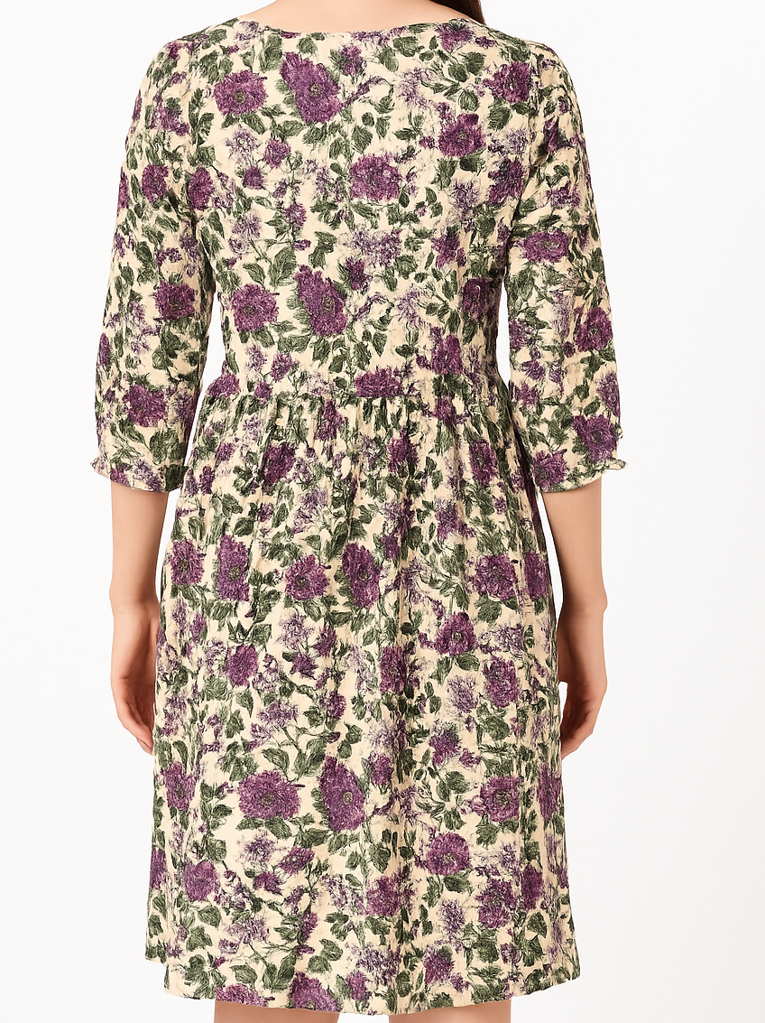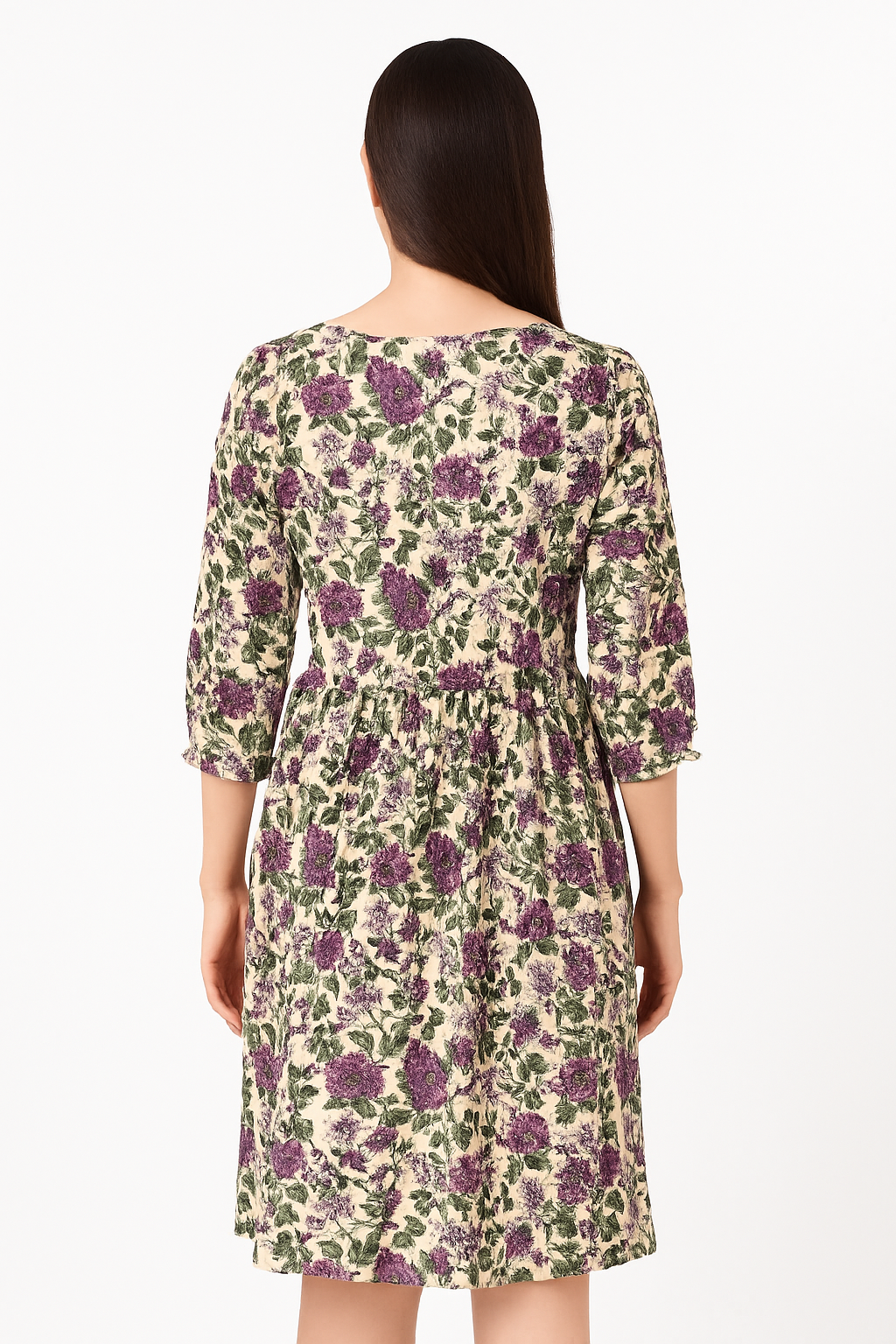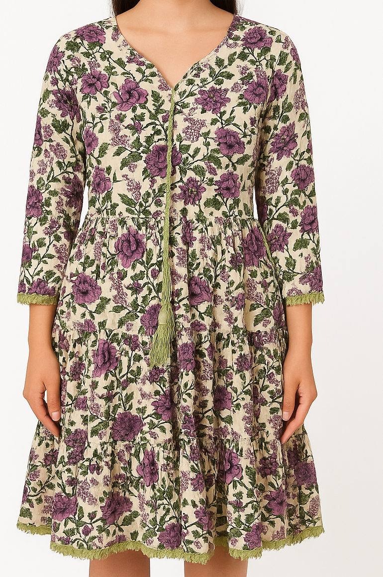 Add a fresh floral flair to your wardrobe with this Ivory Floral Tiered Dress for women. Crafted in a soft ivory base with all-over purple and green floral prints, this dress features a flattering tiered silhouette with 3/4 sleeves and delicate green lace trims. A front tassel tie-up adds charm to the notch neckline, making it perfect for casual outings or weekend wear.
