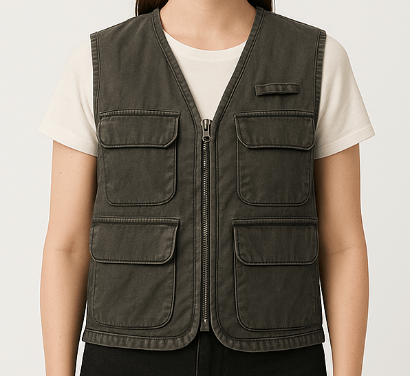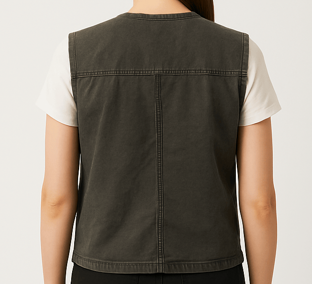 This rugged dark grey utility vest for women is crafted from slightly crinkled cotton fabric, offering both style and function. Featuring a front zip closure, four spacious flap pockets with visible stitching, and a loop detail on the chest, it’s designed for everyday utility. The sleeveless cut with reinforced shoulders and clean back seam gives it a structured, modern silhouette perfect for layering.