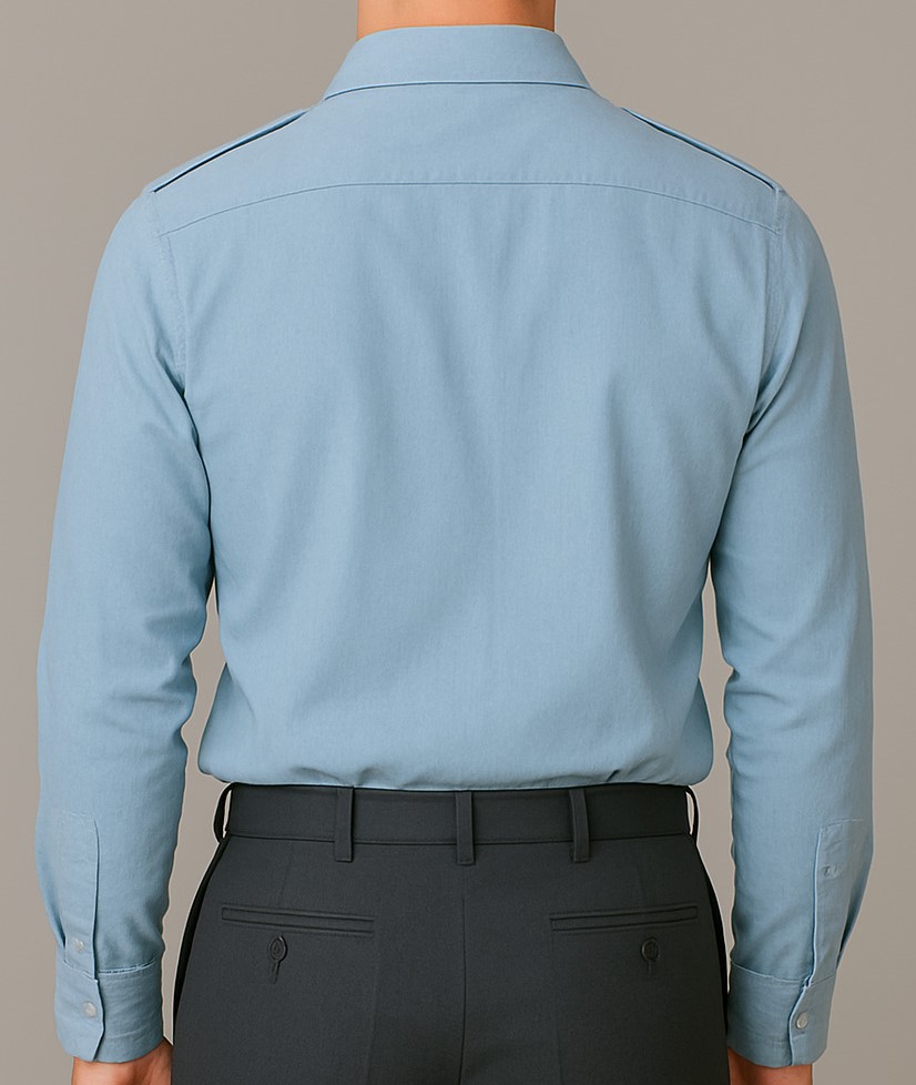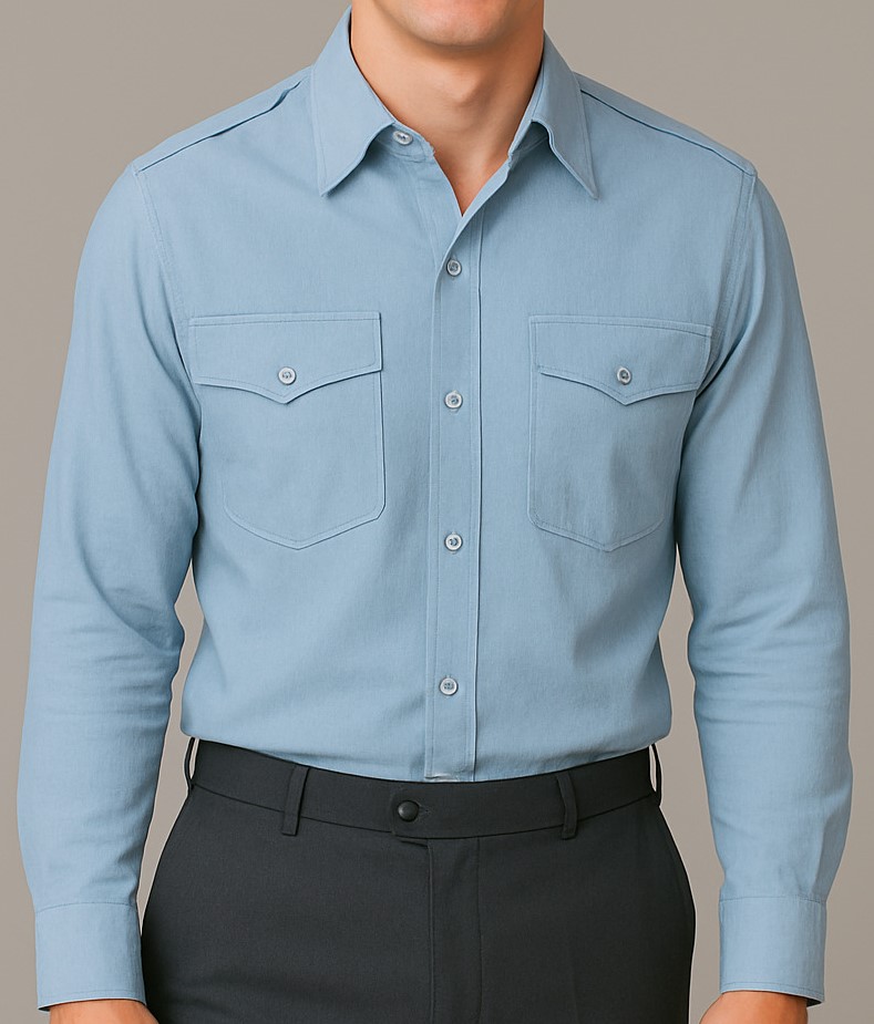 A stylish men’s light blue long-sleeve shirt designed for both formal and semi-formal occasions. Crafted from smooth cotton fabric, it features a pointed collar, button-down front, and two symmetrical flap chest pockets with button closures. The shirt includes shoulder epaulets for added structure and design detail. Its tailored fit and clean stitching offer a smart, polished look, while the soft fabric ensures all-day comfort.