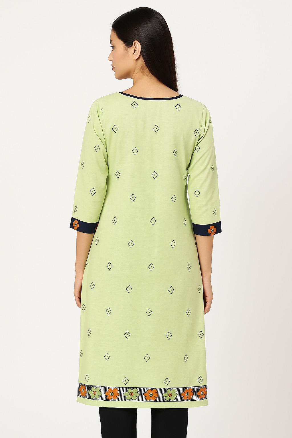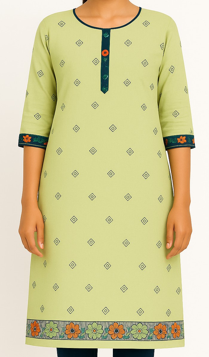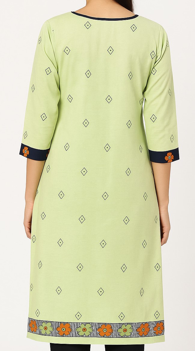 This elegant light green straight kurti is designed with a subtle all-over diamond print, complemented by a contrasting navy placket with a single button. The sleeves feature a navy floral border, adding a stylish touch. The hemline is highlighted with a floral printed border in orange and green tones, enhancing the overall charm. Made from breathable fabric, this kurti is perfect for daily wear and casual outings, offering comfort with a modern ethnic appeal.