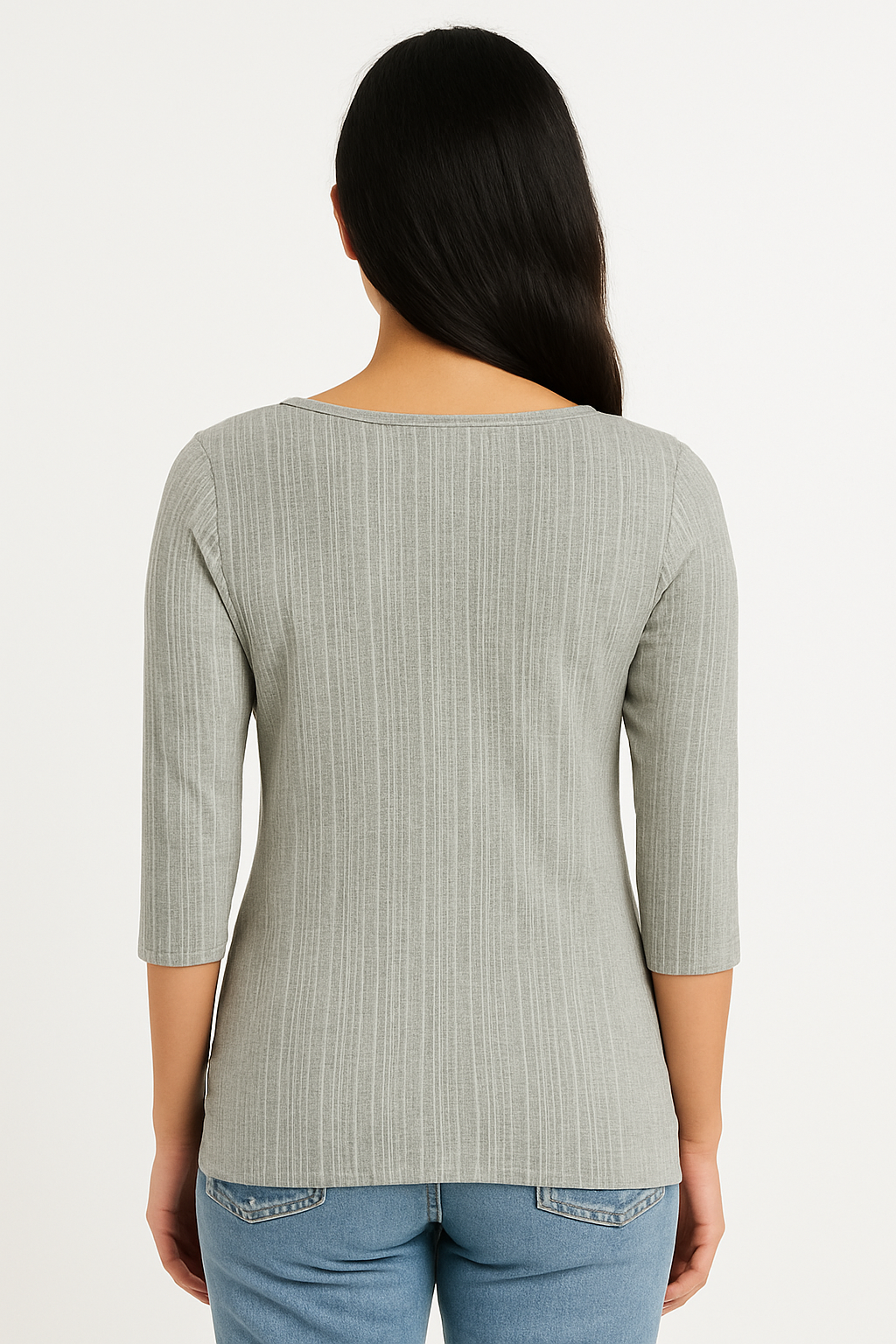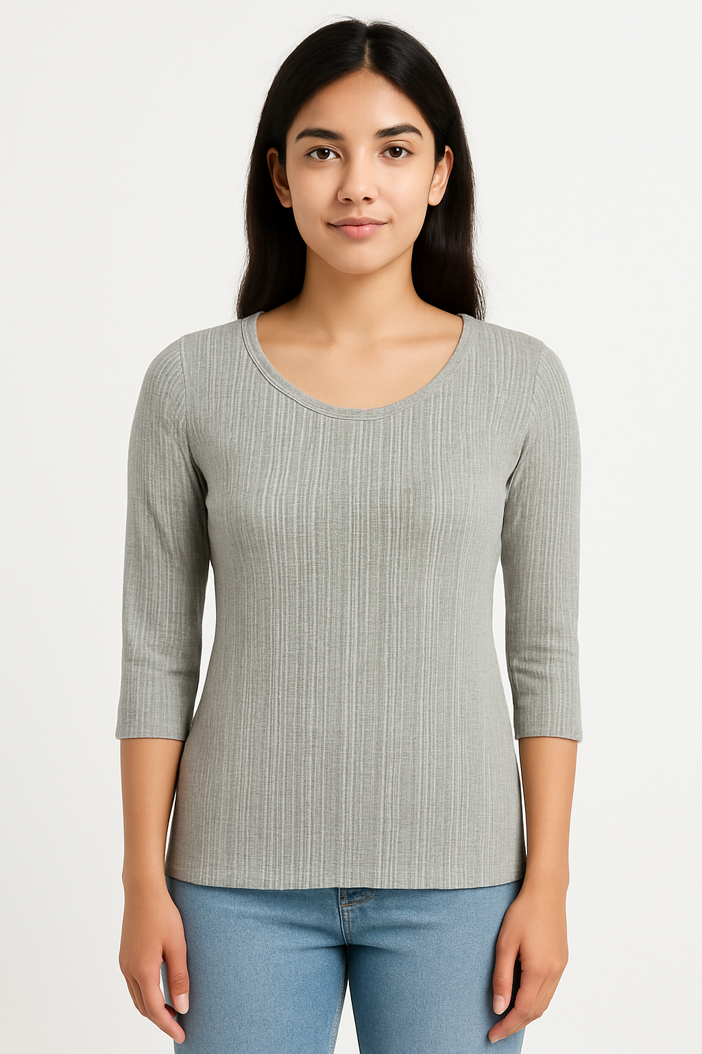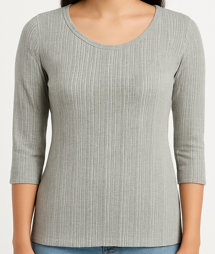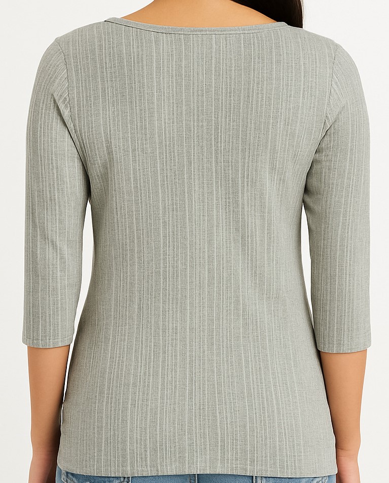 Stay effortlessly stylish and comfortable in this ribbed light grey top for women. Crafted from a stretchable and breathable fabric, this top features a subtle vertical ribbed pattern, a classic round neckline, and three-quarter sleeves. Its slim-fit silhouette flatters your shape while ensuring ease of movement. Pair it with jeans or skirts for a casual yet chic everyday look.