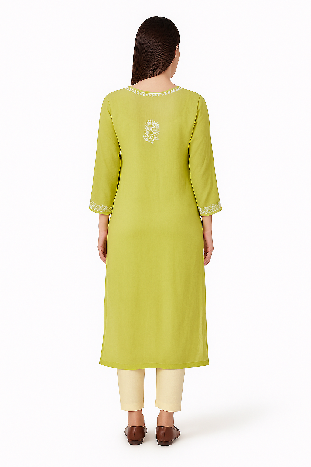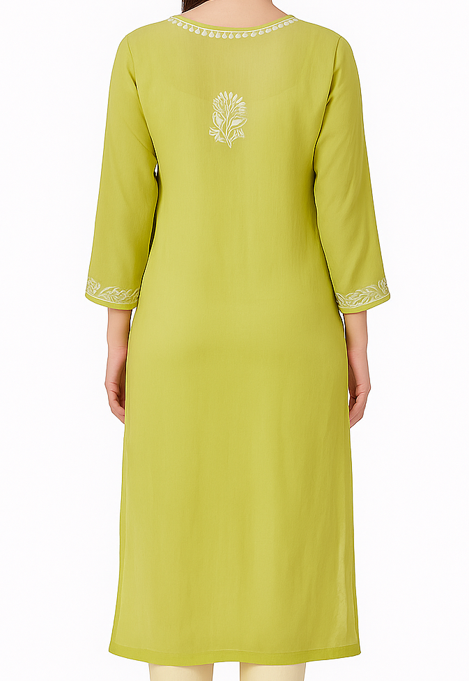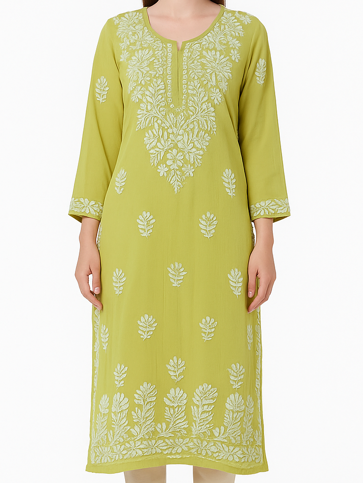 Elevate your ethnic wardrobe with this elegant Lime Green Embroidered Kurta for women. Crafted from a breathable, soft fabric, this kurta features intricate white floral embroidery across the front and borders, with delicate detailing on the sleeves and neckline. The straight-cut silhouette provides a timeless and flattering fit.