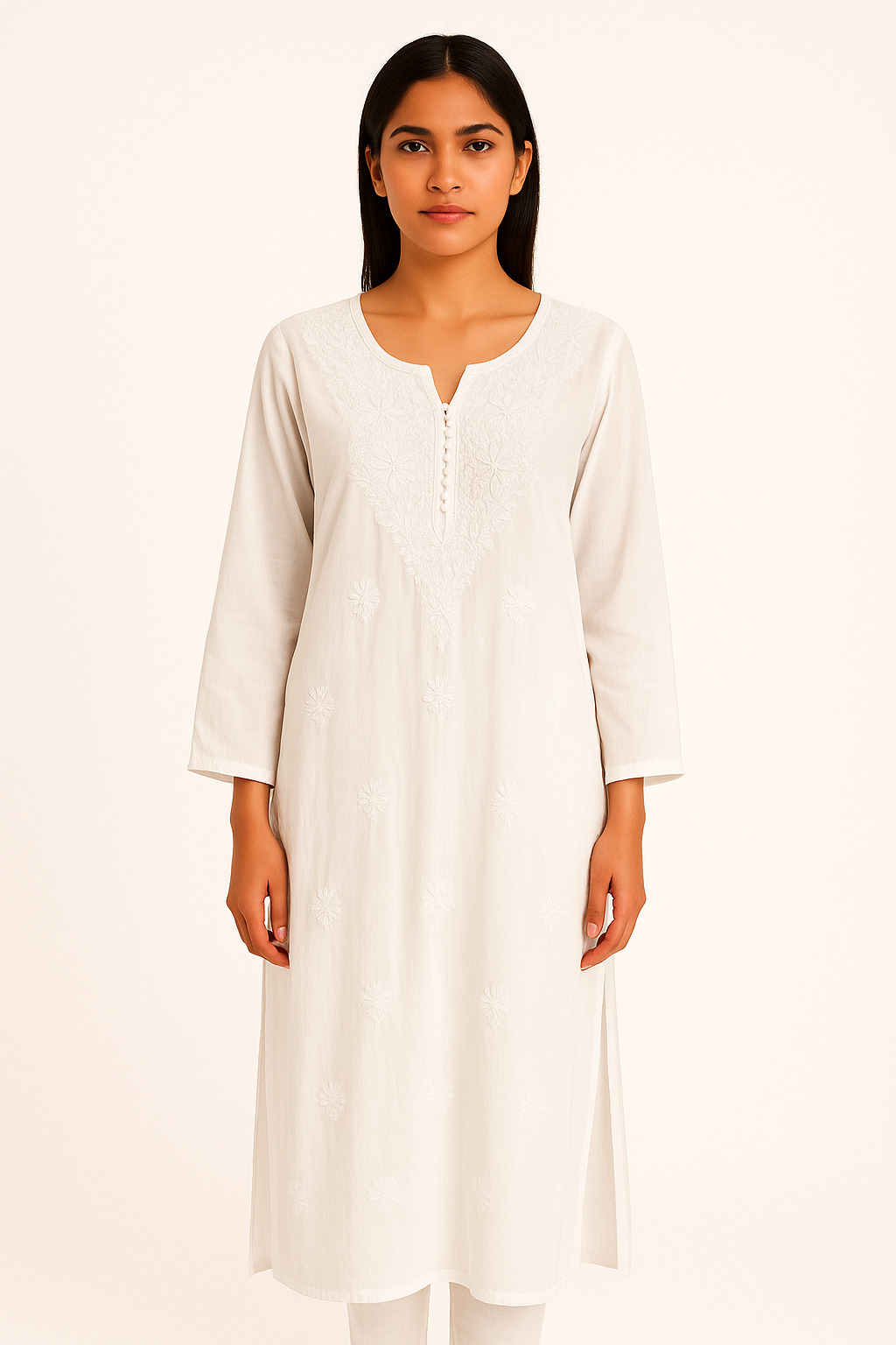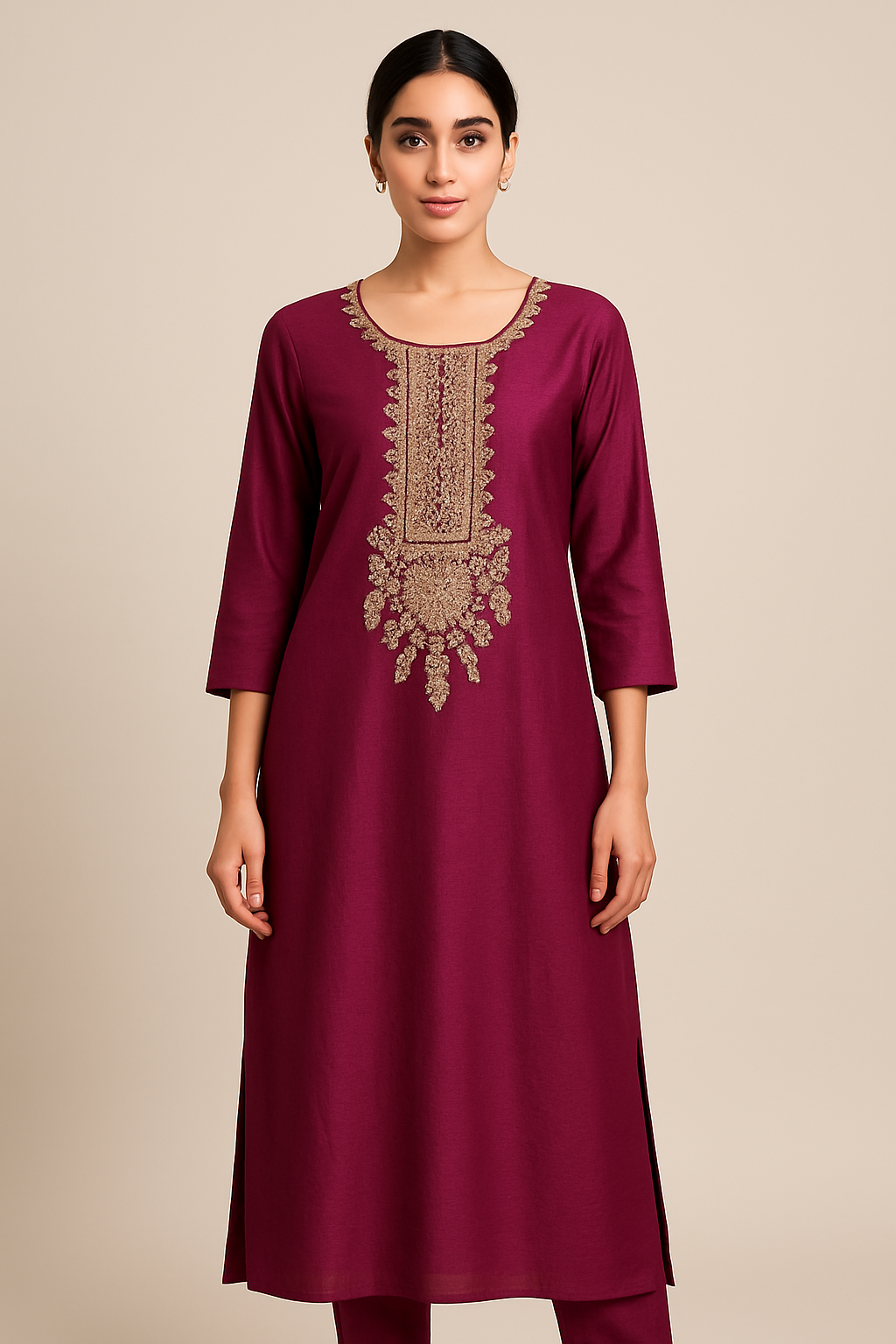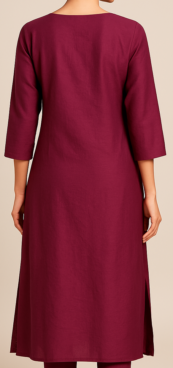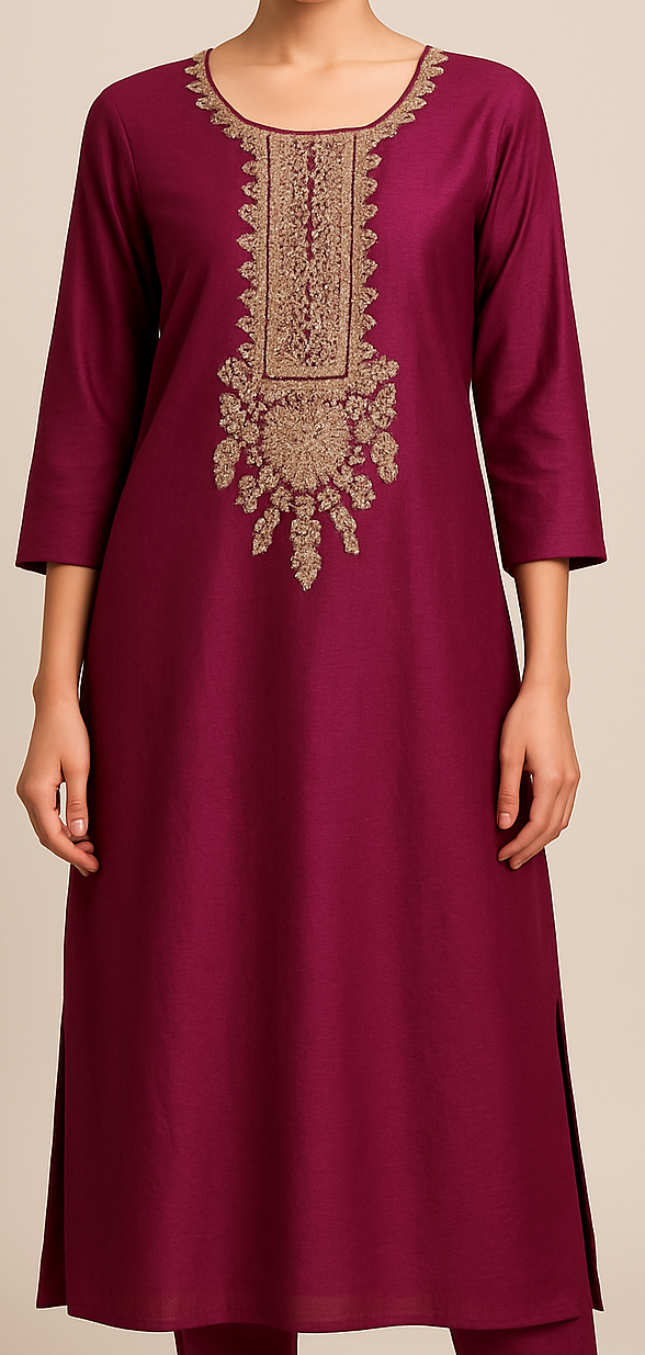 Elevate your ethnic wardrobe with this elegant magenta straight kurta crafted in a soft, breathable fabric. The front is beautifully adorned with intricate golden thread embroidery forming a vertical floral motif extending from the neckline to mid-bust, adding a rich and traditional touch. Designed with a wide scoop neckline and 3/4th sleeves, it offers both style and comfort. The plain back, clean silhouette, and side slits enhance its graceful appeal—perfect for festive gatherings or elegant daywear.