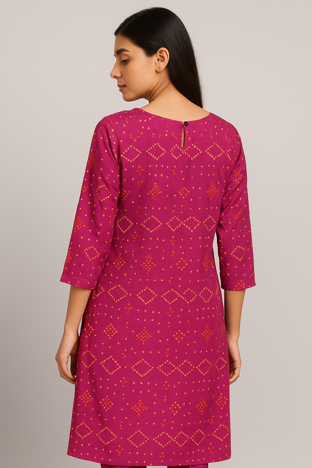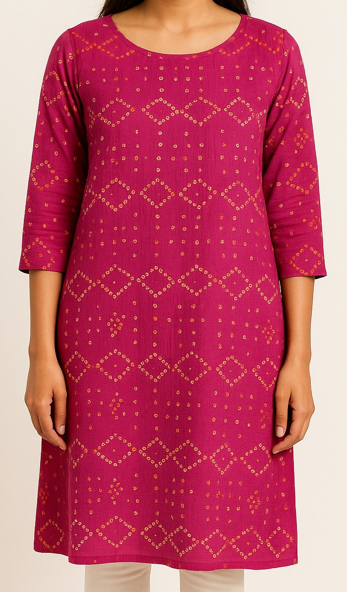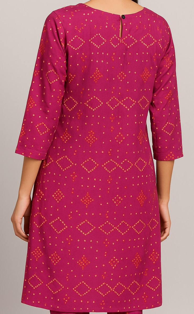 This magenta straight kurti blends traditional charm with modern comfort. Made from a soft, breathable fabric, it features a vibrant dotted geometric print in a bandhani-inspired pattern. The round neckline and 3/4 sleeves offer a timeless silhouette, while the button-loop closure at the back ensures a secure fit. Ideal for both casual and semi-formal occasions, pair it with leggings or palazzos for a versatile ethnic look.