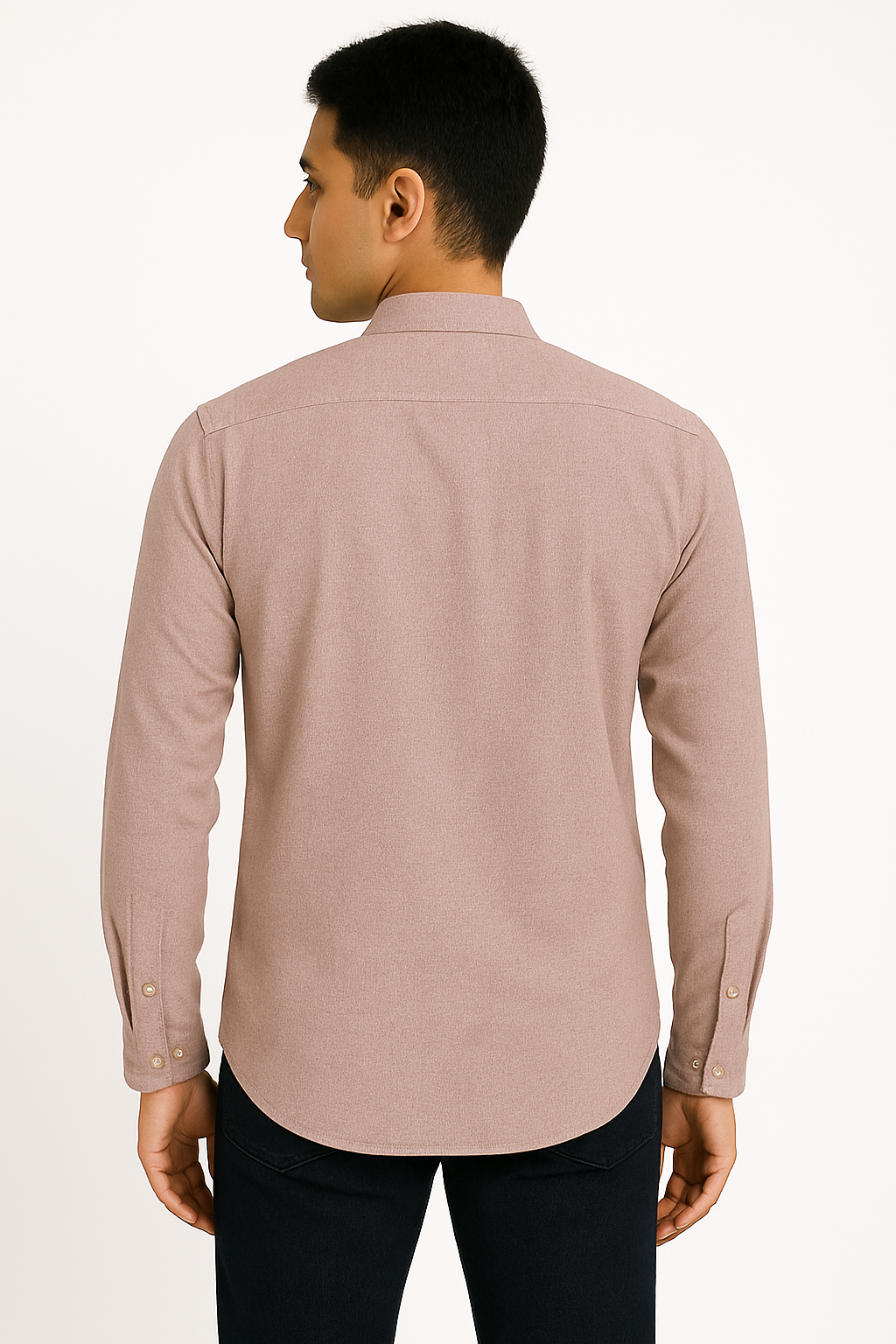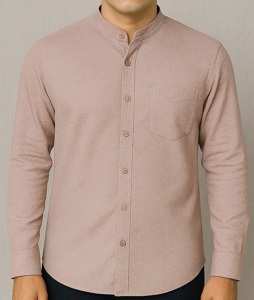 Upgrade your casual wardrobe with this stylish light mauve cotton shirt designed with a modern mandarin collar and single chest pocket. Made from soft, breathable cotton fabric, it features a full front button placket, long sleeves with buttoned cuffs, and a sleek curved hem. The shirt’s minimalist design and neutral tone make it a perfect fit for both everyday wear and semi-formal occasions.