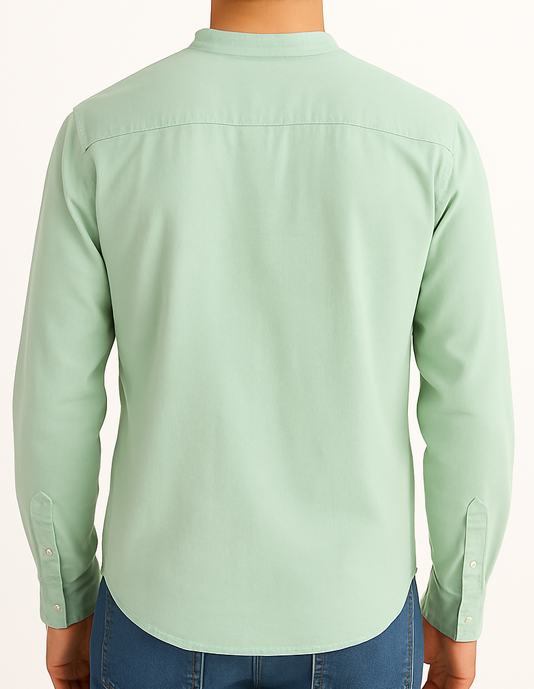 This men’s long-sleeve shirt comes in a fresh mint green shade and features a sleek mandarin collar for a modern touch. Made from breathable cotton fabric, the shirt includes a front chest pocket, full button placket, and buttoned cuffs. Its clean, minimal design makes it perfect for smart casual or semi-formal occasions. The relaxed fit ensures comfort without compromising on style.