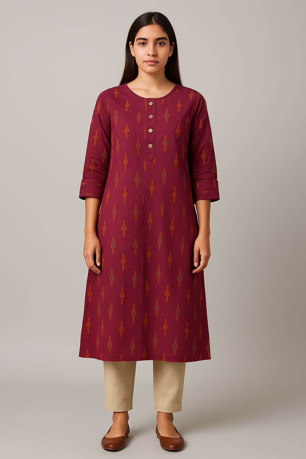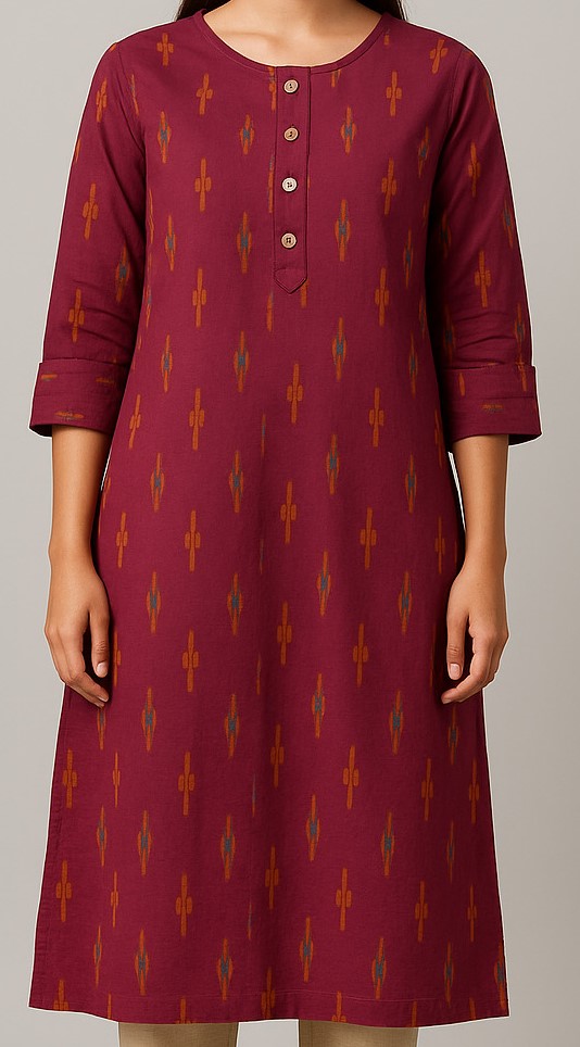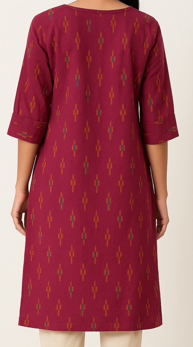 Infuse your everyday ethnic wardrobe with subtle elegance through this maroon straight-fit kurti crafted from breathable cotton. Featuring an all-over Ikat-inspired print in earthy ochre and teal tones, it is designed with a round neckline and a short placket adorned with wooden-style buttons. The 3/4th sleeves come with a folded cuff design for a clean finish. Its simple silhouette and rich base make it a versatile pick for workwear or casual daytime outings. Pair it with beige trousers and minimal accessories for a polished ethnic look.
