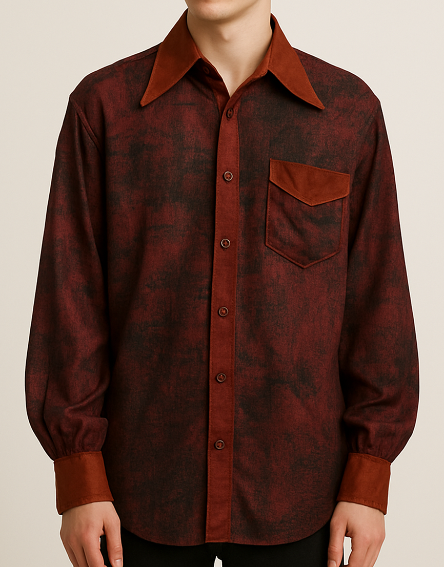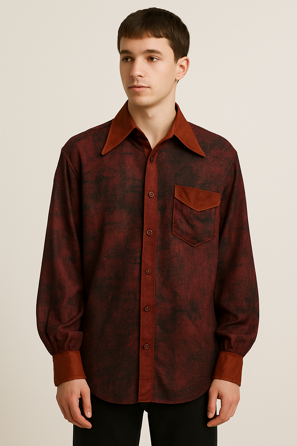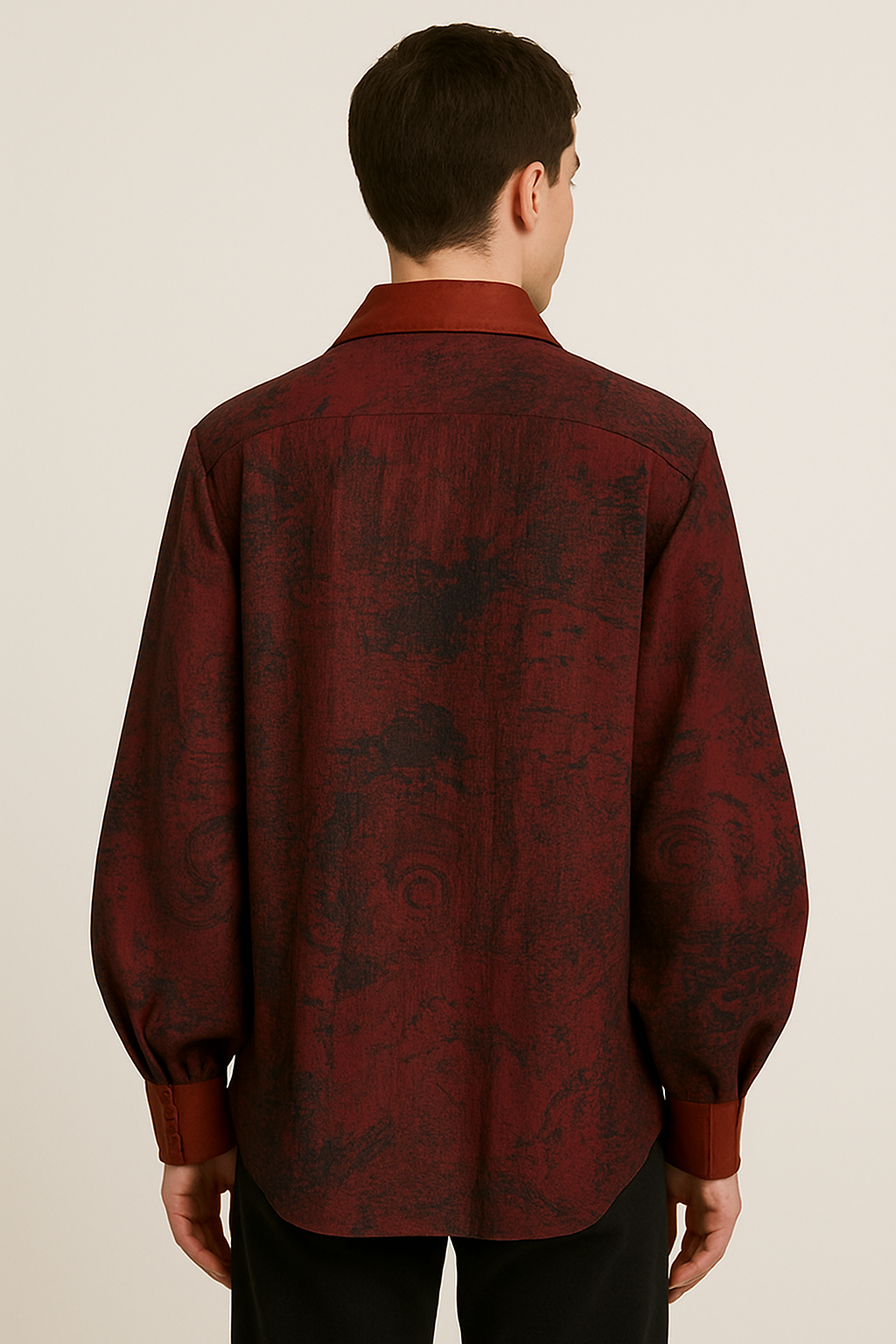 Elevate your wardrobe with this vintage-inspired maroon shirt featuring a unique black textured wash and contrast detailing. Designed with a sharp spread collar, button-down front, and a single angled chest pocket, this shirt is made from a comfortable woven fabric that drapes naturally. The bold brown contrast on the collar, placket, pocket flap, and cuffs adds a refined yet statement look. Ideal for semi-formal evenings or standout casual outings.