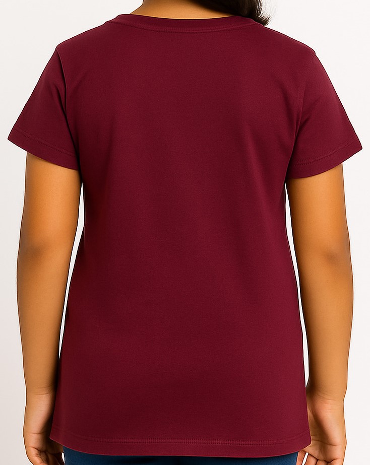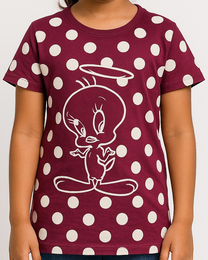 Let your little one flaunt her love for cartoons with this adorable maroon T-shirt featuring a playful Tweety print on a white polka-dotted base. Made from soft, breathable fabric, this short-sleeved crew-neck tee ensures comfort all day long. The solid maroon back adds a neat contrast to the animated front, making it both fun and stylish for everyday wear.