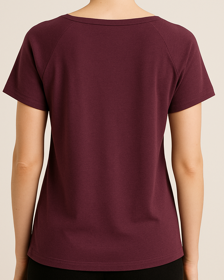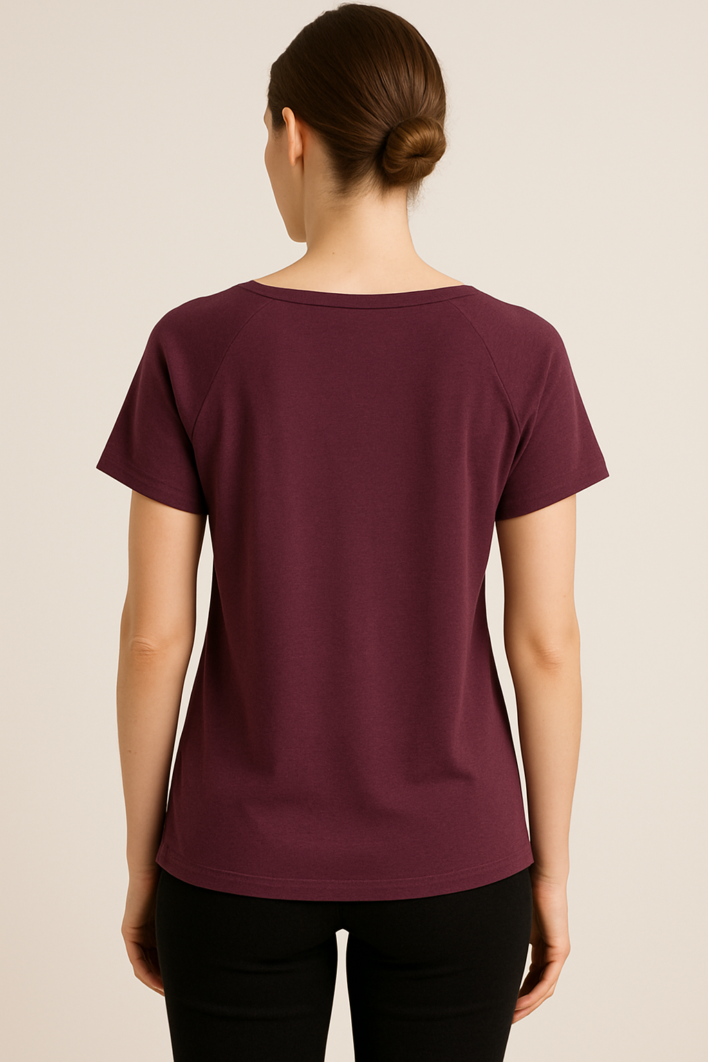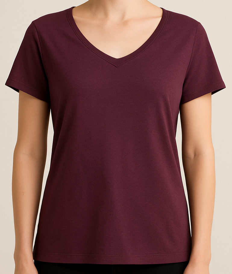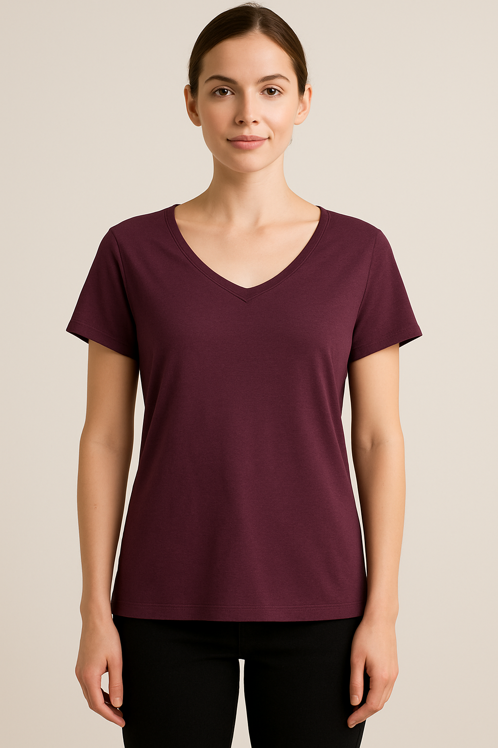 This women’s maroon V-neck T-shirt is made from a soft, breathable cotton blend fabric, ideal for everyday comfort and casual wear. Designed with a flattering V-shaped neckline and a relaxed silhouette, this tee offers a classic yet modern look. The short sleeves and smooth texture enhance ease of movement, making it a wardrobe essential. Pair it with jeans, leggings, or casual trousers for a laid-back yet polished outfit.