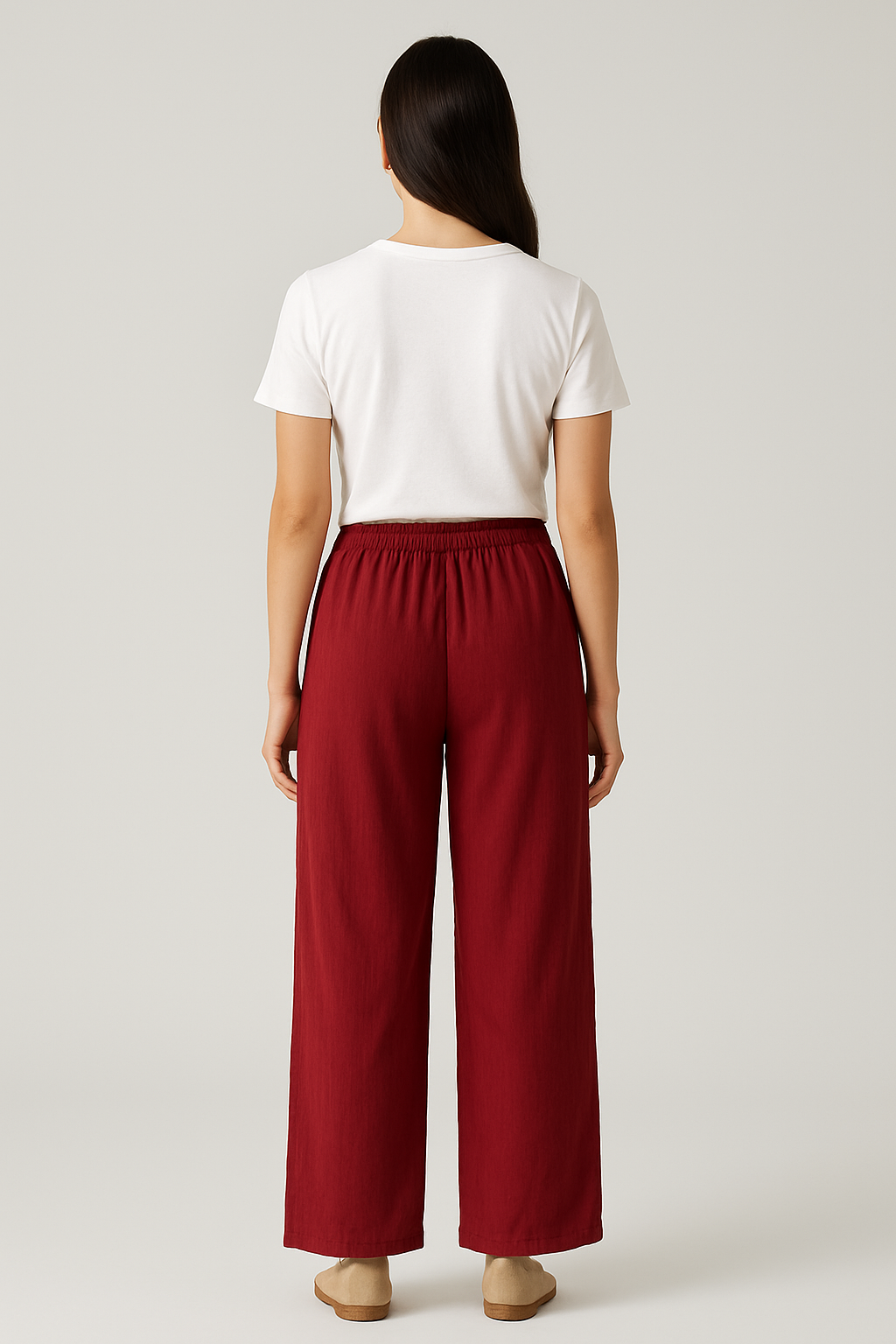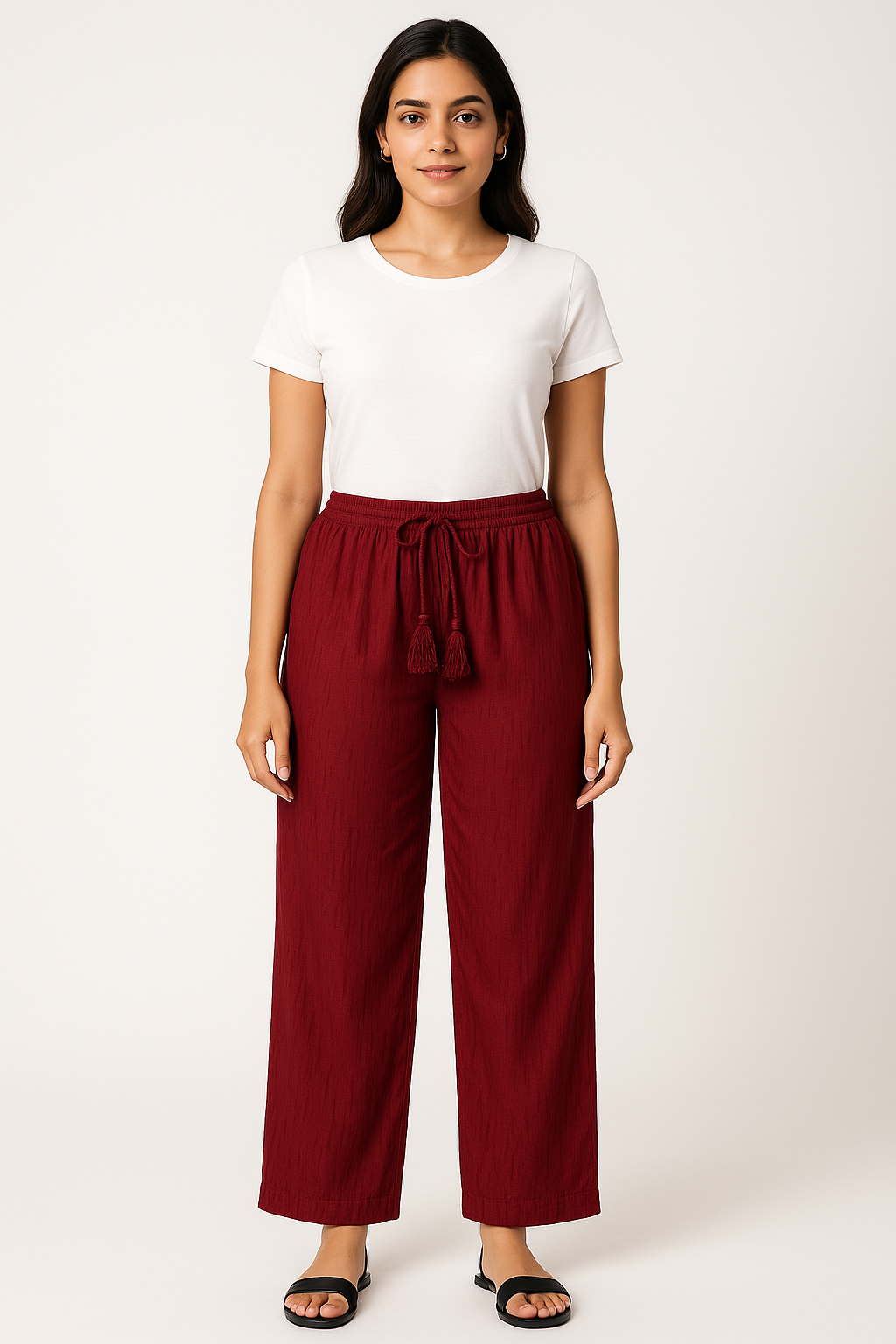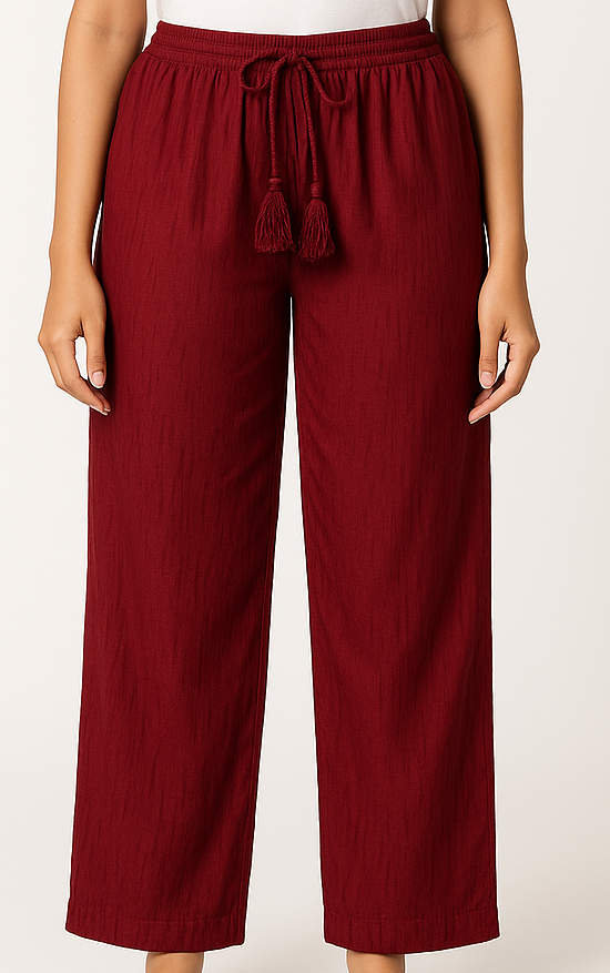 Stay effortlessly stylish and comfortable with these maroon wide-leg pants crafted from a soft, textured fabric. Featuring a mid-rise elastic waistband with tassel drawstring, these pants offer a relaxed fit through the hips and legs—perfect for casual outings, lounging, or pairing with simple tops for an elevated everyday look.