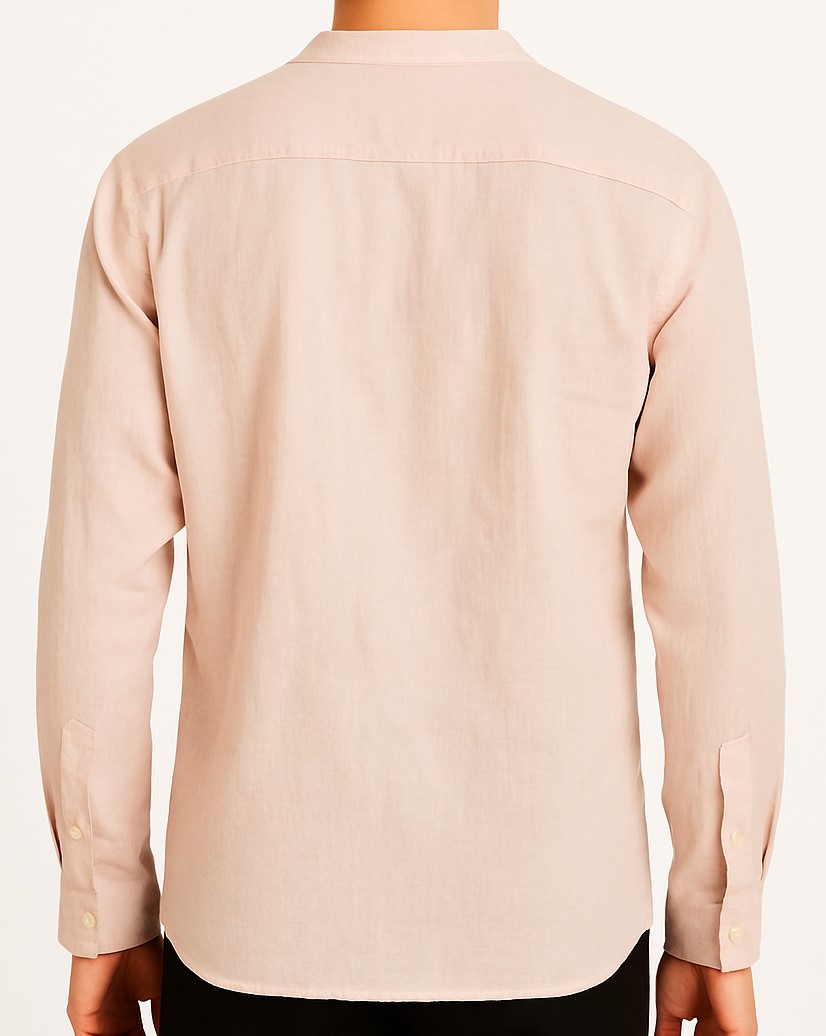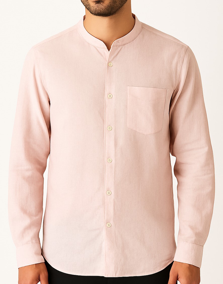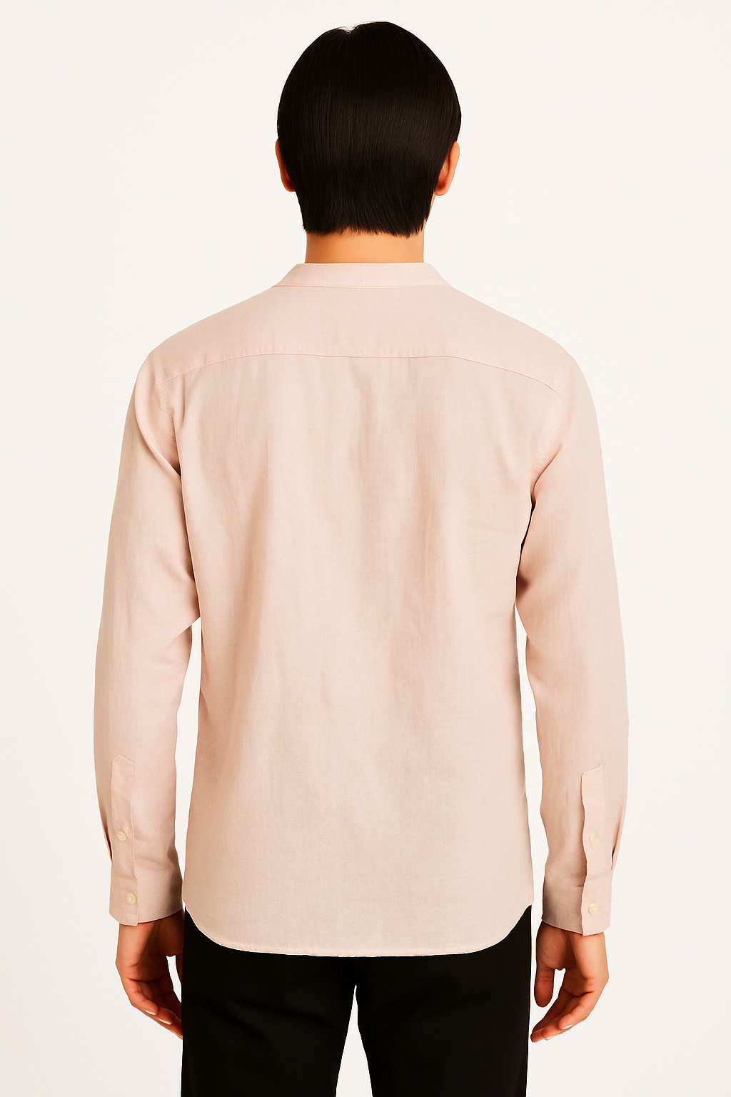 This men’s shirt in a subtle blush pink hue brings a refreshing modern twist to traditional style. Made from soft, breathable cotton, it features a classic mandarin collar, front button placket, and a single chest pocket for functional elegance. The long sleeves with buttoned cuffs and a straight, slightly curved hemline offer a clean silhouette ideal for both formal and semi-casual looks. Perfect for daywear or evening occasions, this shirt combines comfort and minimalism in every thread.