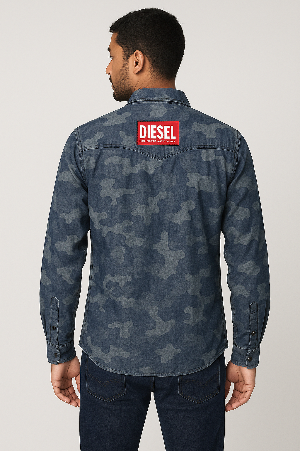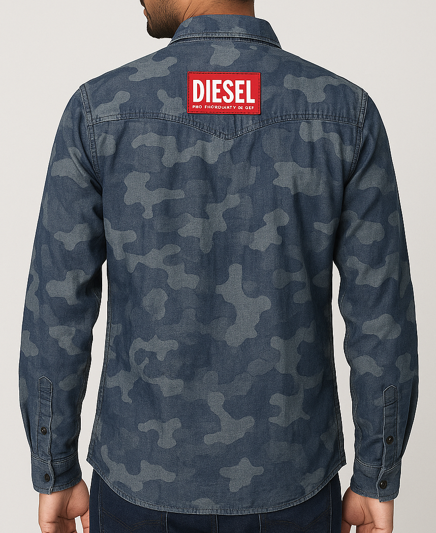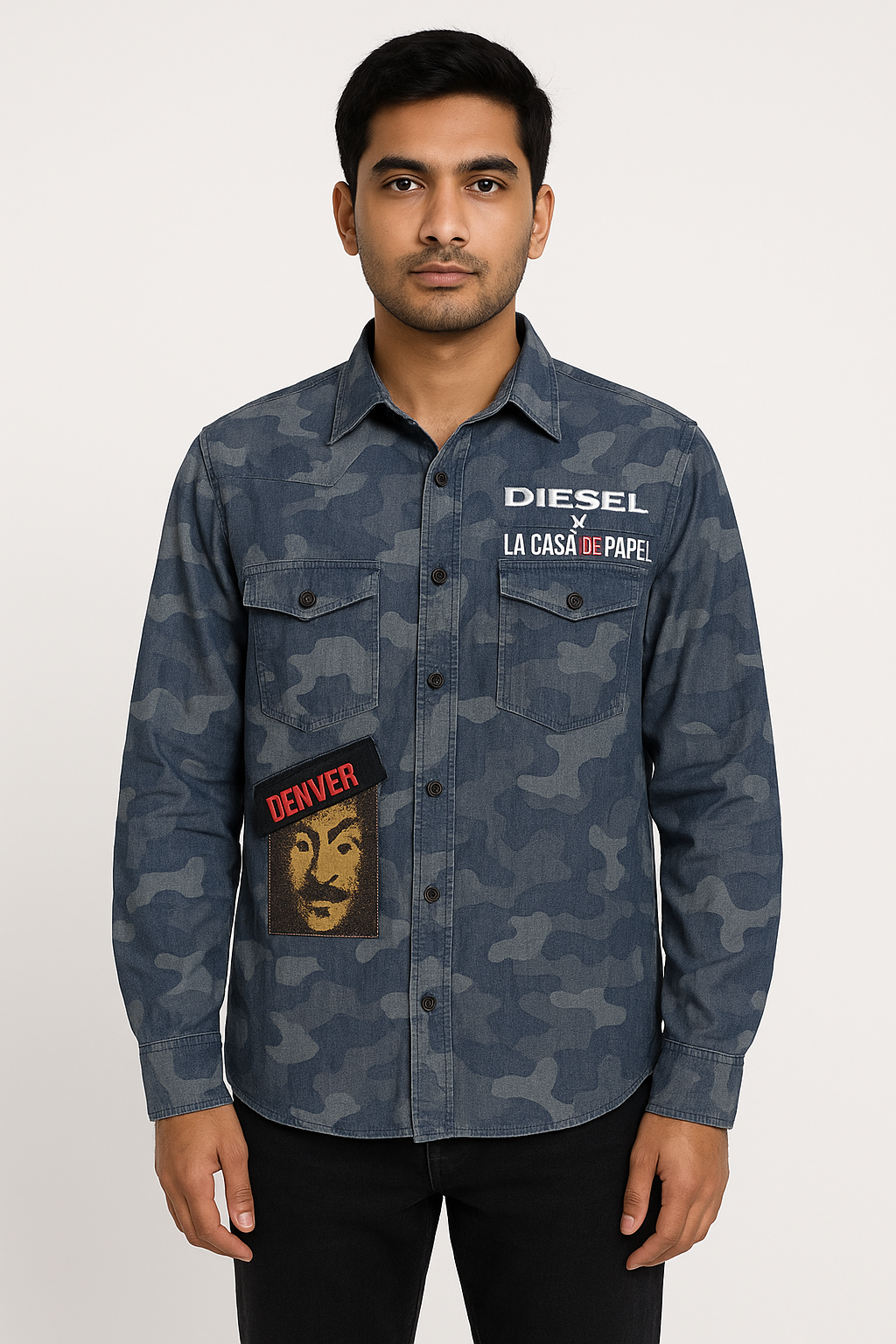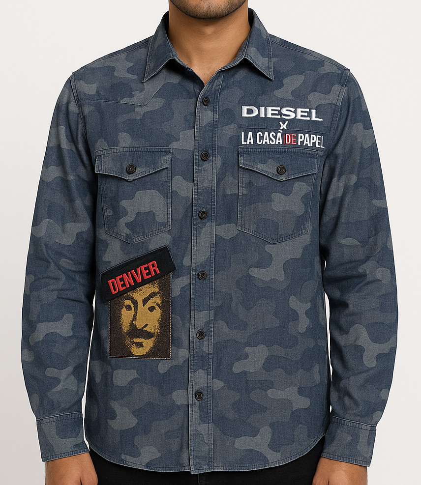 This Diesel La Casa De Papel Camouflage Denim Shirt blends streetwear edge with TV-series nostalgia. Crafted from premium denim in a muted blue camo print, it features bold embroidered and printed patches inspired by Netflix’s Money Heist, including the “DENVER” name tag and the iconic Salvador Dalí mask graphic. The front showcases dual flap chest pockets and branded “Diesel” and “La Casa De Papel” embroidery, while the back sports a striking red Diesel patch. Designed with long sleeves, a spread collar, and a button-up closure, this limited-edition shirt is perfect for fans and fashion enthusiasts alike.